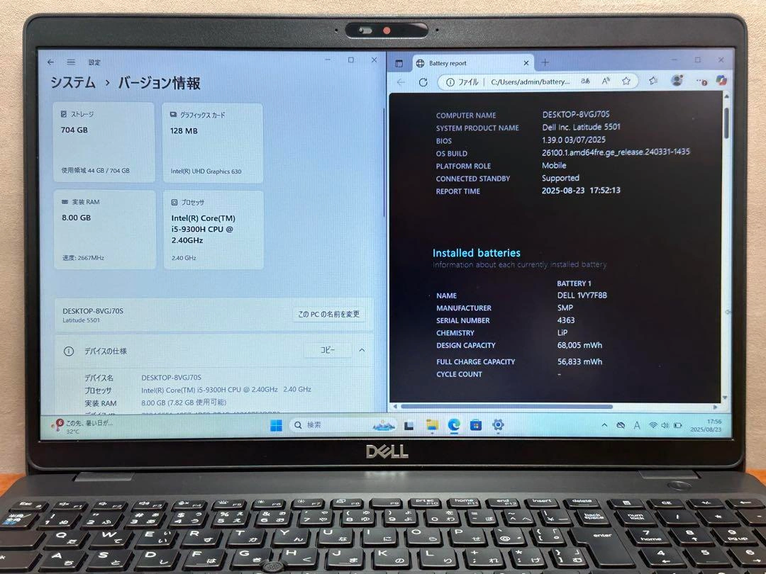 DELL Latitude 5501です。 ■スペック ・CPU: Core i5-9300H 2.4GHz, ターボブースト: 4.1GHz ・RAM: 8GB 2667MHz ・統合グラフィックス: Intel UHD Graphics 630 ・ストレージ: 256GB SSD M.2 PCIe 500GB HDD ・ディスプレイ: 15.6インチ ・Webカメラ搭載 ・WiFi, Bluetooth搭載 ・解像度: 1366x768 ・OS: Windows 11 Pro ・Office付 ■状態 ・起動確認済品 ・設定は全て完了しておりますので、すぐにご使用頂けます。 (本品は中古品なので、バッテリーの寿命は保証できません。ご理解の上でご購入下さい) ■外装・機能状態 【外装状態】BC : 並品(やや難あり): キズ多め、一部不具合あり。小さな凹みが見られる場合もあります。動作に問題なし。 【液晶状態】A : 綺麗な状態。ドット抜けはなく、微細なキズがある場合がありますが、目立たず使用に支障はありません。 【機能状態】A : 機能良好。基本動作はすべて正常。軽微な経年劣化: バッテリー消耗程度あり。 ・中古品かつ個人での検品のため、外観の状態につきましては主観的な判断や見落としがある場合がございます。予めご了承ください。 ・ご入札前に商品の状態を写真でご確認ください。 ■付属品 本体、ACアダプタ、電源コード ■保証期間: ・初期不良の場合、到着後2週間以内にご連絡ください。 ・C、D、 Jランクのものは一律保証無し商品となりますのでよくご確認ください。 ・不明点がございましたら、ご購入の前にご質問をお願い致します。 ご検討よろしくお願いいたします。