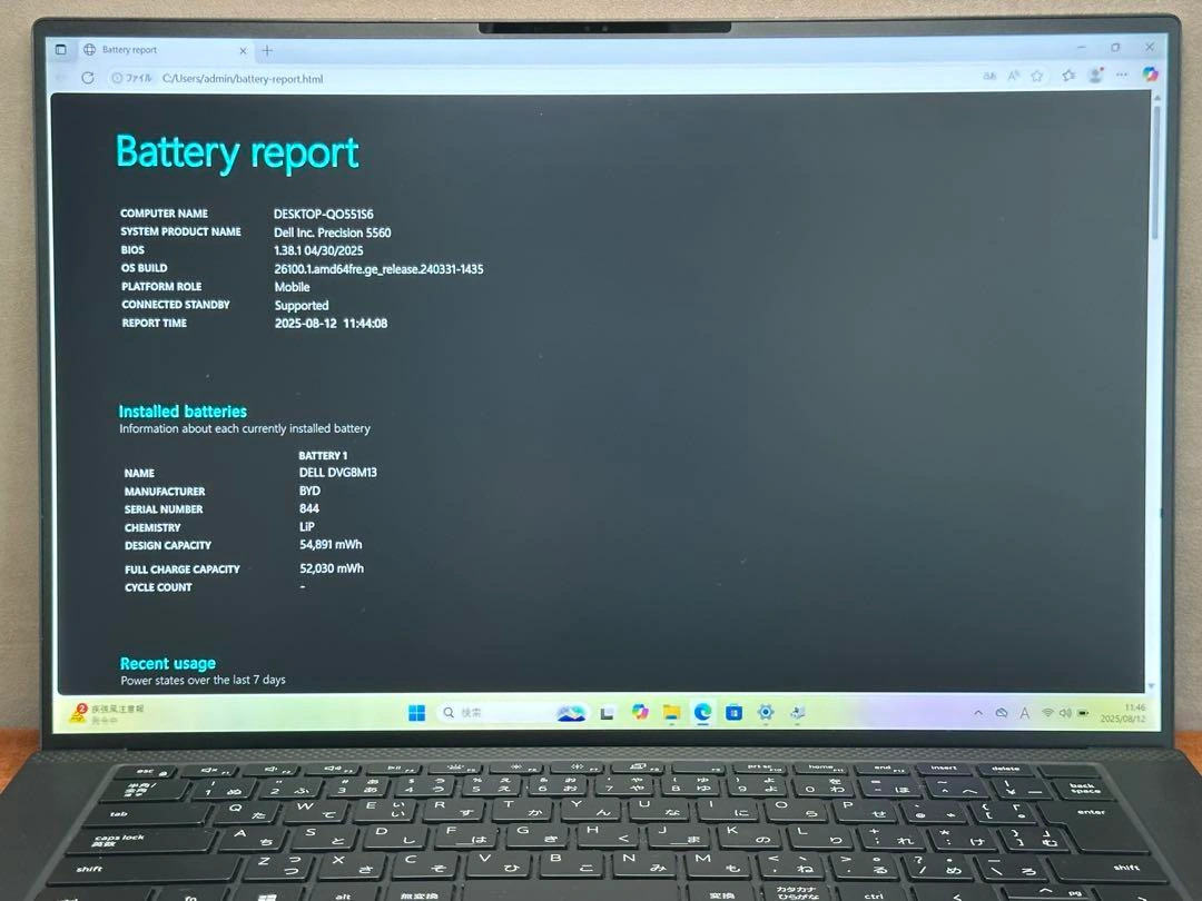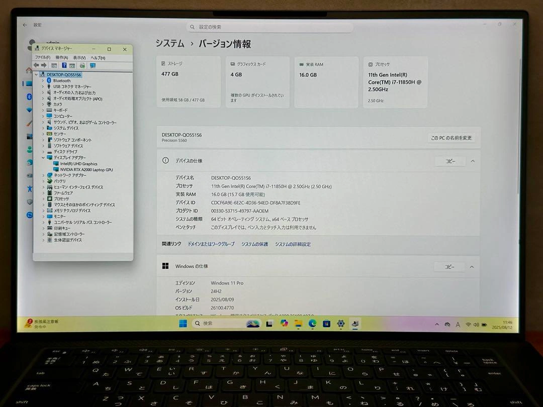 DELL Precision 5560です。 ■スペック ・CPU: Core i7-11850H 2.5GHz, ターボブースト: 4.8GHz ・RAM: 16GB 3200MHz ・統合グラフィックス: Intel UHD Graphics ・NVIDIA GeForce RTX A2000 4GB ・ストレージ: 512GB SSD M.2 PCIe ・ディスプレイ: 15.6インチ ・指紋認証 ・顔認証 ・Webカメラ搭載 ・WiFi, Bluetooth搭載 ・解像度: 1920x1200 ・OS: Windows 11 Pro ・Office付 ■状態 ・起動確認済品です。 ・設定は全て完了しておりますので、すぐにご使用頂けます(中古品なので、バッテリーの寿命は保証できません。ご理解の上ご購入下さい)。 ■外装・機能状態 【外装状態】AB : だいたい綺麗(良品): 軽い使用感ありだが、全体的に綺麗 【液晶状態】B : 微細なキズ、薄いシミなどが見られる場合がありますが、通常使用には問題ありません。 【機能状態】A : 機能良好。基本動作はすべて正常。軽微な経年劣化: バッテリー消耗程度あり。 ・中古品かつ個人での検品のため、外観の状態につきましては主観的な判断や見落としがある場合がございます。予めご了承ください。 ・商品の状態を写真でご確認ください。 ■付属品 本体、ACアダプタ、電源コード ■保証期間: ・初期不良の場合、到着後1ヶ月以内にご連絡ください。 ・C、D、 Jランクのものは一律保証無し商品となりますのでよくご確認ください。 ・不明点がございましたら、ご購入の前にご質問をお願い致します。 ご検討よろしくお願いいたします。