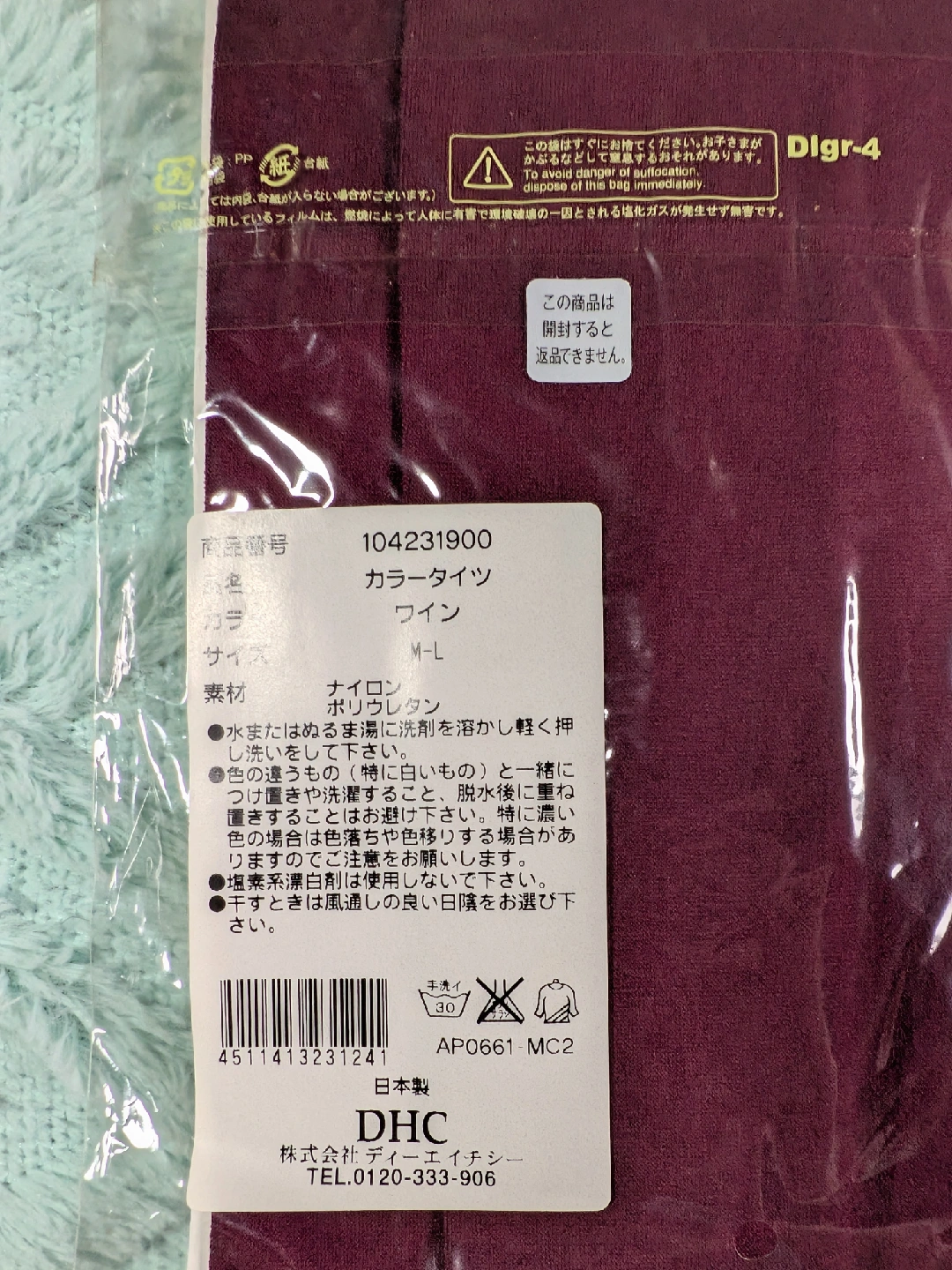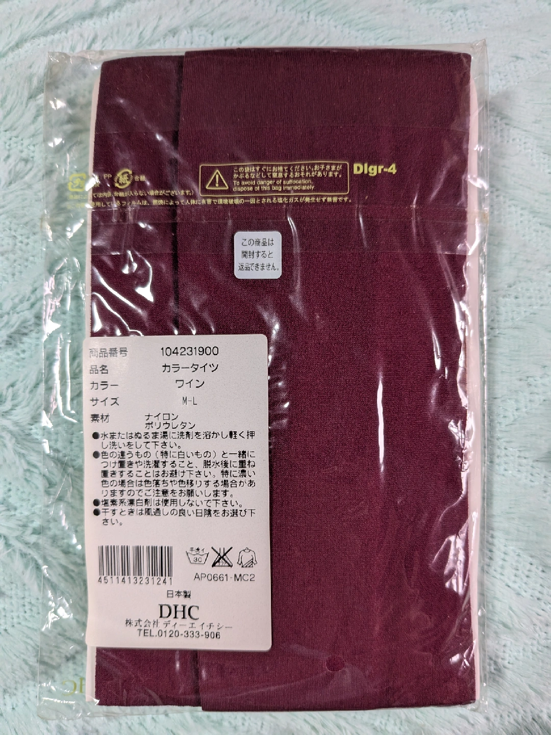 DHCのカラータイツです 【情報】 ブランド:DHC 商品番号:104231900 品名:カラータイツ カラー:ワイン サイズ:M-L 素材:ナイロン、ポリウレタン 中古品であることご了承ください 黒に飽きたら…ワインカラー 暖かいですよ…おっしゃれ~
