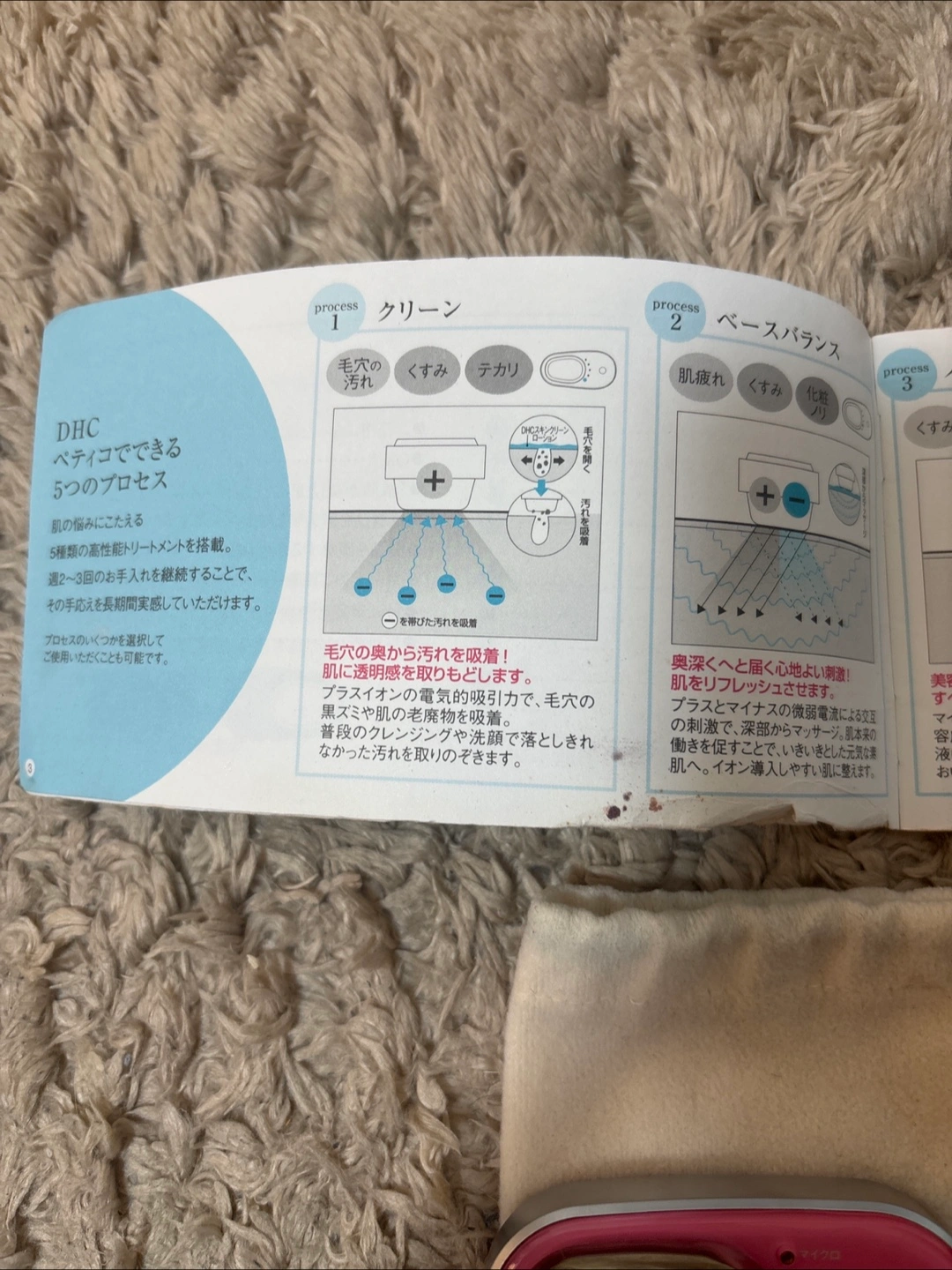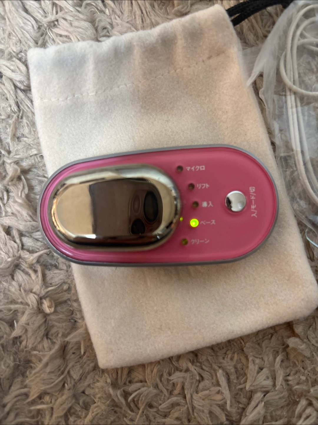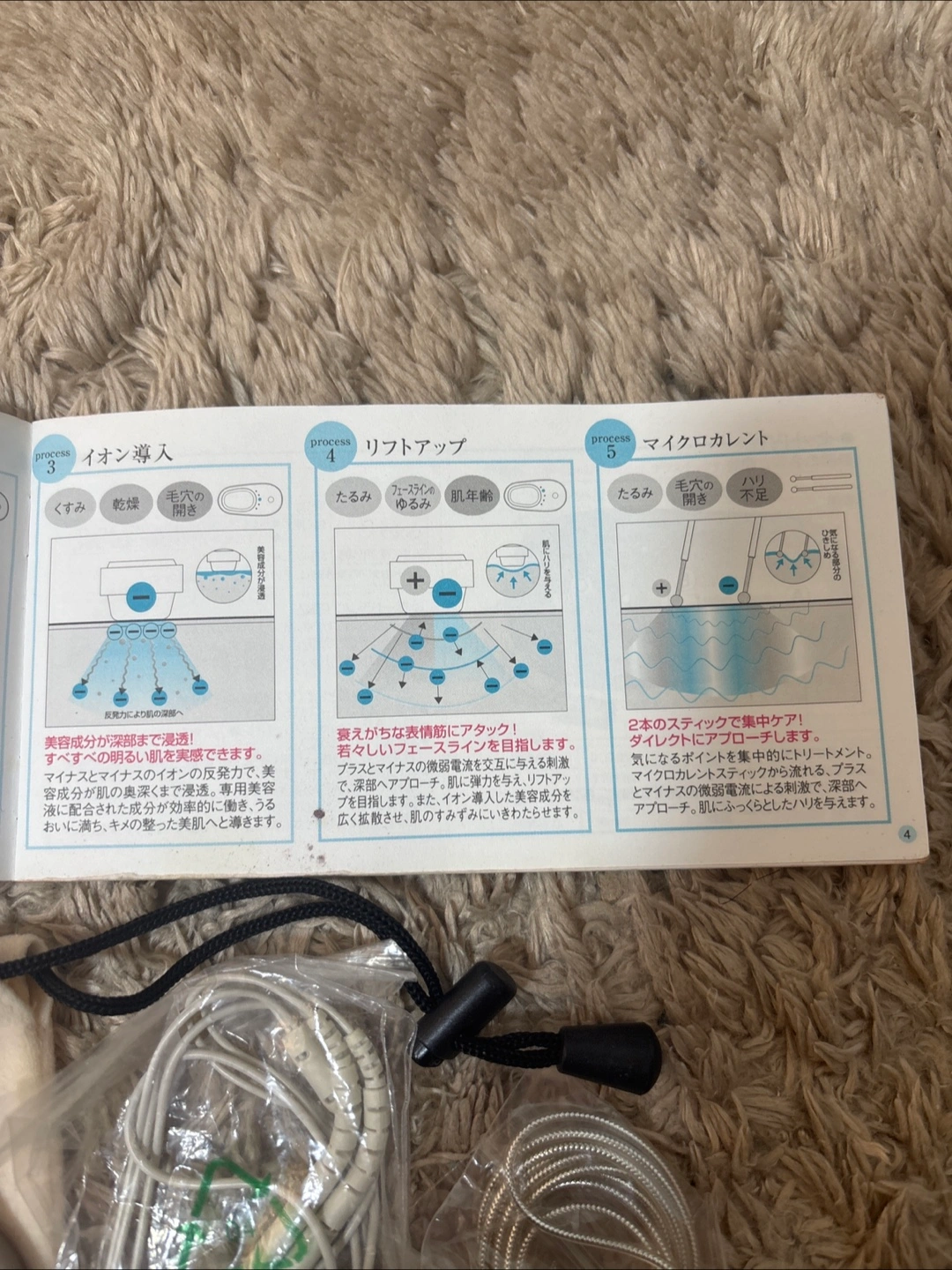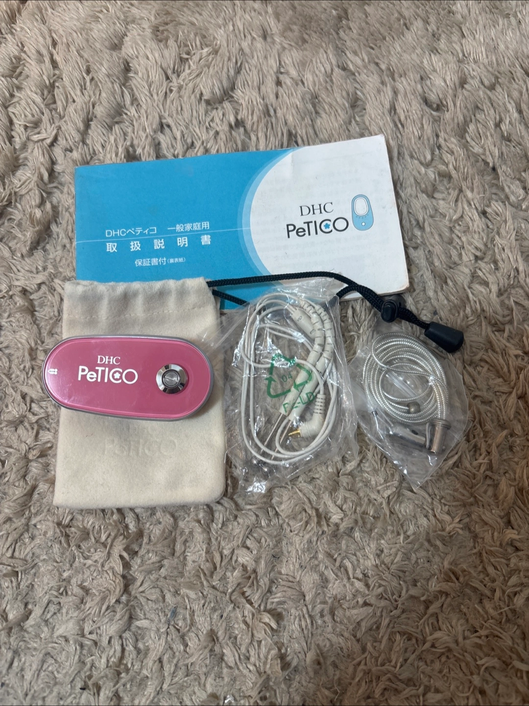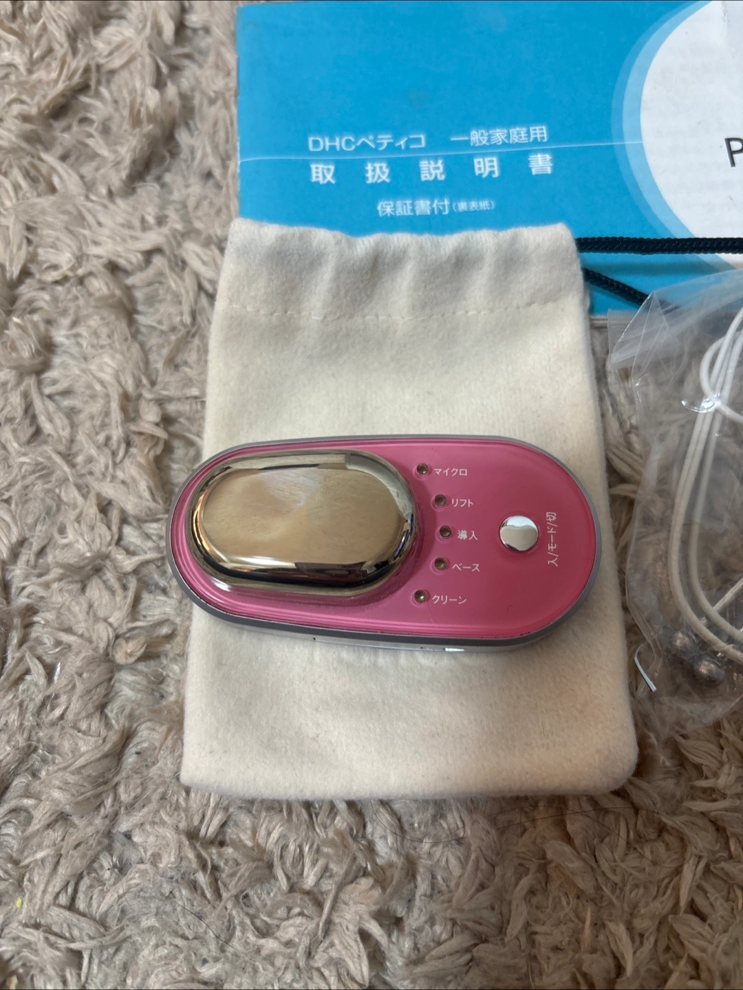 DHCの美顔器です。 昔購入して美容液が無くなるまで使いその後はしまってました。 取扱説明書も汚れていますがあります。 美容液は別とご購入下さい。 ハードケース以外は揃っています。 動作確認済み。5枚目の写真。 イオン交流による5つのプロセス(クリーン・ベースバランス・イオン導入・肌をふっくら持ち上げる・マイクロカレント)が1台で手軽にできる美顔器。携帯に便利な軽量・ミニサイズです。 ▼5つの機能 1.クリーン 毛穴の奥から汚れを吸着、肌に浸透感を取り戻します。プラスイオンの電気的吸引力で、ケアなの黒ズミや肌の老廃物を吸着。普段のクレンジングや洗顔で落としきれなかった汚れを取り除きます。 2.ベースバランス 奥深くへと届く心地よい刺激、肌をリフレッシュさせます。プラスとマイナスの微弱電流による交互の刺激で、深部からマッサージ。イオン導入しやすい肌に整えます。 3.イオン導入 美容成分が深部まで浸透。すべすべの明るい肌を実感できます。マイナスとマイナスのイオンの反発力で、美容成分が肌の奥深くまで浸透。専用美容液に配合された成分が効率的に働き、うるおいに満ち、キメの整った美肌へと導きます。 4.リフトアップ 衰えがちな表情筋にアタック、若々しいフェースラインを目指します。プラスとマイナスの微弱電流を交互に与える刺激で深部へアプローチ。肌に弾力を与え、リフトアップを目指します。またイオン導入した美容液成分を広く拡散させ、肌のすみずみにいきわたらせます。 5.マイクロカレント 2本のスティックで集中ケア、ダイレクトにアプローチします。きになるポイントを集中的にトリートメント。マイクロカレントスティックから流れる、プラスとマイナスの微弱電流による刺激でm深部へとアプローチ。肌にふっくらとしたハリを与えます。
