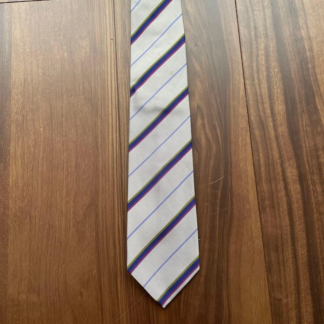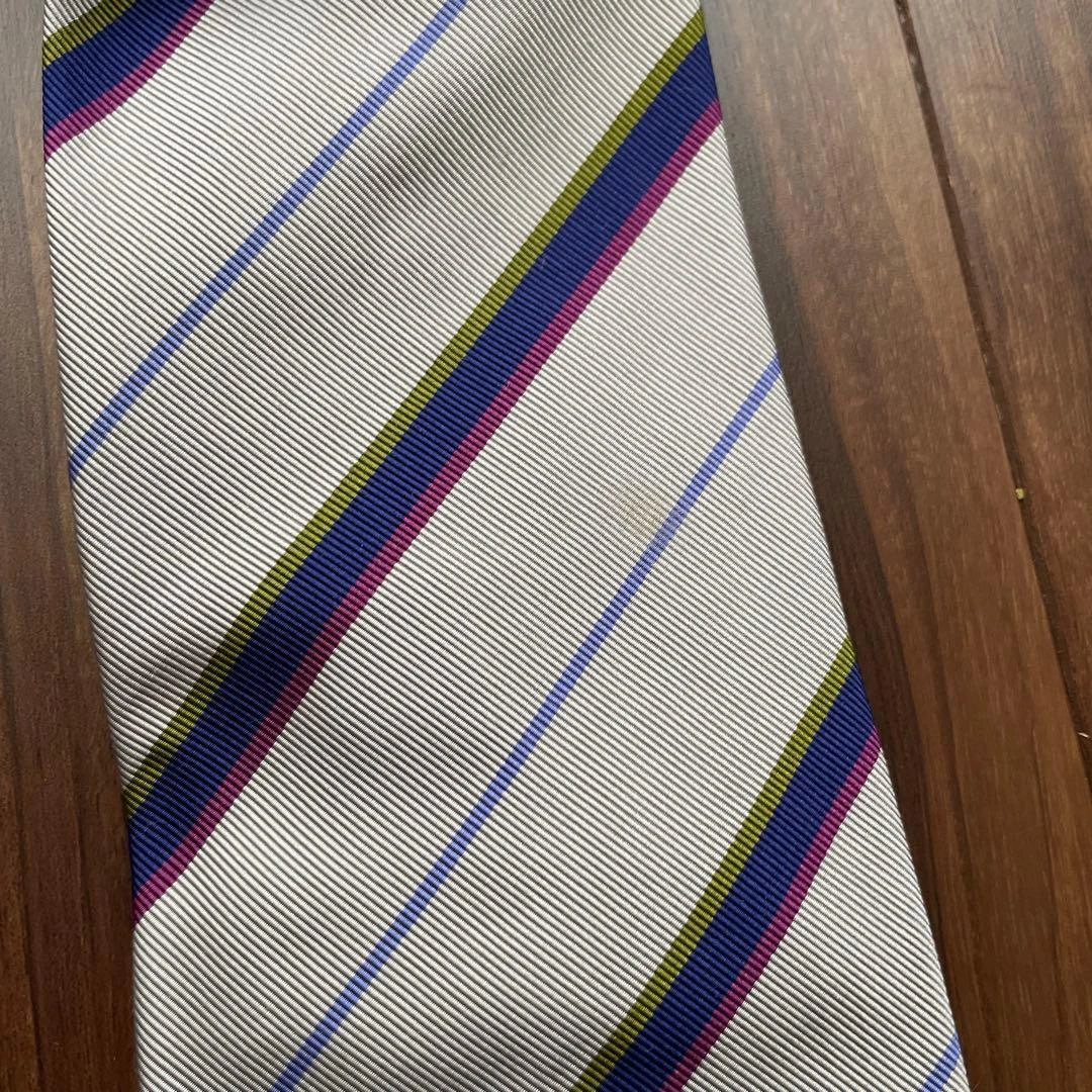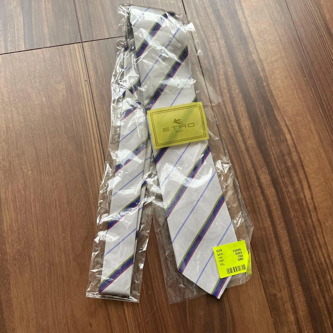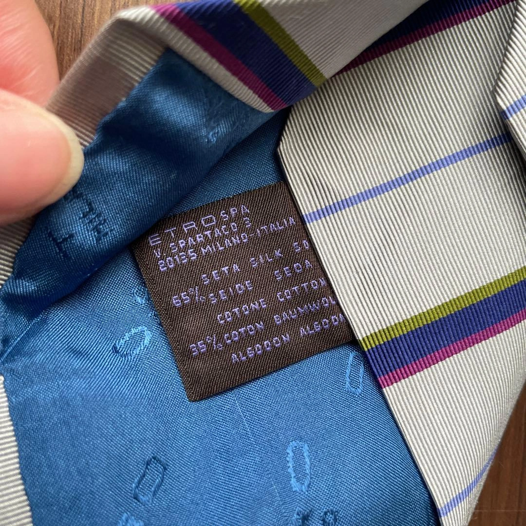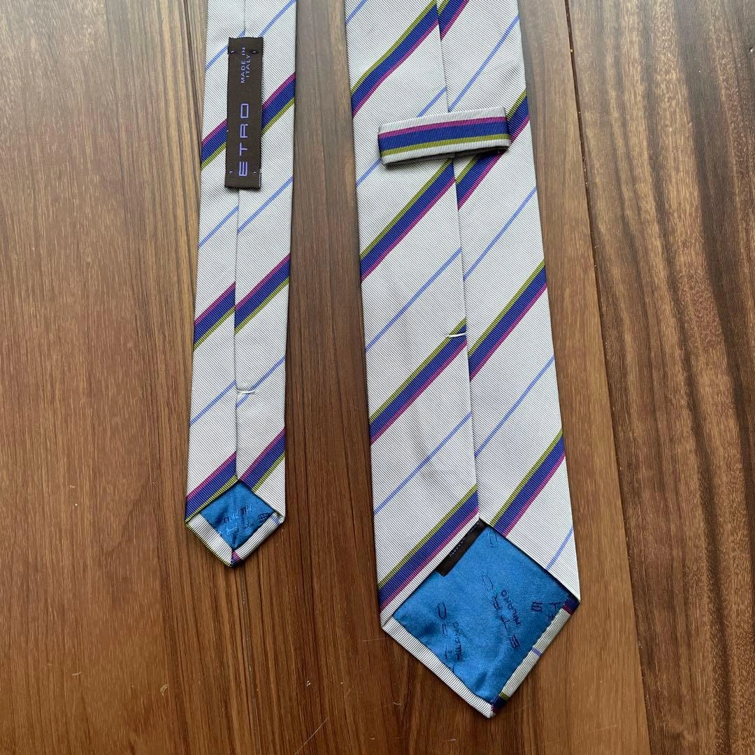 シルバー地にカラフルなストライプのネクタイです。 イタリアブランド、エトロ。 プレゼント用に購入しましたが、 あげる方もおらず自宅保管していました。 (保管用ビニール袋が一部破れています) 購入時は分かりませんでしたが、少し汚れがあります。 未使用品です。 - 色: シルバーと紫、緑、青のストライプ - デザイン: ストライプ ご覧いただきありがとうございます。 ご理解いただける方のみよろしくお願いします。