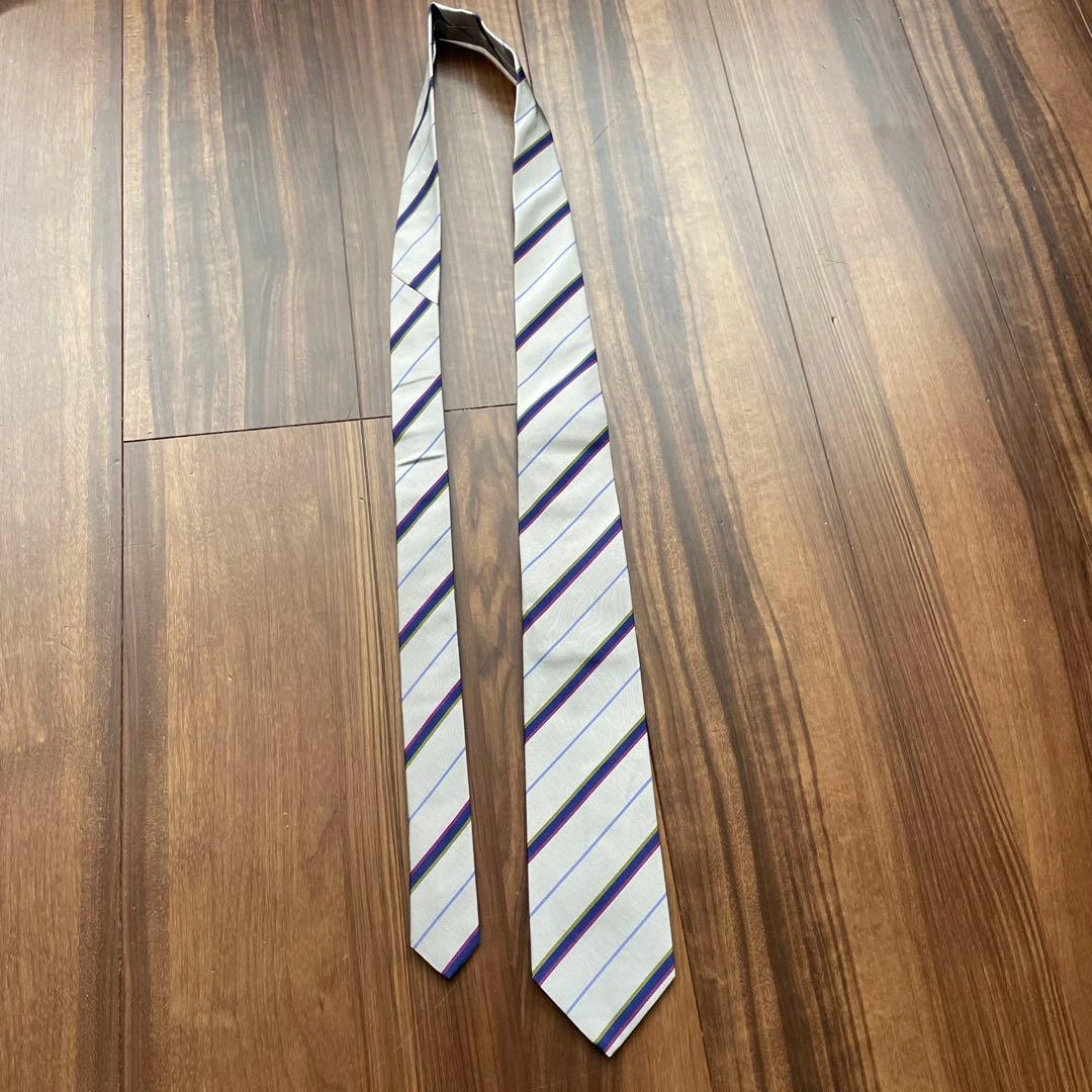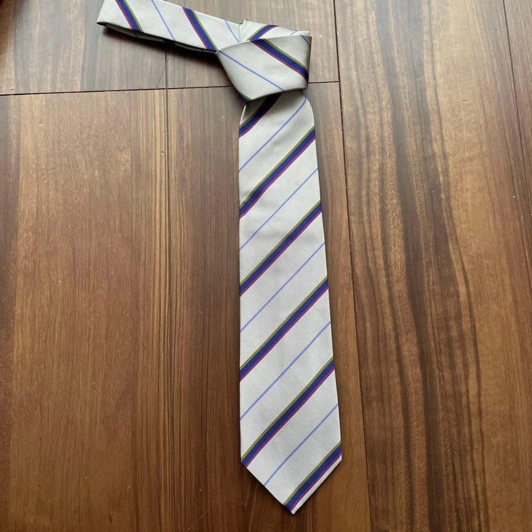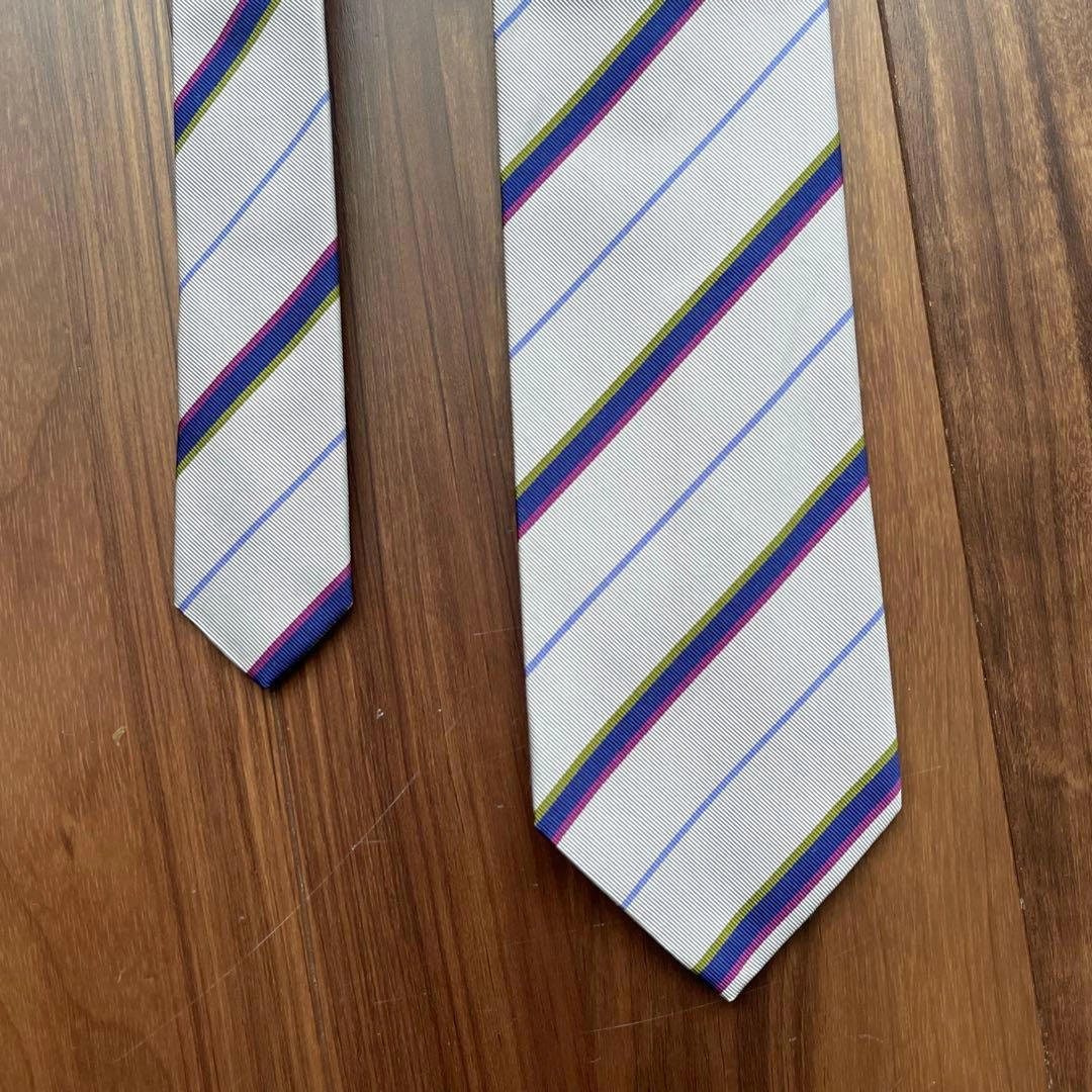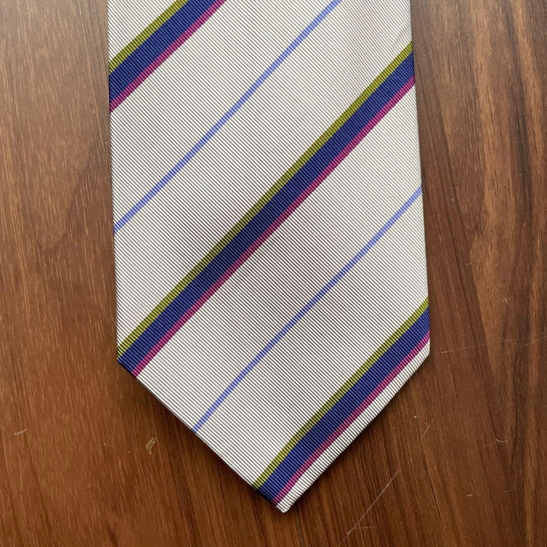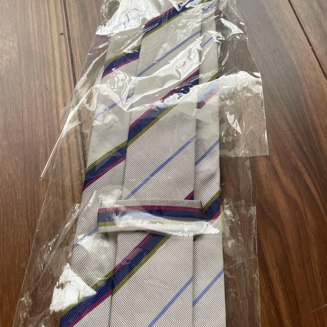 シルバー地にカラフルなストライプのネクタイです。 イタリアブランド、エトロ。 プレゼント用に購入しましたが、 あげる方もおらず自宅保管していました。 (保管用ビニール袋が一部破れています) 購入時は分かりませんでしたが、少し汚れがあります。 未使用品です。 - 色: シルバーと紫、緑、青のストライプ - デザイン: ストライプ ご覧いただきありがとうございます。 ご理解いただける方のみよろしくお願いします。