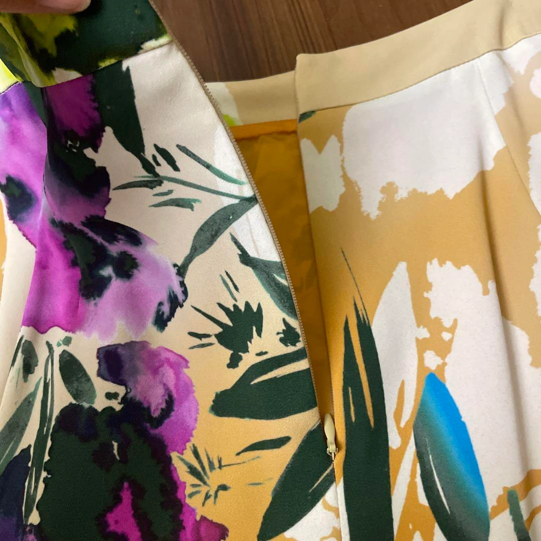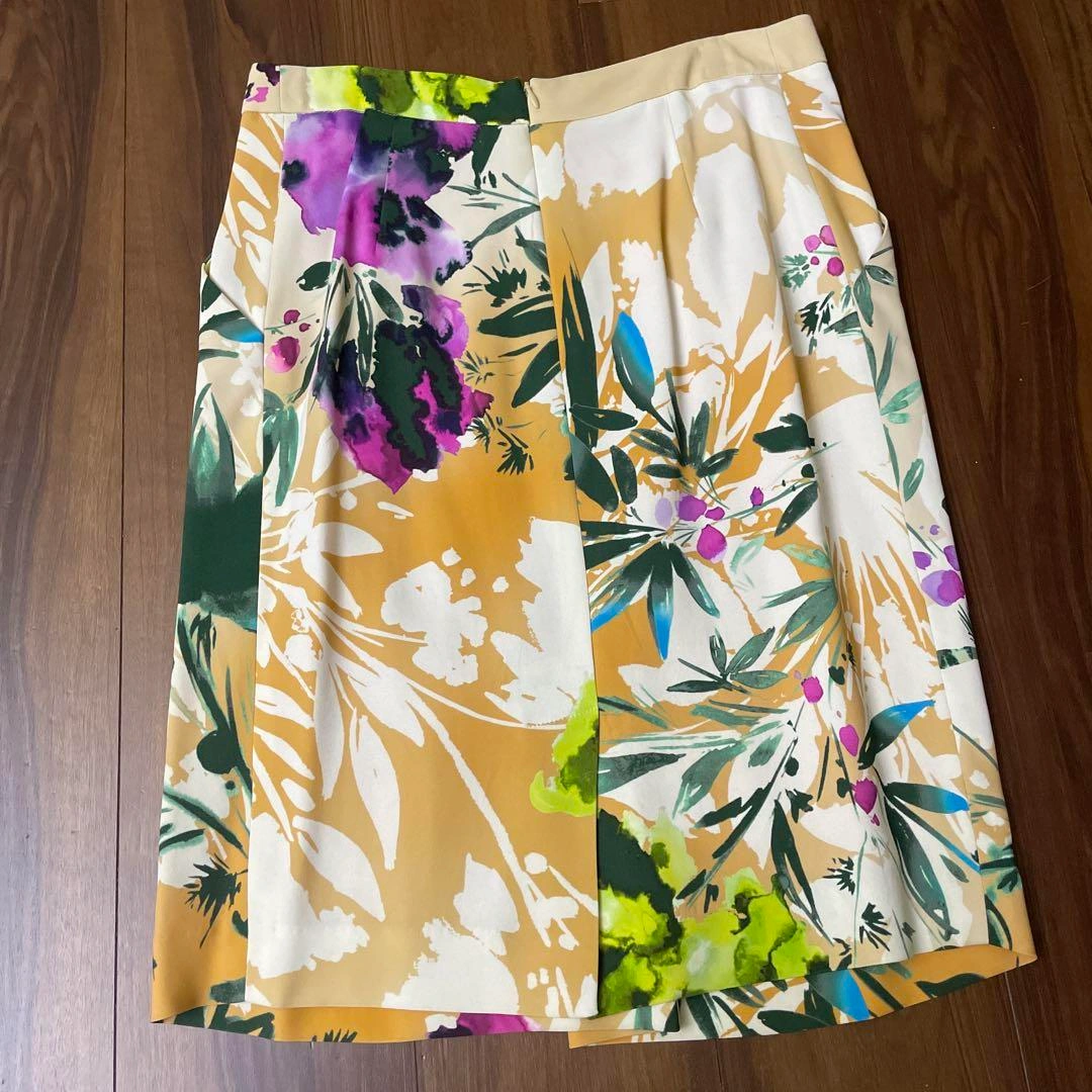 多色の花柄デザインが特徴的なひざ丈スカートです。 - 色: 多色(黄色、緑、紫、白) - デザイン: 花柄 - スタイル: ひざ丈 とても素敵で大好きなデザインなのですが、産後体系が変わってしまい着用できないので出品します。 よろしくお願いします。