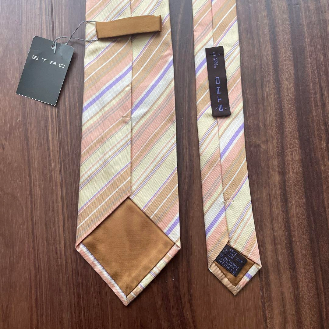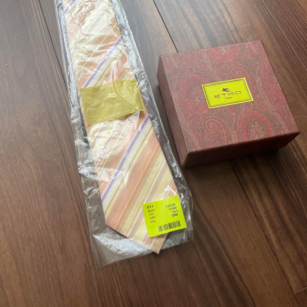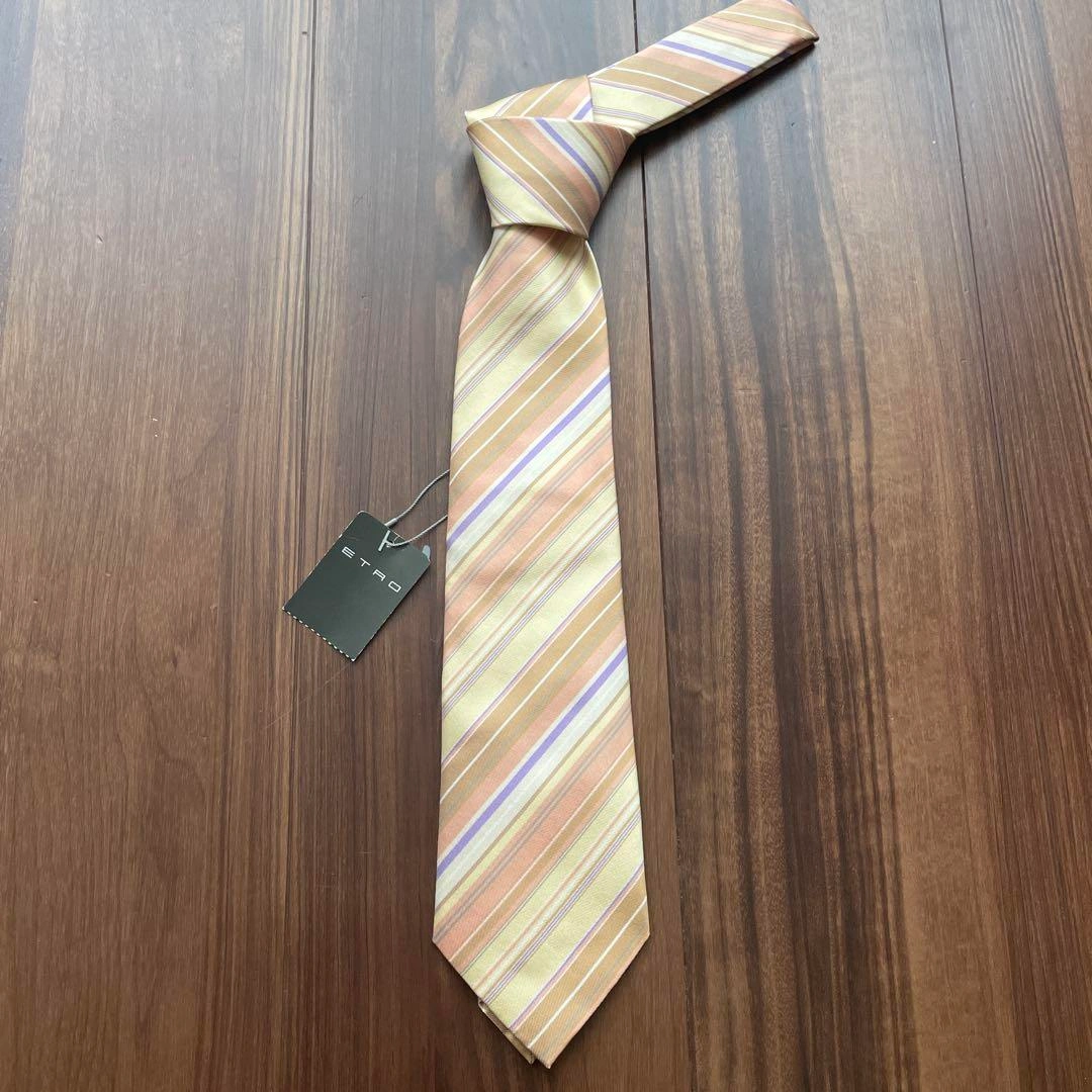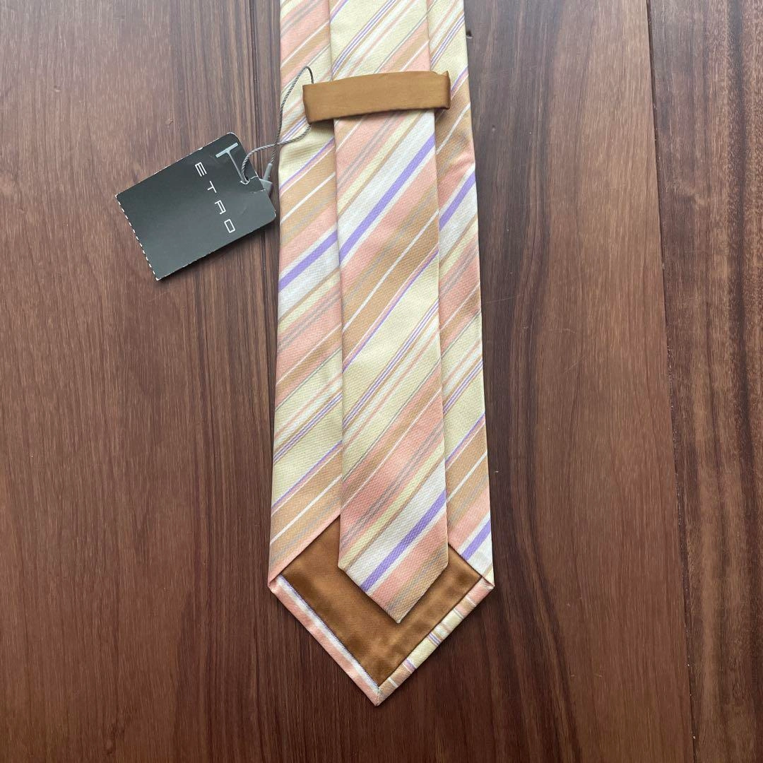 ETROのシルク製ストライプネクタイです。フォーマルなスタイルに最適かと思います。 プレゼント用に購入しましたが、使用機会がなく自宅保管していました。未使用品です。 専用のETROビニール袋に入れています(一部破れています)。 専用の箱ではありませんが、箱と紙袋もお付けできます。必要な方はご連絡ください。 ブランド: ETRO 色: ベージュ、オレンジ、紫、緑のストライプ デザイン: ストライプ柄 素材: シルク 状態: 新品タグ付き ご覧いただきありがとうございます。