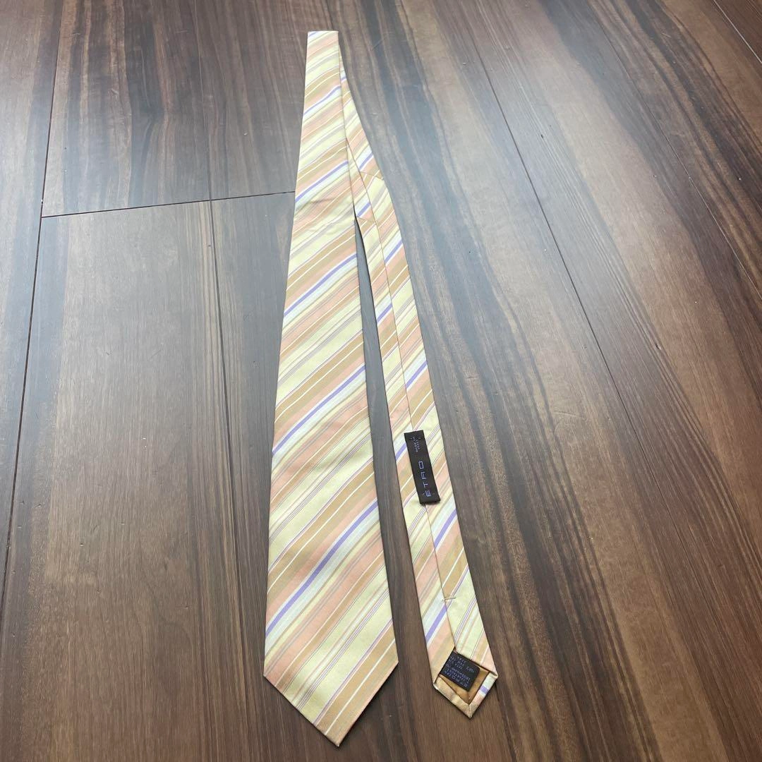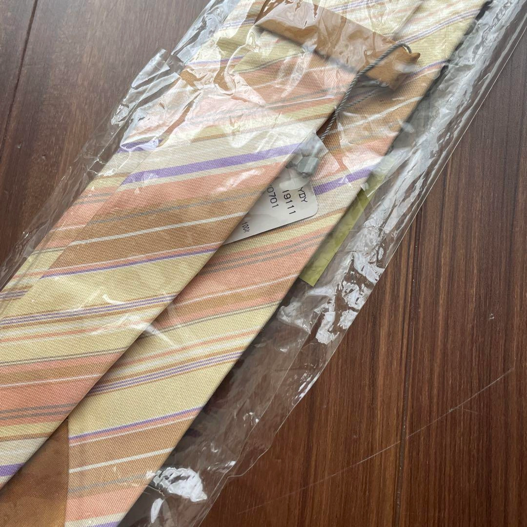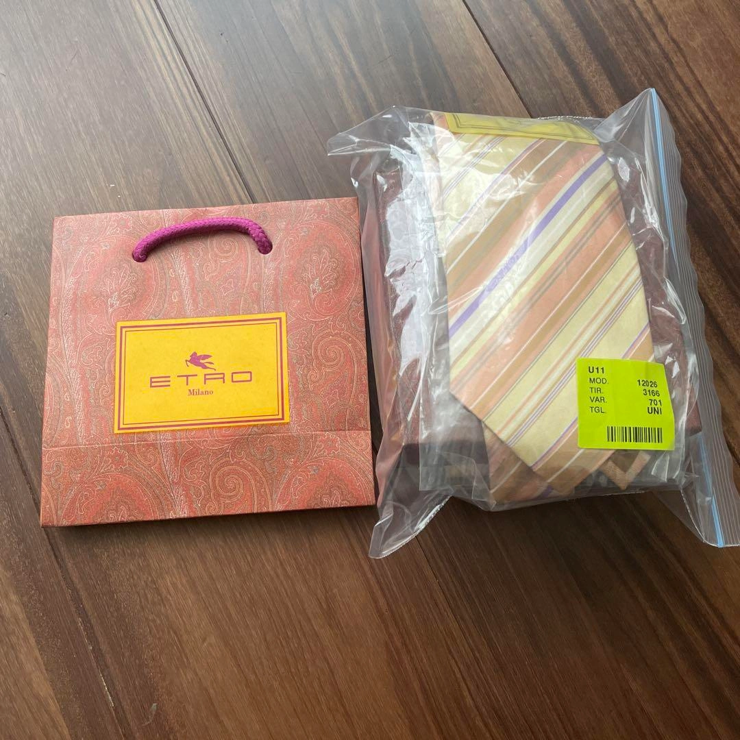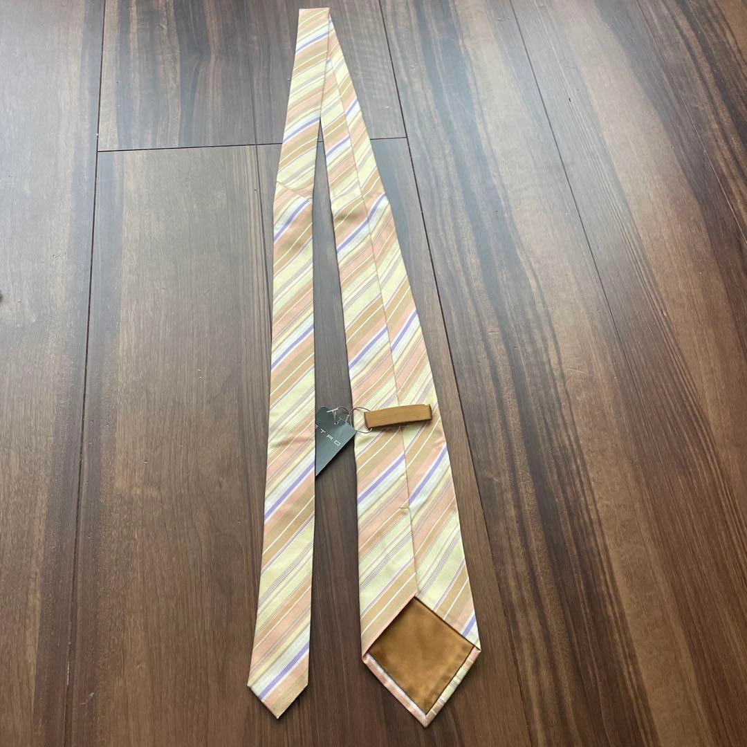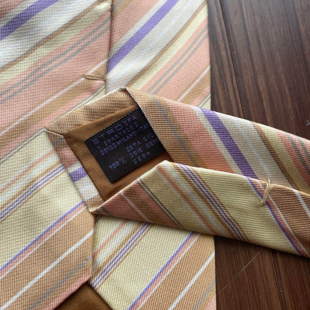 ETROのシルク製ストライプネクタイです。フォーマルなスタイルに最適かと思います。 プレゼント用に購入しましたが、使用機会がなく自宅保管していました。未使用品です。 専用のETROビニール袋に入れています(一部破れています)。 専用の箱ではありませんが、箱と紙袋もお付けできます。必要な方はご連絡ください。 ブランド: ETRO 色: ベージュ、オレンジ、紫、緑のストライプ デザイン: ストライプ柄 素材: シルク 状態: 新品タグ付き ご覧いただきありがとうございます。