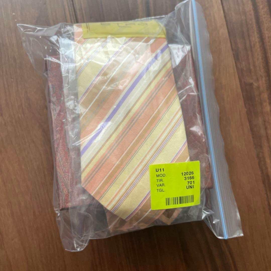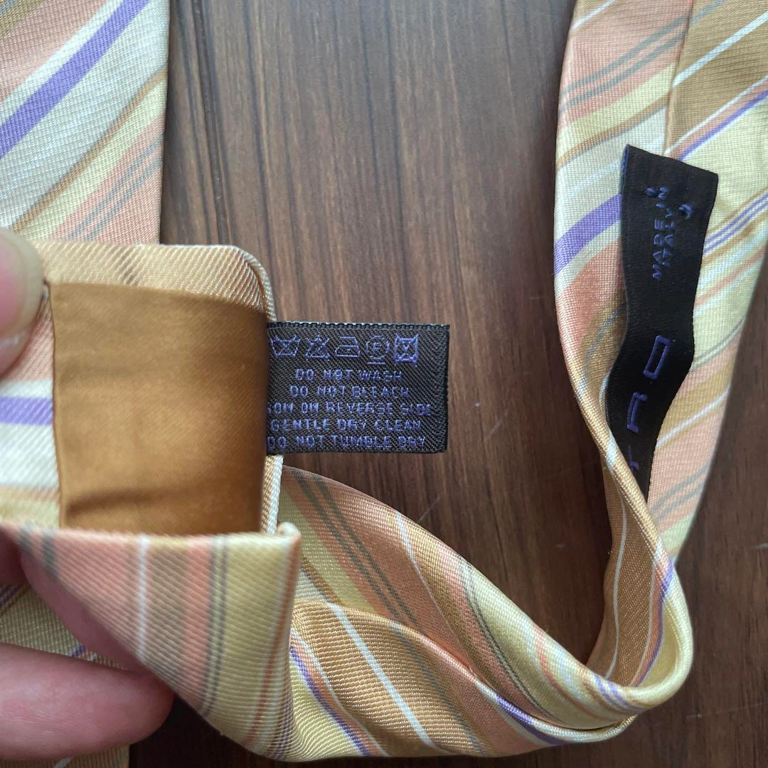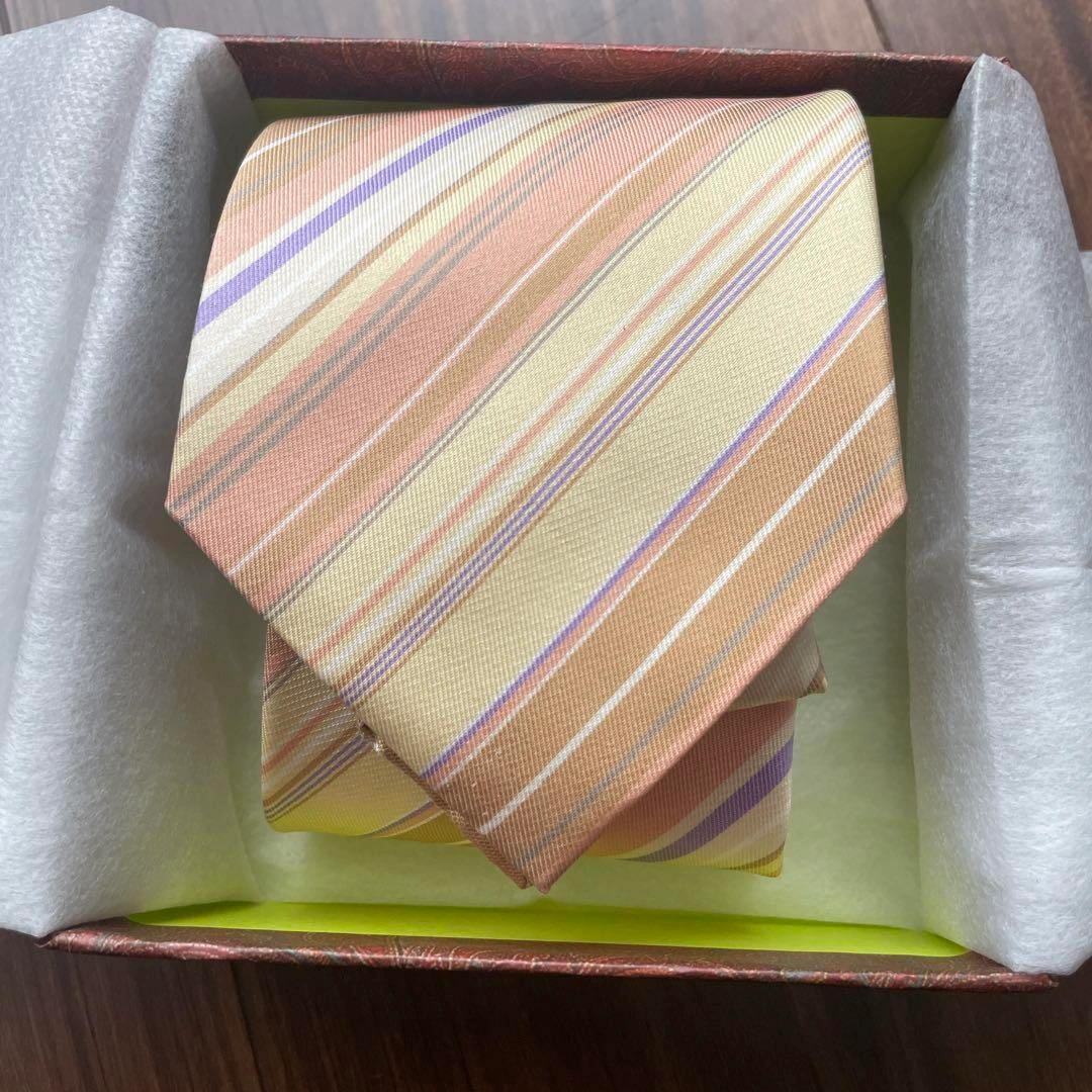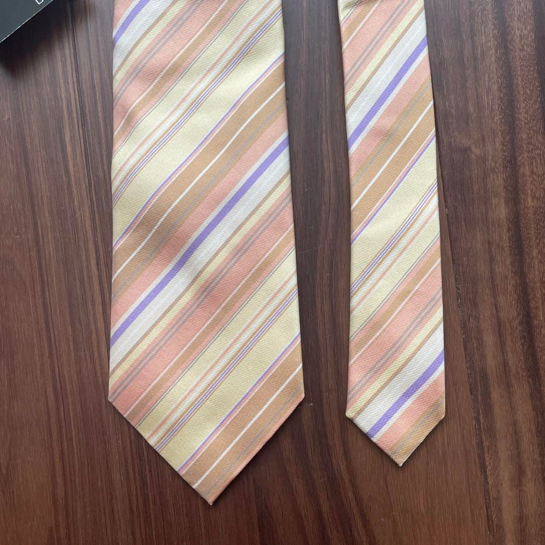 ETROのシルク製ストライプネクタイです。フォーマルなスタイルに最適かと思います。 プレゼント用に購入しましたが、使用機会がなく自宅保管していました。未使用品です。 専用のETROビニール袋に入れています(一部破れています)。 専用の箱ではありませんが、箱と紙袋もお付けできます。必要な方はご連絡ください。 ブランド: ETRO 色: ベージュ、オレンジ、紫、緑のストライプ デザイン: ストライプ柄 素材: シルク 状態: 新品タグ付き ご覧いただきありがとうございます。