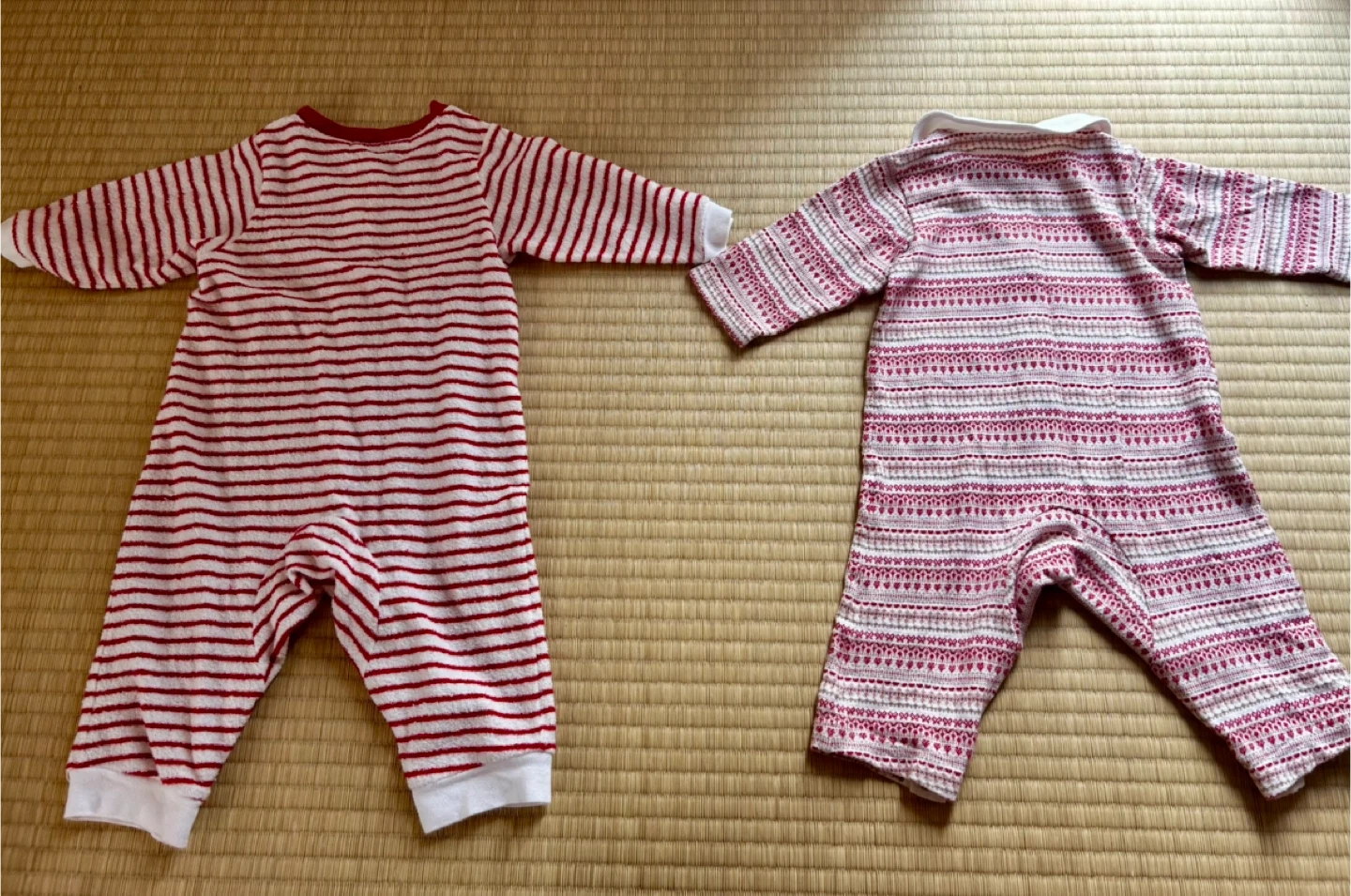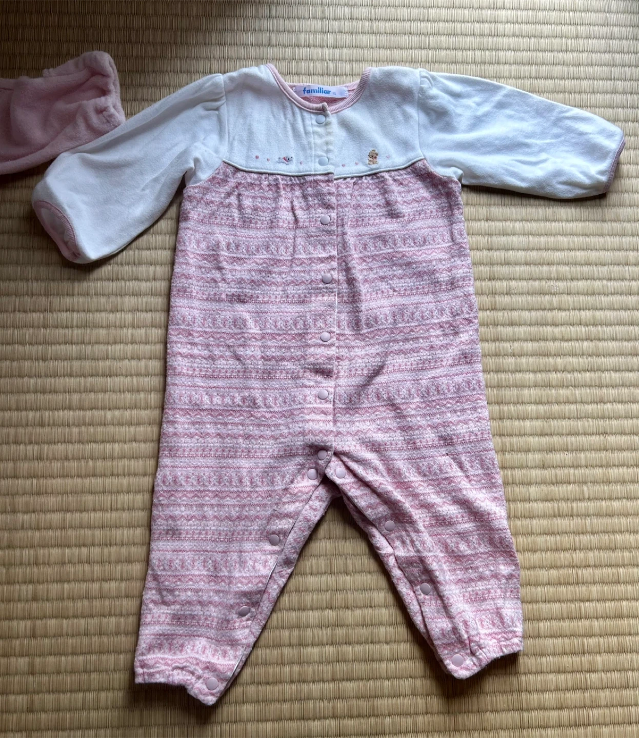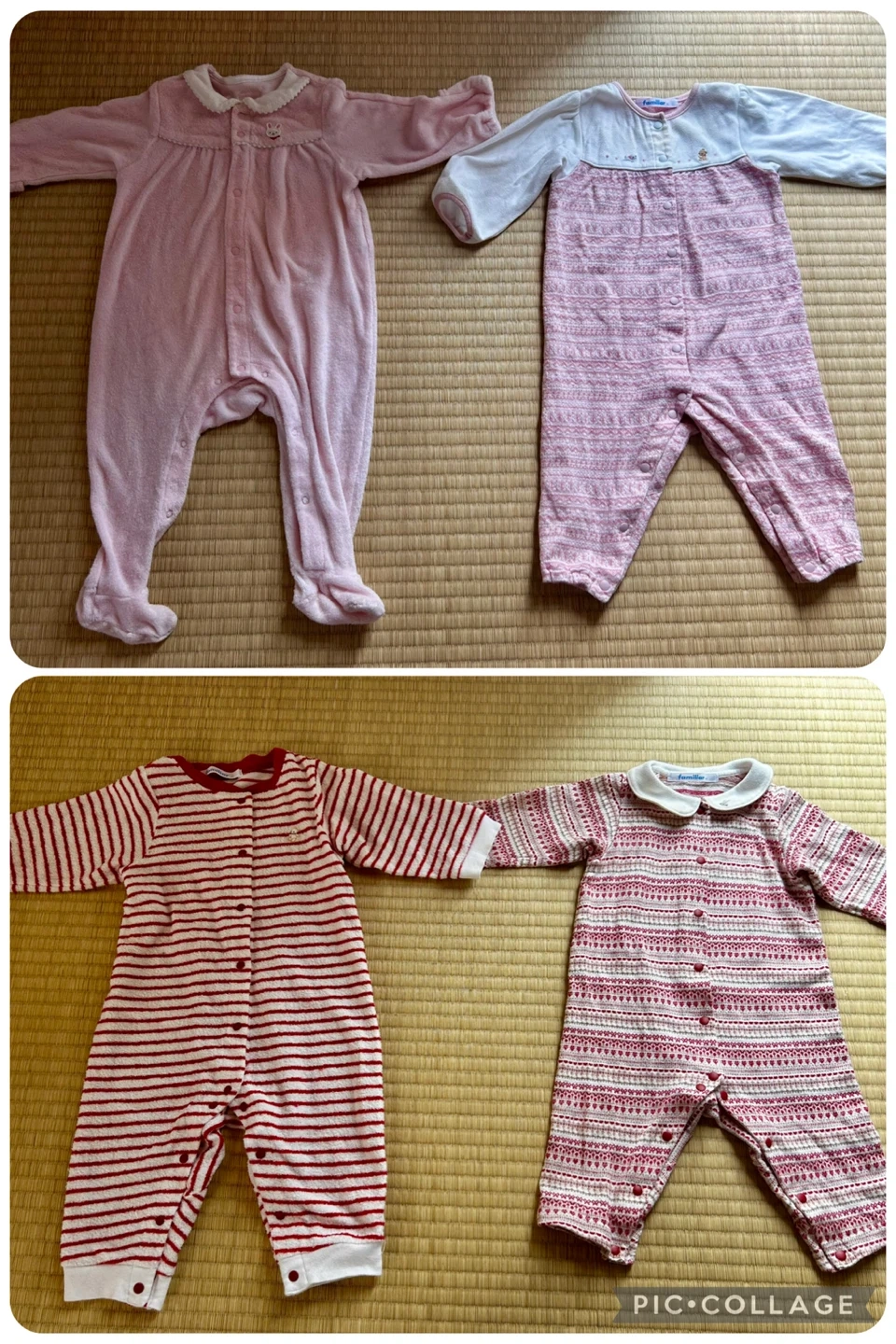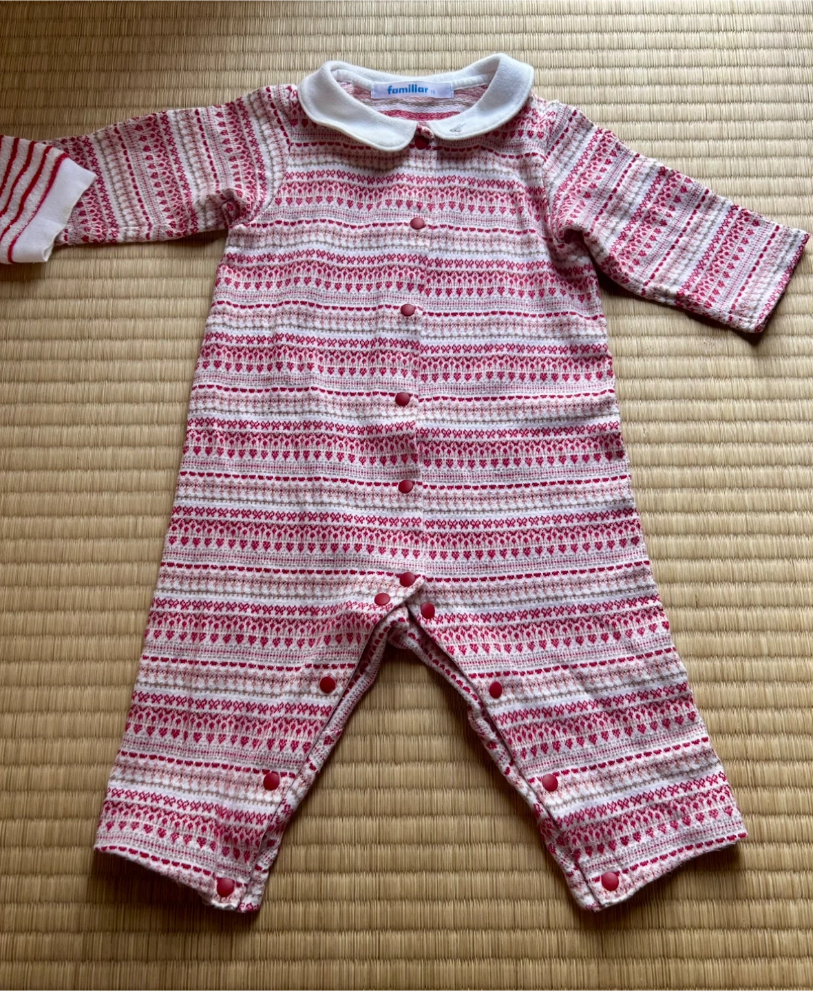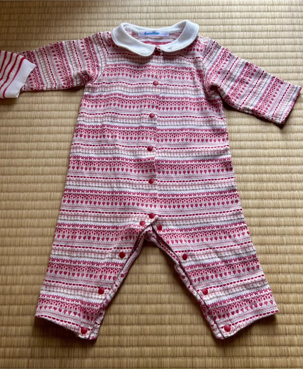 familiar(ファミリア)を中心とした女の子向けベビーロンパース4点セットです どれも肌触りの良い素材で、秋冬シーズンにぴったり。 おうち時間やお出かけ、ねんねタイムにも使いやすいデザインです。 セット内容 ① 襟付き赤×白のノルディック柄ロンパース(familiar) 上品な丸襟が可愛らしく、お出かけにもおすすめ。 ② 赤×白ボーダーロンパース(familiar) ふんわりとした素材感で、寒い日もあたたかく過ごせます。 ③ 白×ピンクの切り替えデザインロンパース(familiar) 胸元に小さな刺繍入り。柔らかな色合いがやさしい印象。 ④ ピンク無地のふわもこロンパース(うさぎ刺繍付き)(MIKI HOUSE) 足先と手先まで覆えるデザインで、冷え対策にも◎ 【サイズ】70cm 【ブランド】familiar(ファミリア)、MIKI HOUSE 【状態】全体的にきれいで目立つ汚れなし。多少の使用感あり。ホームクリーニング済み。 【保管環境】ペット・喫煙者なし