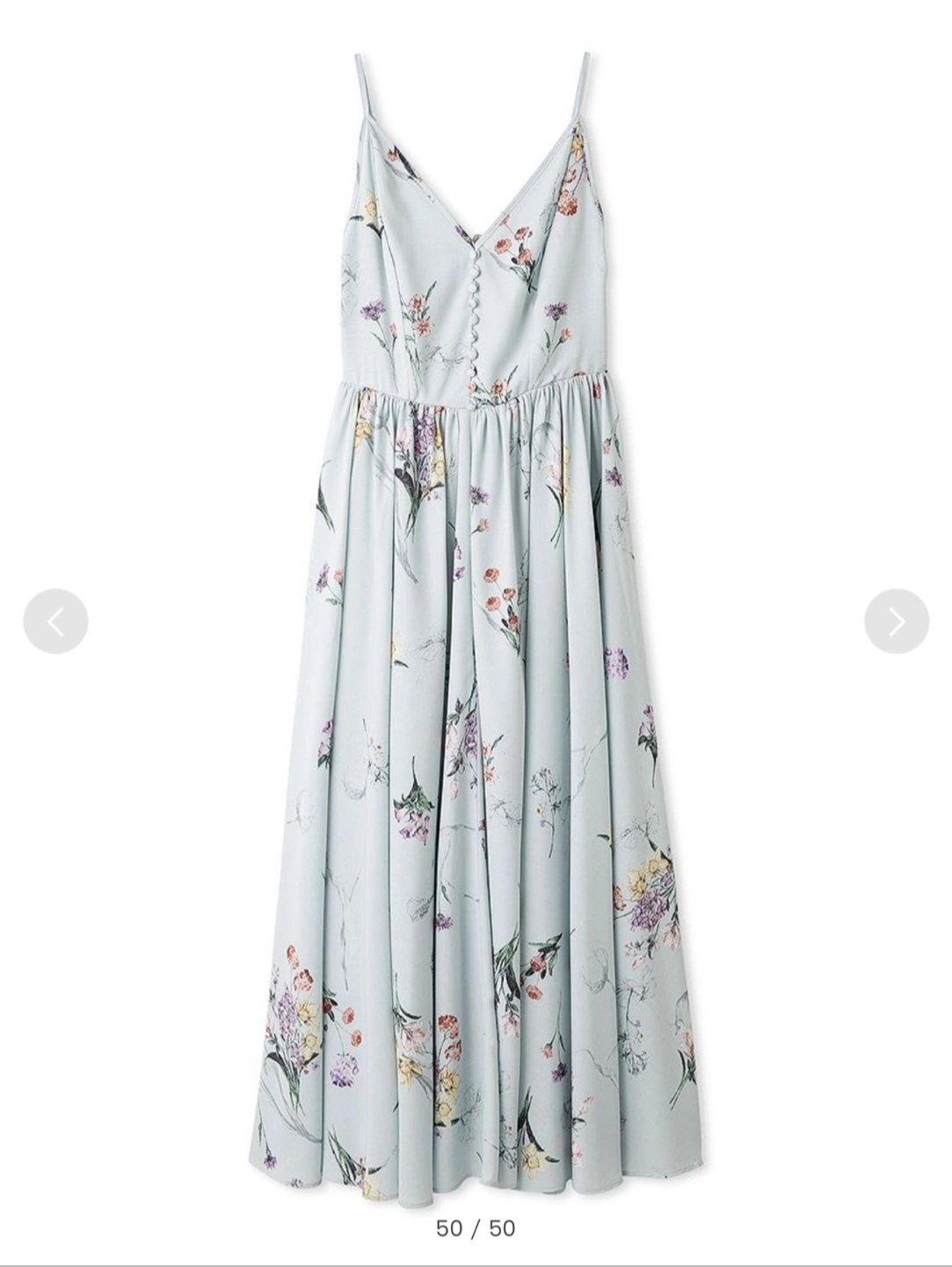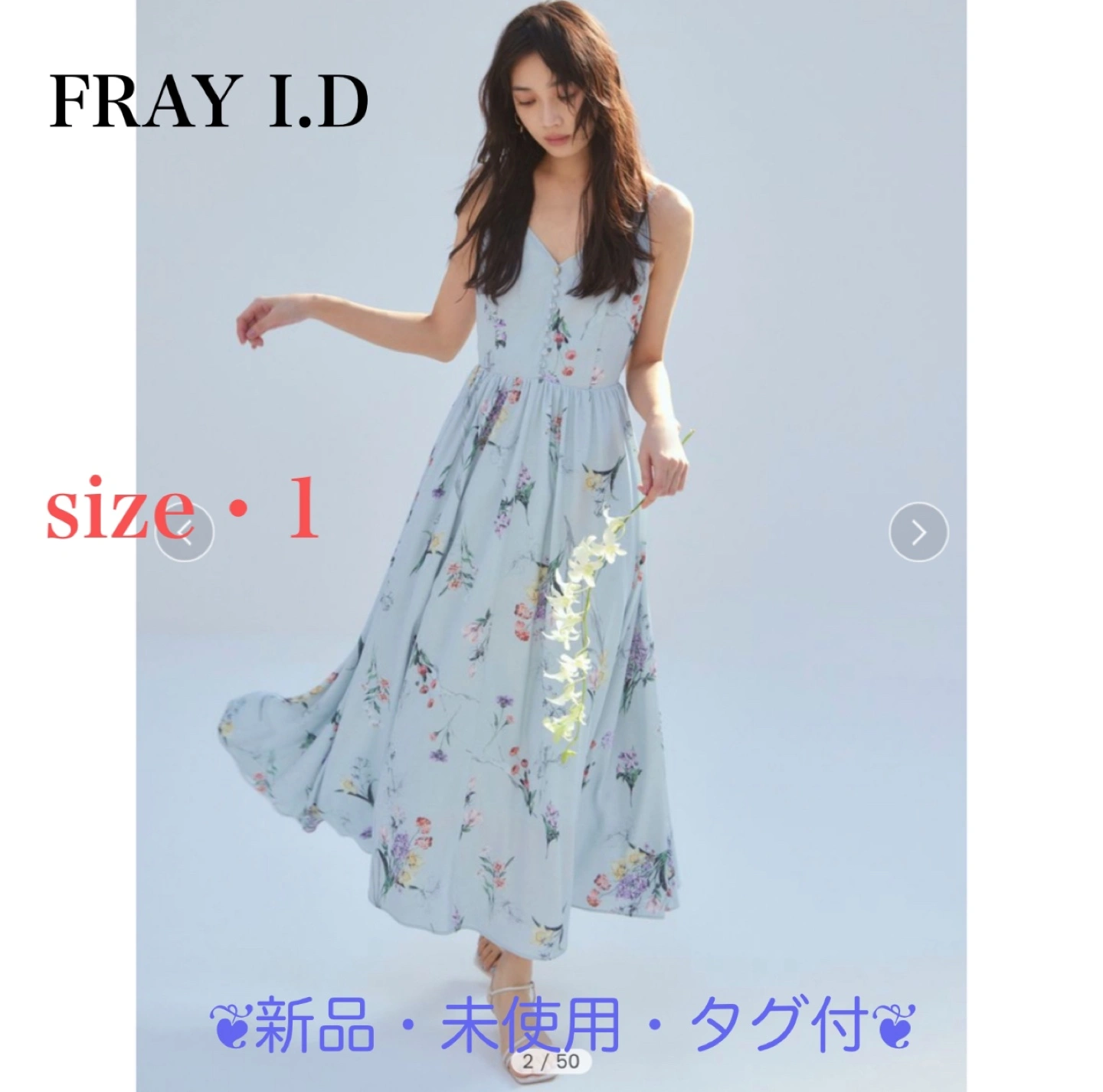 FRAY I.D ボタニカルプリントキャミソールワンピース size・1(M) お色・MNT 【新品・未使用・タグ付き】 1 (Mサイズ相当) 着丈:110/総丈:130/ ウエスト:79/バスト:89 【たっぷりのギャザーがドラマティック、オリジナル柄のモードなキャミワンピ】 歩くたびにドラマティックな印象を演出してくれる、春らしいキャミソールワンピースです。 FRAY I.Dオリジナルのボタニカル柄プリントは、まるでアートのよう。贅沢な多色使いで、甘すぎない花柄を表現しています。 デコルテを綺麗に見せてくれる深めのVネック開きで、肩紐はアジャスターがついているので、長さの調整が可能。 たっぷりとギャザーを寄せたフレアシルエットは、生地分量もリッチな印象で、ワンランク上のスタイルが楽しめます。 背中の上端にも平ゴムが入っているので、着心地の良さを叶えながら後ろから見たときもキレイにフィット。 シワになりにくく手洗い可能な、さらりとしたポリエステル素材を使用。 全面に裏地が付いているので透けも気にならず、一枚で着たときも安心です。
