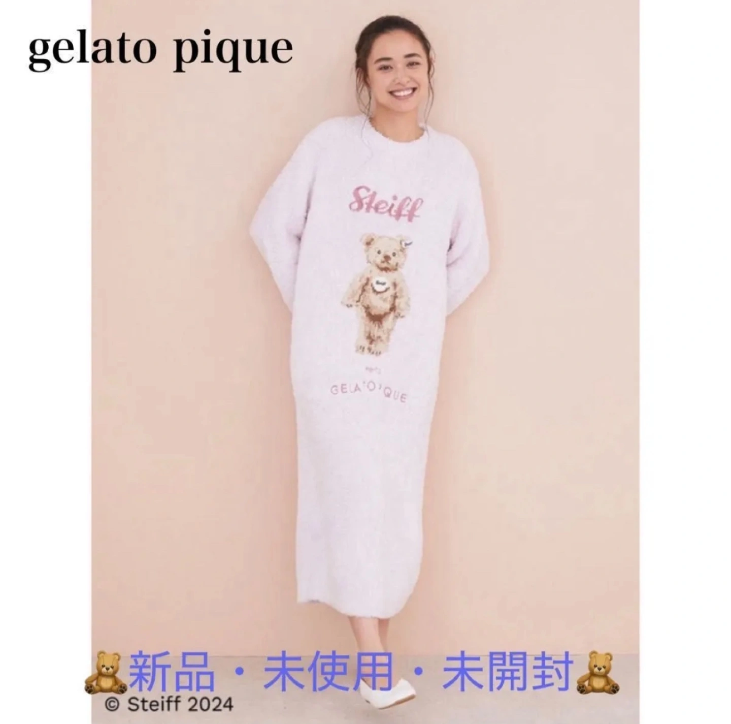 gelato pique 【Steiff】ジェラートJamesジャガードワンピース お色・ピンク size・FREE 【新品・未使用・未開封】 【クラシカルなJamesを描いたジェラートワンピース】【Fabric】ブランドの顔ともいえる、ふんわりと上質なもこもこ感が人気の‘ジェラート’を使用しました。GELATO(ジェラート)…ジェラート ピケの代名詞である定番のニット素材'ジェラート'。やわらかく、ふわふわもこもこの肌触りが特徴で、毛足が長くあたたかな素材です。GELATO PIQUE(=アイスの生地)が名の由来。【Design/Styling】ドイツの伝統的なぬいぐるみブランドSteiff(シュタイフ)とのコラボレーションに、待望の第2弾が登場。ホリデーシーズンにふさわしいクラシカルなベア・Jamesをモチーフとしたジャガードワンピースです。ベースは上質なもこもこ感が魅力の’ジェラート’素材で、Jamesの絵柄の部分にはエアモコ素材を使用。カラーはgelato piqueらしいクリーム、ピンク、ブルーの3色展開。同じJamesモチーフのルームシューズに合わせたり、メンズサイズ、ジュニアサイズ、キッズサイズ、ベビーサイズとのリンクコーディネートもお楽しみいただけます。
