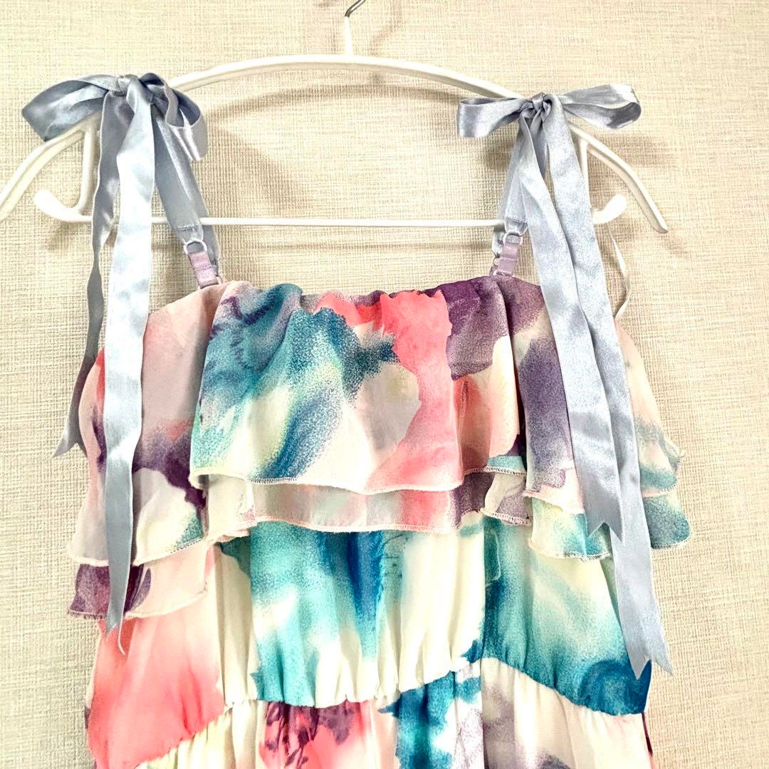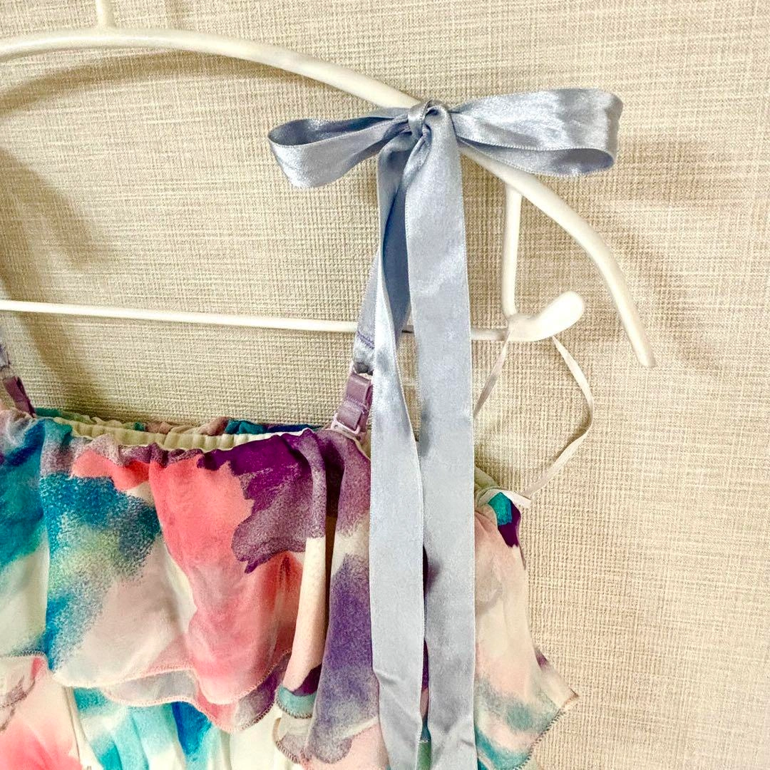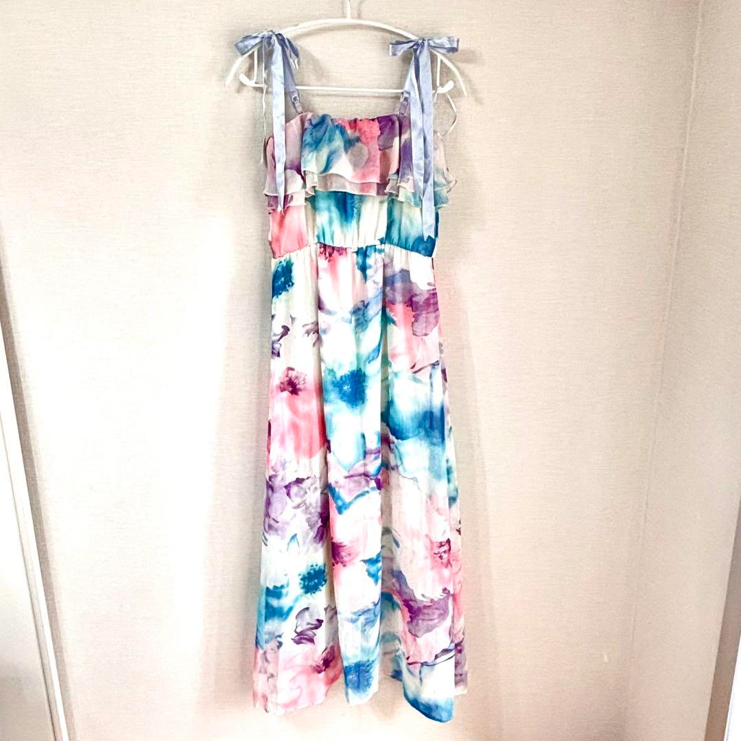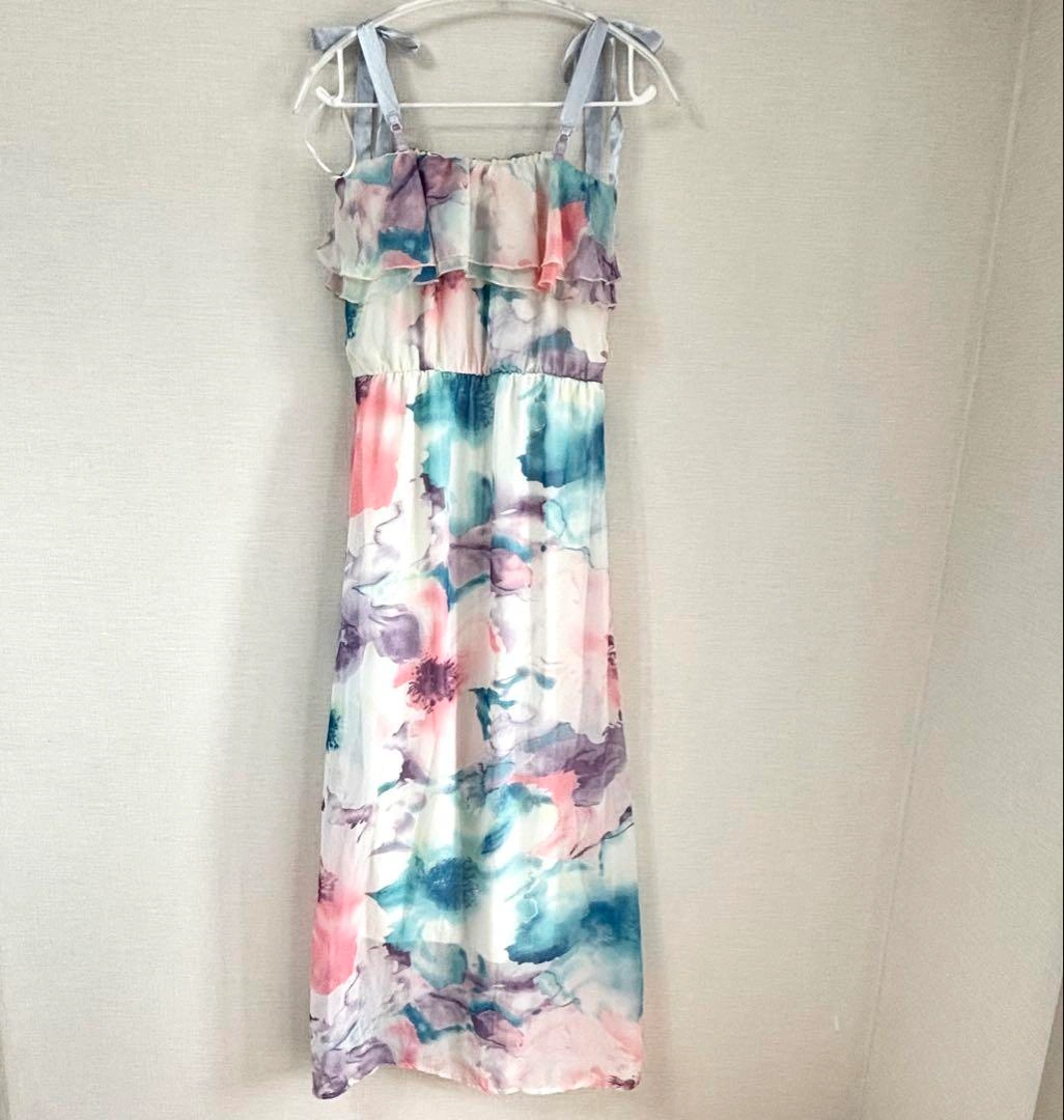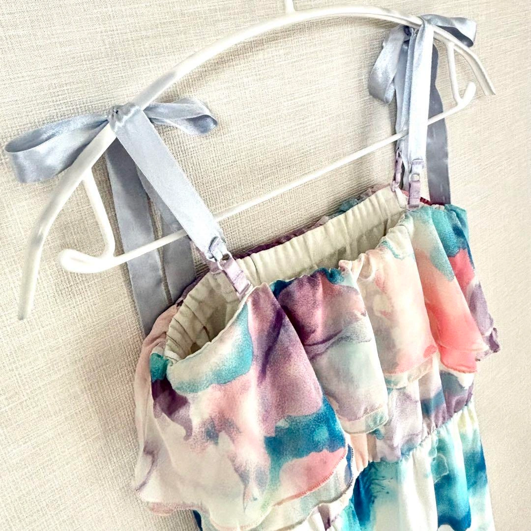 淡い色合いのカラーで透け感があり、風になびくと涼しげです!肩紐はリボンで調整でき便利で可愛いです♪ 伸縮性があり、生地も薄く、動きやすく快適です。 裏地に点の汚れがございます。最後の写真をご確認ください。 サイズ(多少の誤差はお許しください) 表記サイズ F (フリーサイズ) バスト79〜87cm 身長154〜162cm 実寸 着丈100cm 身幅120cm ストレッチ伸縮あり 肩紐はリボンで調整可能 素材 ポリエステル100% 他にも色々出品しております。 ご希望の方はお気軽にご連絡ください。