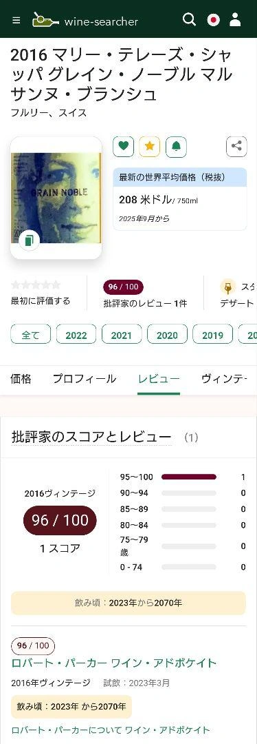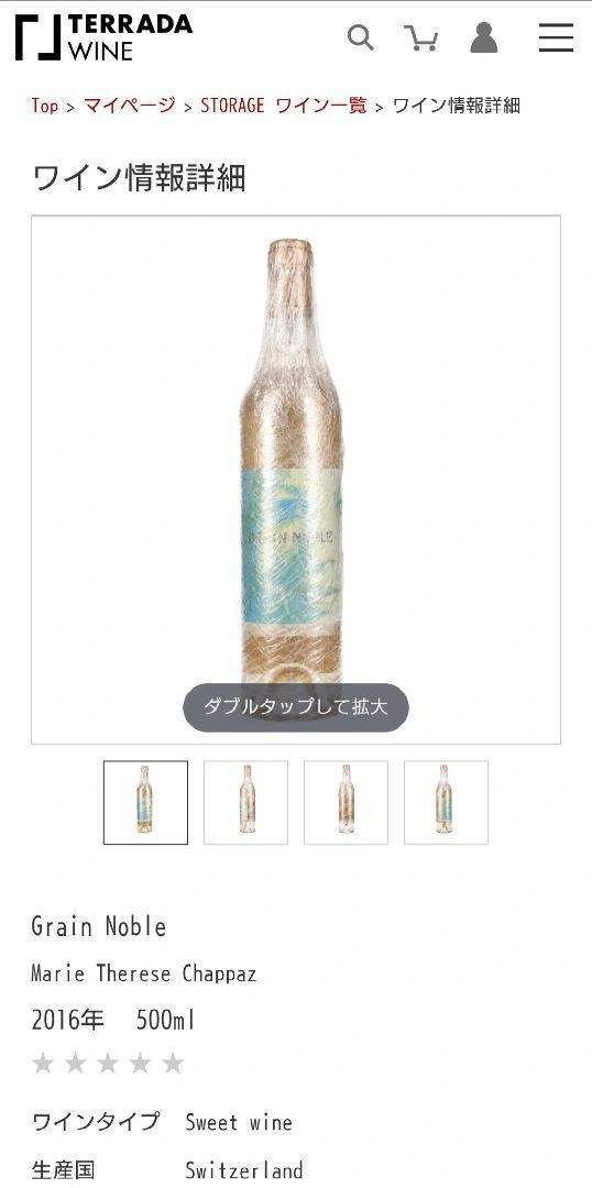 新品・未開栓です。購入後、TERRDDA WINE STORAGEにて適切に保管しております。ラベル・キャップともに良好な状態です。 生産者:Marie Therese Chappaz 銘柄:Grain Noble ヴィンテージ:2016年 容量:500ml 750ml辺りの価格(ワインサーチャー):208 米ドル 評価:96 / 100 点(ロバート・パーカー ワイン・アドヴォケイト) 2016年ヴィンテージ 試飲:2023年3月 飲み頃:2023年 から2070年 希少なスイスの甘口ワインです。 未成年の方には販売できません。 すり替え防止のため返品はご遠慮ください。 値段交渉歓迎です。 #ワイン #白ワイン #スイス #希少ワイン #お宝ワイン #宝物 #レアワイン #スイスワイン #メルカリでハロウィン ご希望の方はお気軽にご連絡ください。