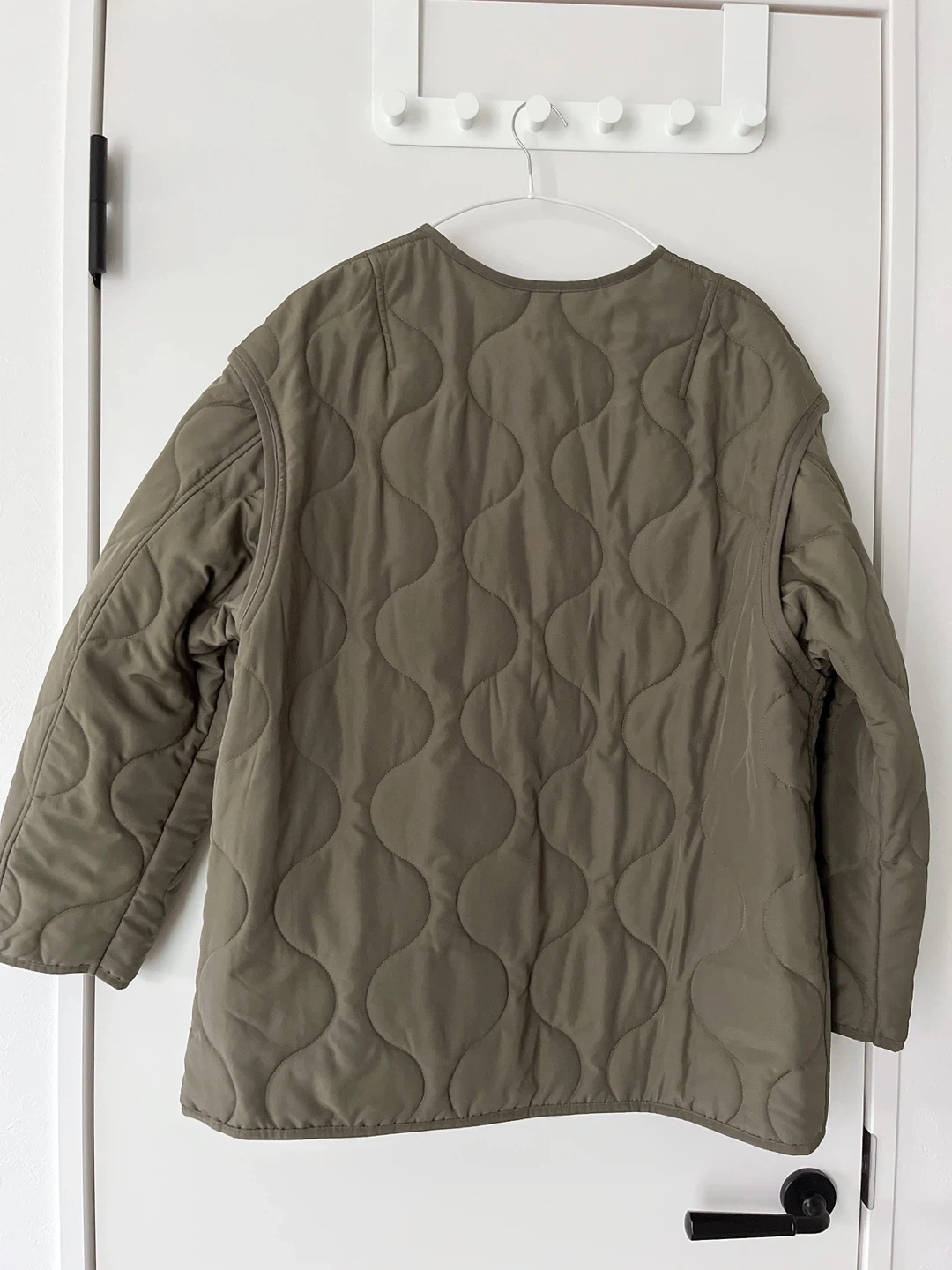 GUのキルティングジャケットです。 【情報】 ブランド:ジーユー 色:カーキ 素材:ポリエステル100% 型番:311-342670(24-01) 【状態】 使用感少なめ、全体的にきれい 【付属品】 予備ボタン 中古品であることご了承ください 肩の部分がジッパーで取れるようになっているので、ベストとしても使えます。 写真で見るより実物はシンプルで可愛くて何に合わせても良い感じなので使い勝手は良いと思いますo(^-^)o