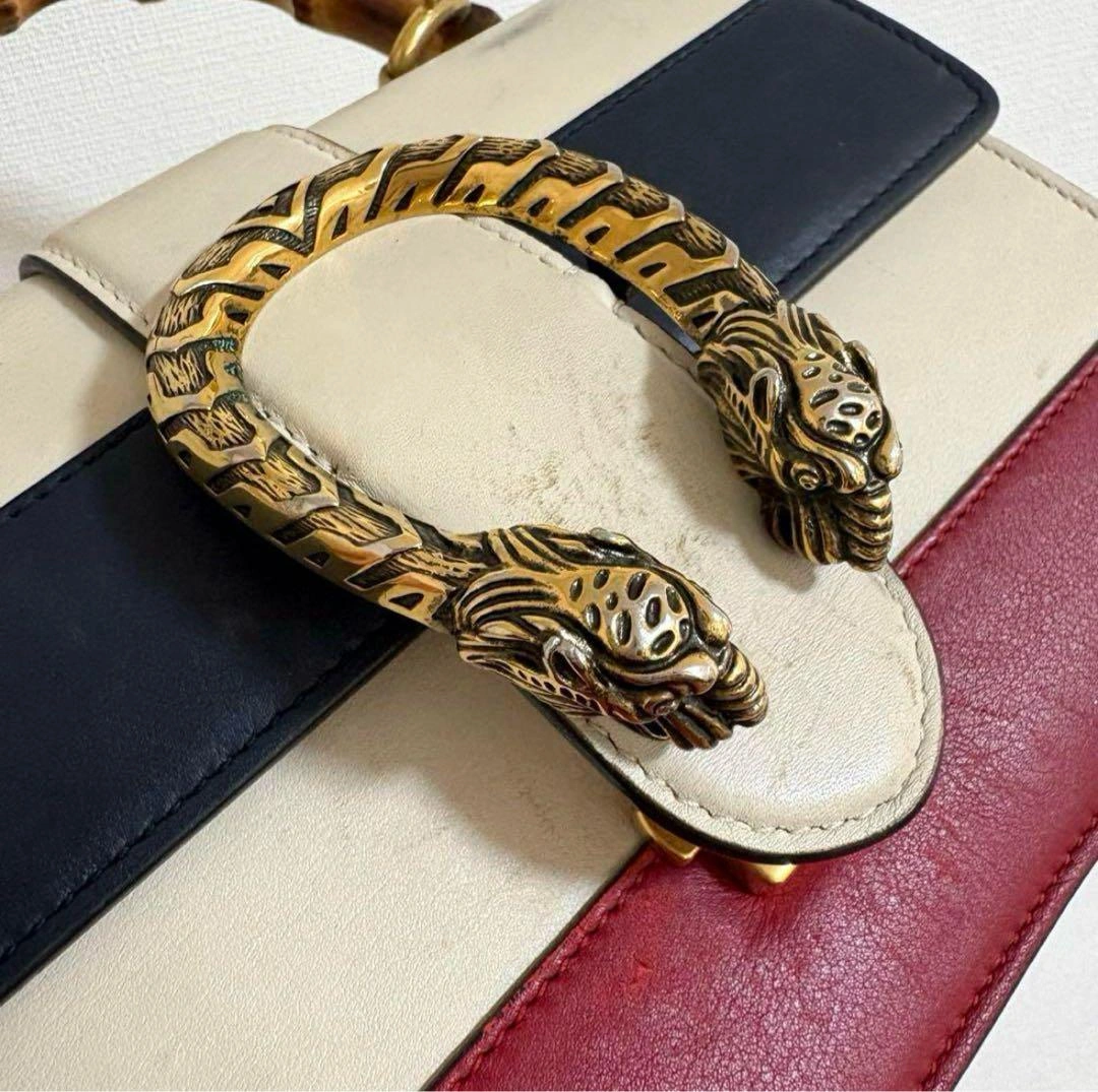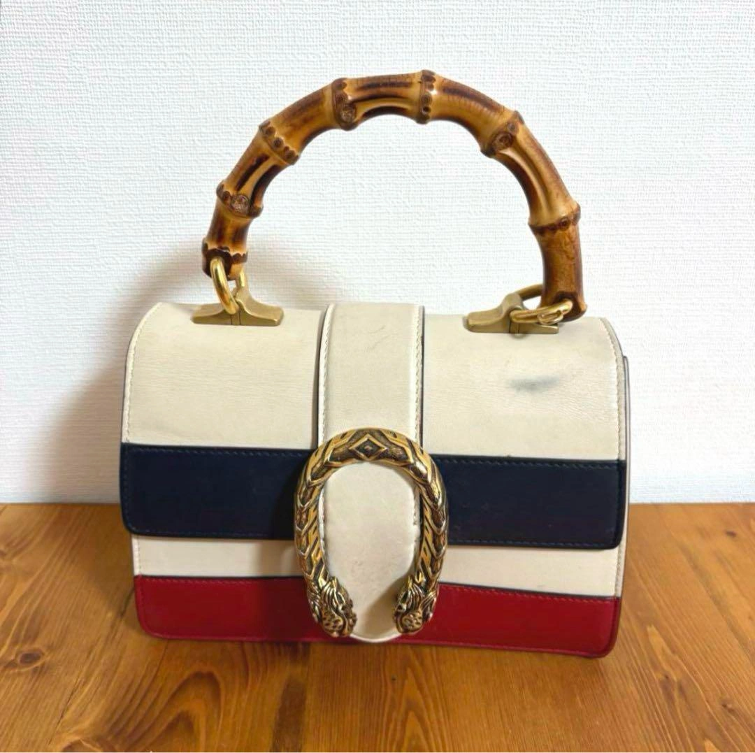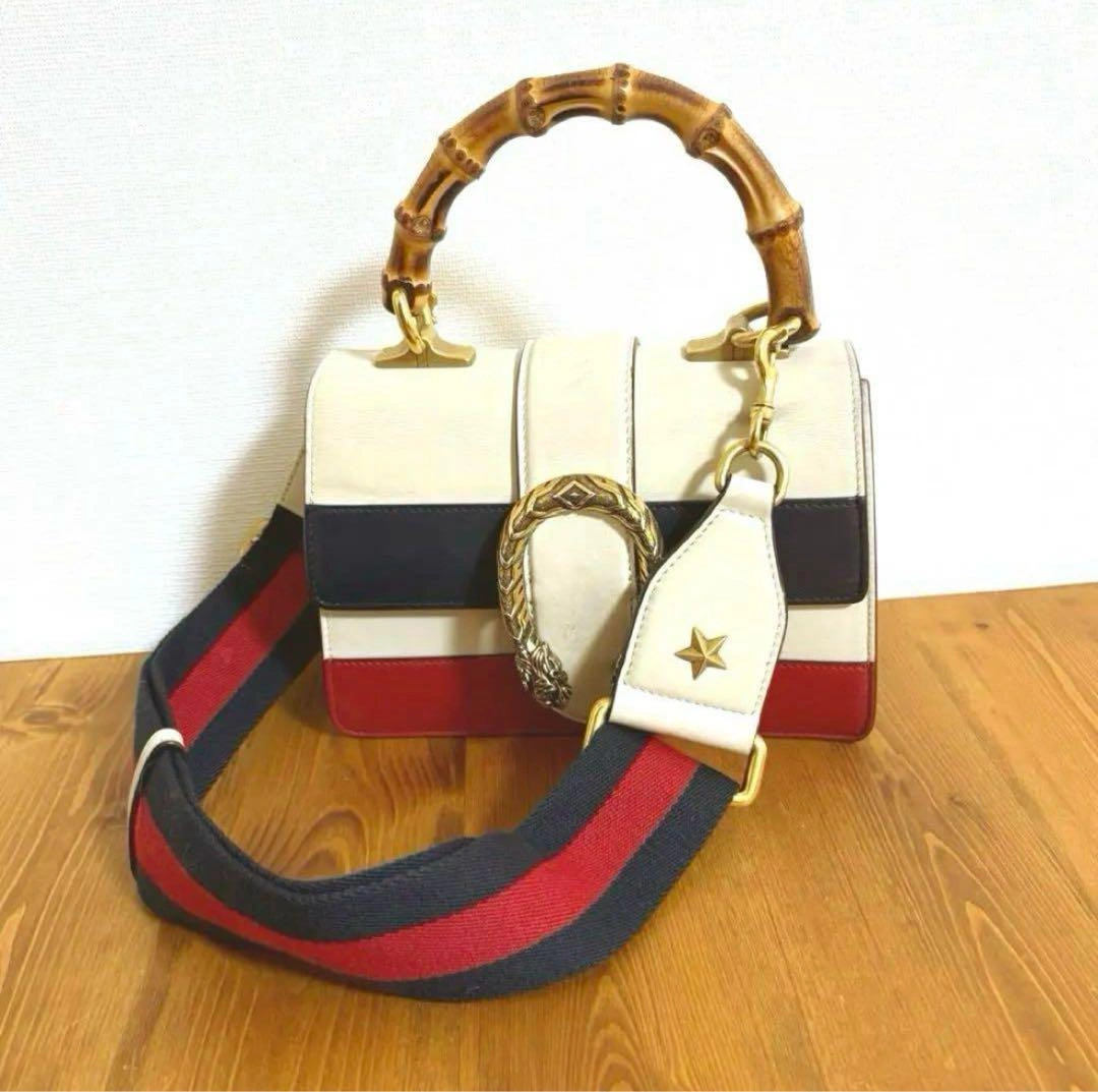 128,000円→ お値引き致しました! 【サイズ】 約 W20.5 × H14 × D7cm 【カラー】 アイボリー ネイビー レッド系 金属: ゴールド 【素材】 レザー 【詳細】 GUCCI(グッチ) DIONYSUS ディオニュソス 2way バッグ 銀座の正規店にて購入。 上品なミニバッグを飾るタイガーヘッドはギリシャ神話の神ディオニュソスに由来するモチーフ。神話では、ディオニュソスはゼウスが遣わした虎に乗ってティグリス河を渡ったと言われています。 ショルダーにもハンドバッグにもなる2way仕様でコーディネートや気分によって使い分けができます。 華やかなトリコロールカラーはコーディネートのアクセントに。バンブーの持ち手は上品で落ち着き感があります。 華やかなバックでフォーマルなパーティーにも、ベルトを付けてカジュアルにも使っていただけると思います。 【状態】 外側、内側、全体的に汚れございます。バンブーの持ち手の表面に細かなヒビが入ってますが、使用に問題はございません。 壊れはございませんので問題なくお使いいただけますが、タフに使った中古品・自宅保管のため、神経質な方はご遠慮下さい。気になる点は購入前にコメント下さい。 【その他】 大変気に入っていた物ですので、またどなたかにお使いいただけたら嬉しいです。使用感にご納得いただけましたらご購入ください。 突然商品を削除する可能性がありますので、気になりましたらお気軽にコメント下さいませ。 スモール トップハンドルバッグ ショルダーストラップ レア 希少