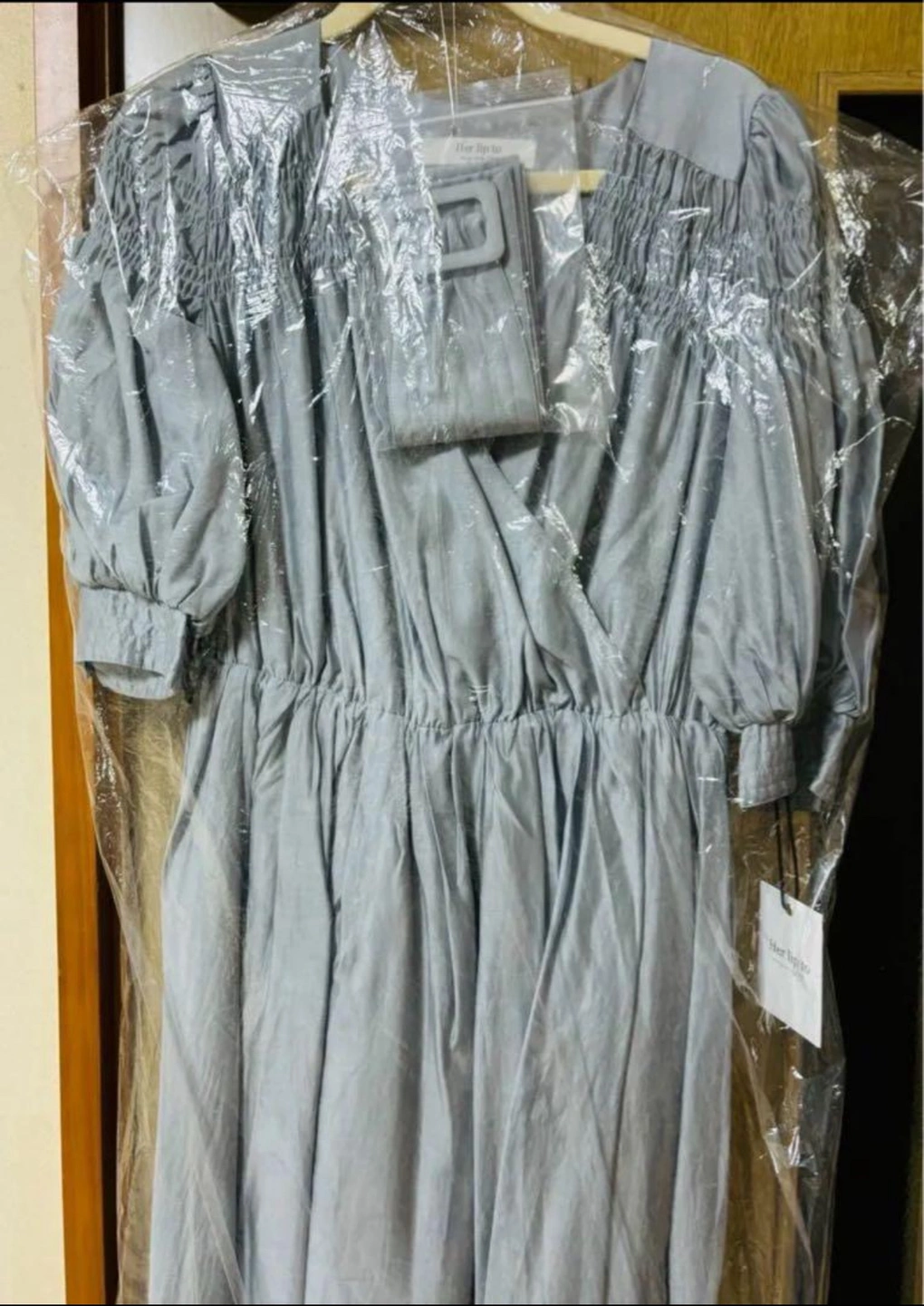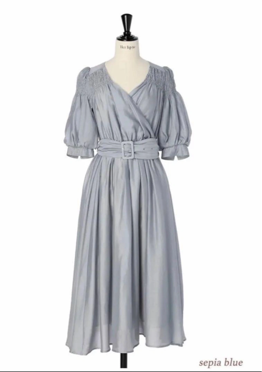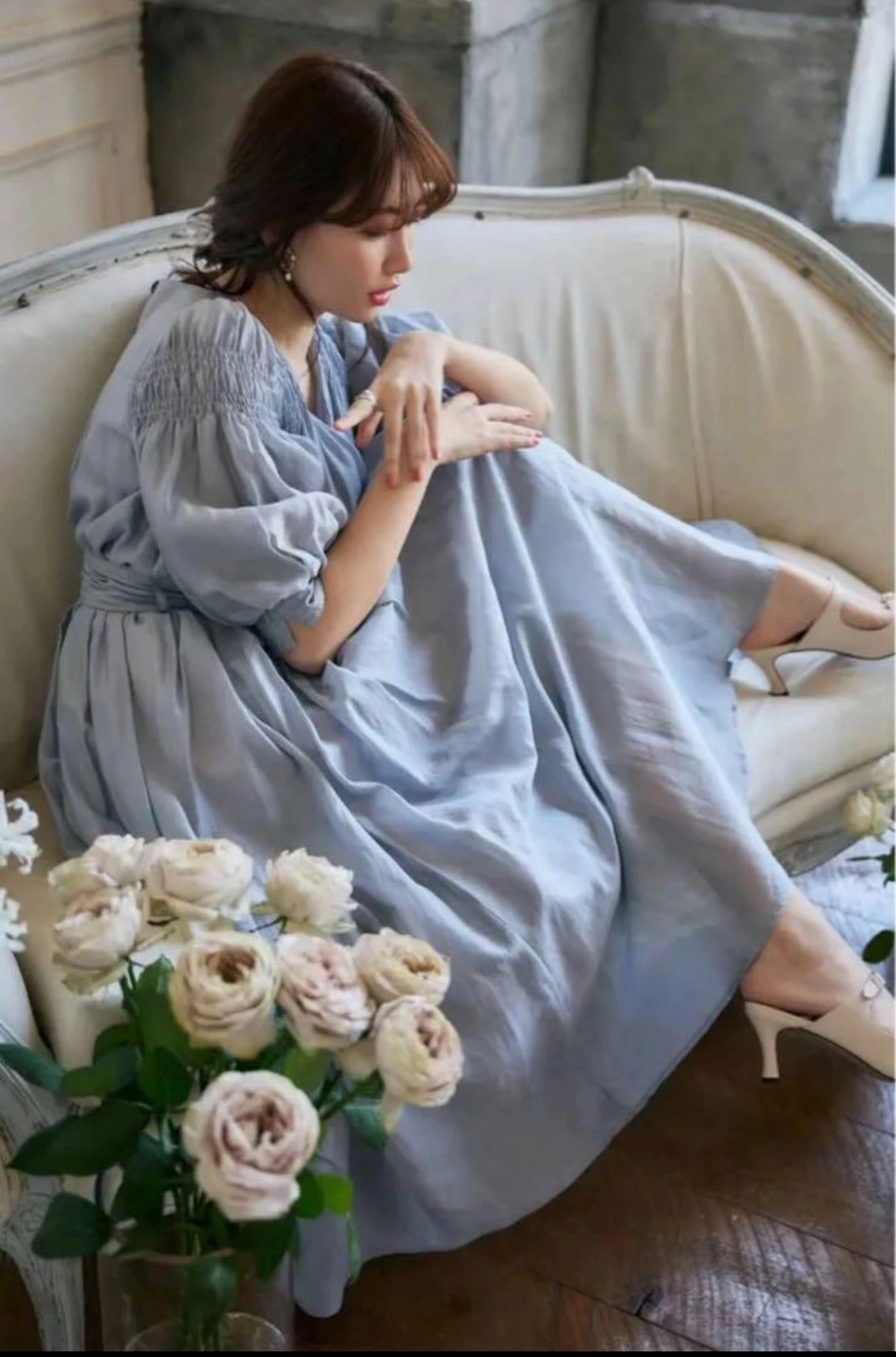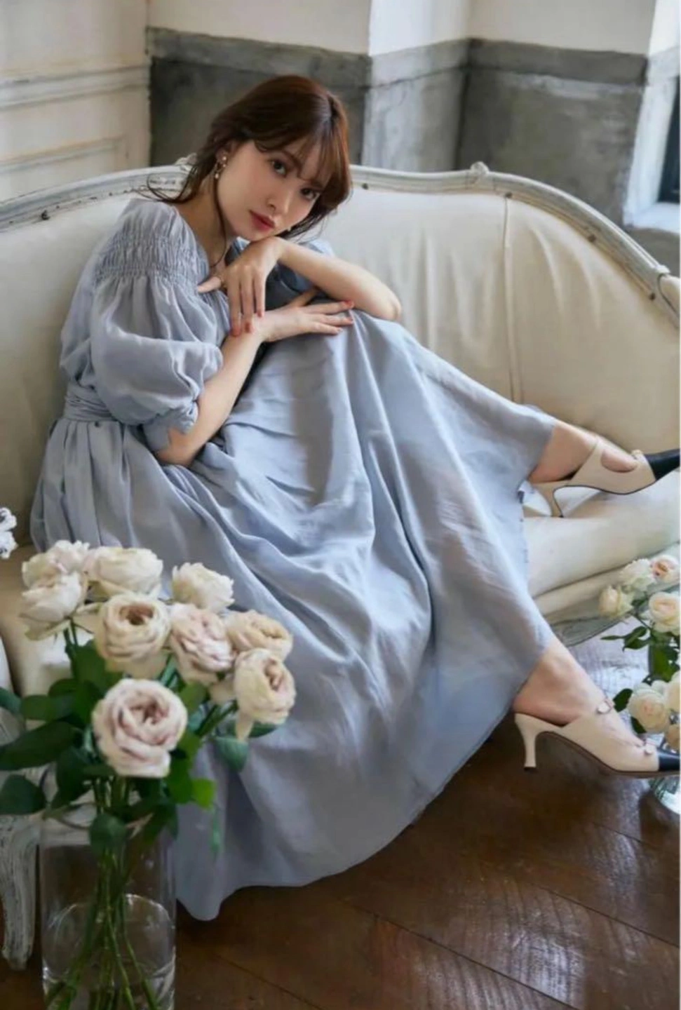 herlipto Airy Volume Sleeve Dress お色・セピアブルー size・M 【新品・未着用・タグ付き】 M[着丈:127/肩幅:34/バスト:114.6/ウエスト (ゴム上がり):72/ウエスト(最大):98](cm) 微光沢のある柔らかく軽やかな素材を使用した、女性らしさが漂う優雅な一枚です。 繊細なシャーリングディテールを肩と神に配し、洗練されたカラーとボリューム感のあるバルーンスリーブがフエミニンなムードを演出してくれます。