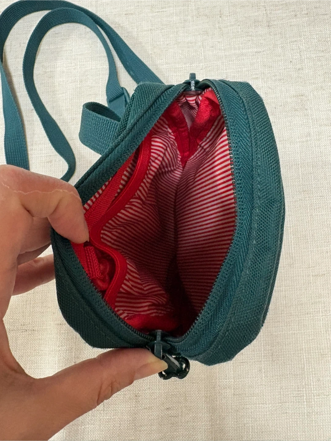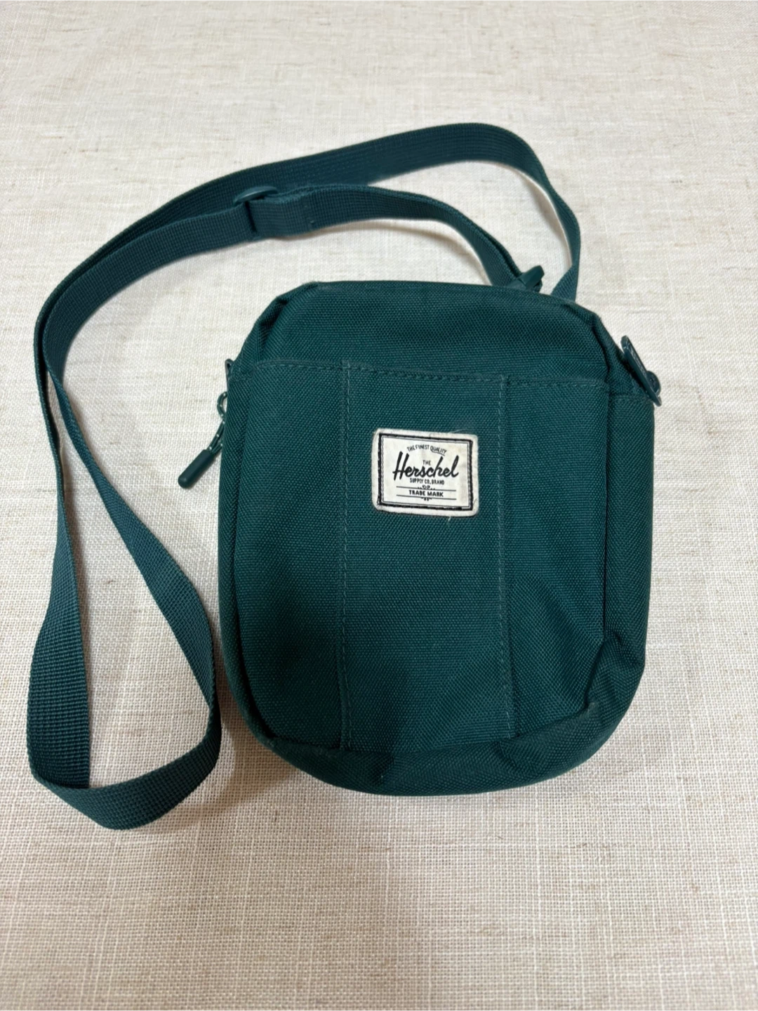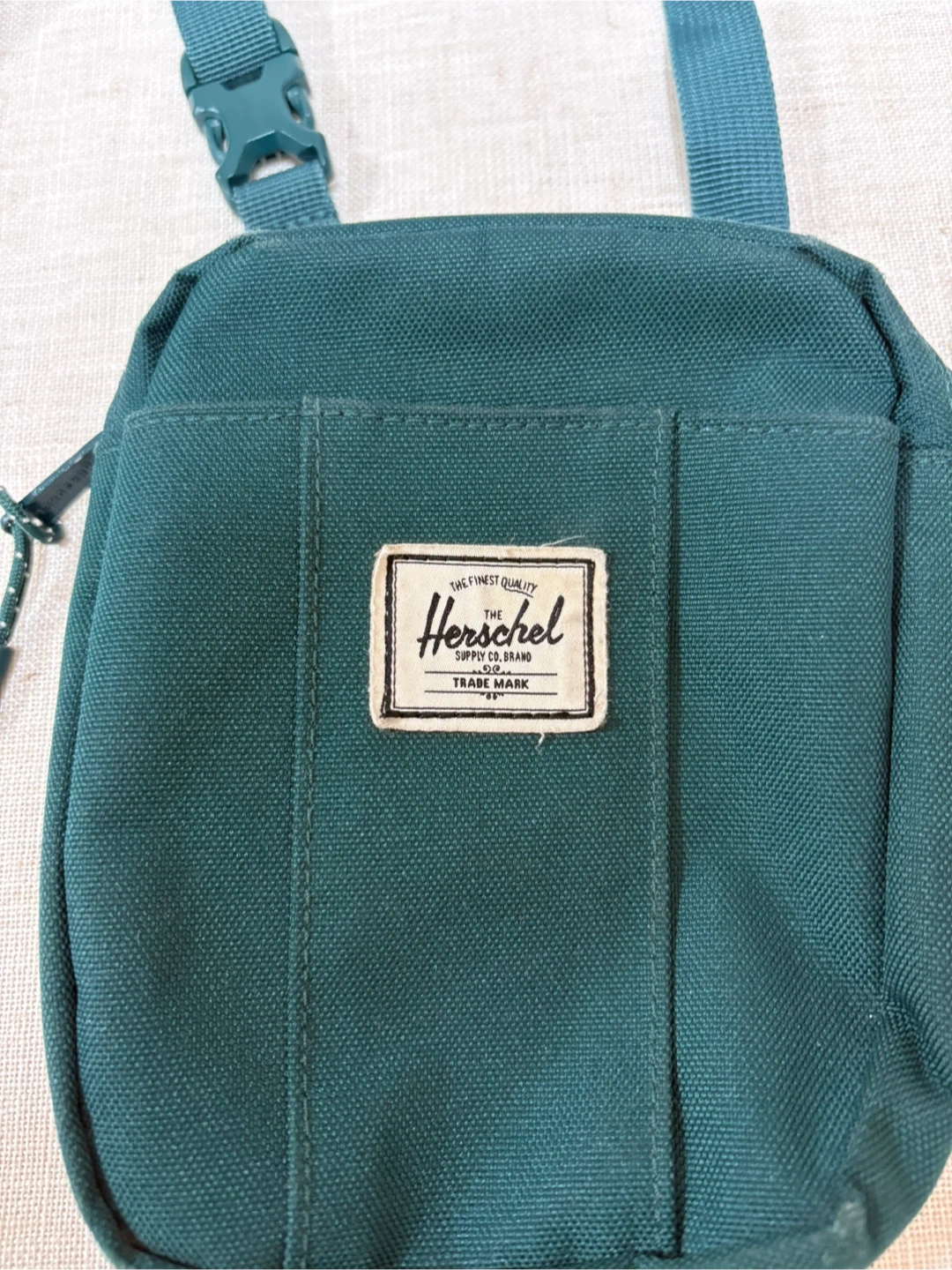 ハーシェルのショルダーバッグです。 ・カラー:グリーン ・内側は赤と白のストライプ柄 ・小さな汚れがあります 裏面に汚れあり写真がありますのでご確認下さい。 中古品であることご了承ください