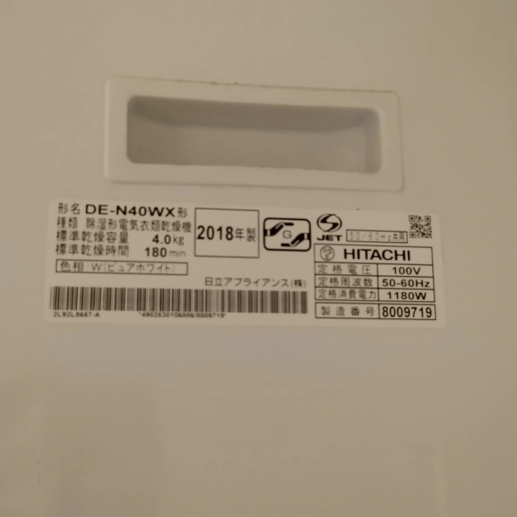 洗濯乾燥機を購入したので使わなくなりましたので出品しました。 動作に問題ありません。 フィルターや庫内もキレイかなと思います。 乾燥機用のラックもお付けします。 ラックは磁石がくっつくのでちょっとしたランドリーラック代わりにもなります。 【日立 衣類乾燥機 DE-N40WX】 乾燥容量(kg):4 外形寸法(cm): 幅63.0 ✕ 奥行43.9 ✕ 高さ67.0 おもさ(kg) : 約25 本体は持ってみると案外軽いです。 折りたたみキャリー等があれば誰でも運べると思いますので、必要とあれば私のキャリーをお貸ししても大丈夫です。 よろしくお願いいたします。