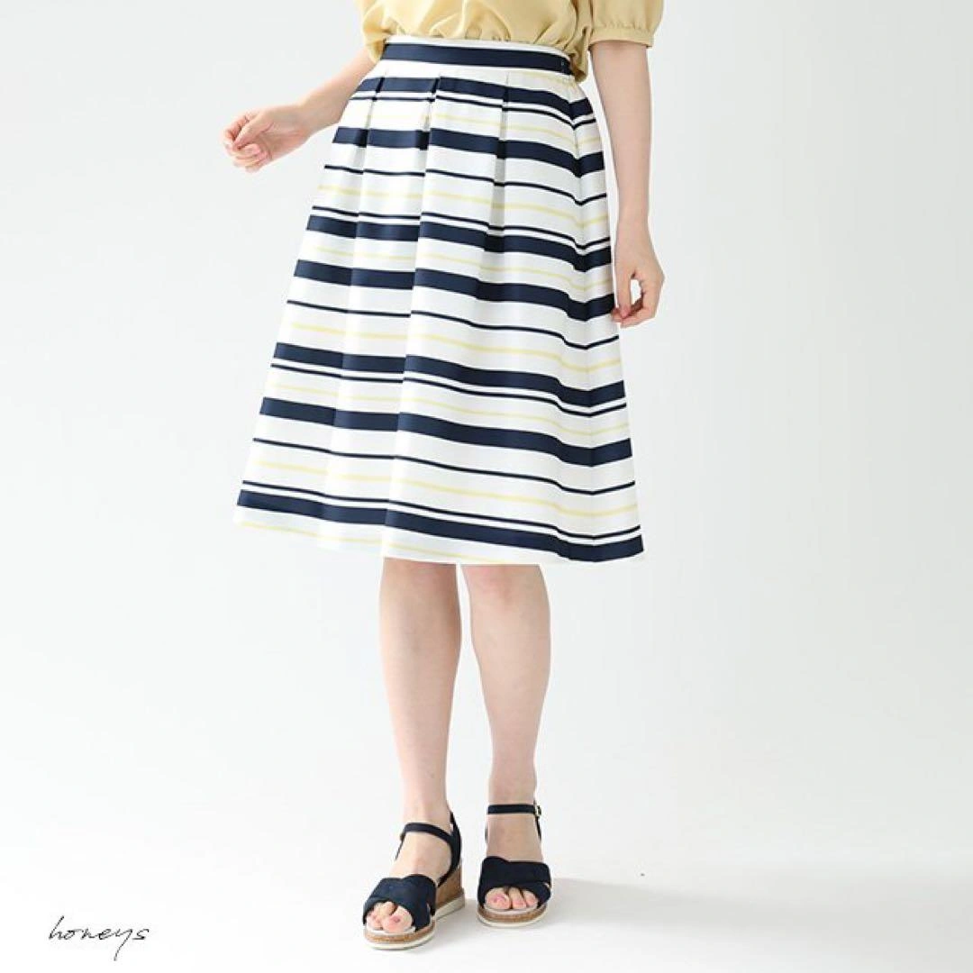 ご覧いただきありがとうございます。 Honeys(ハニーズ)のストライプ柄フレアスカート、ひざ丈です。 爽やかなストライプ柄とフレアシルエットで、カジュアルからオフィスカジュアルまで幅広く活躍します。 トップスを選ばず合わせやすいデザインで、春夏のお出かけにぴったりです。 •ブランド:Honeys(ハニーズ) •サイズ:M〜L相当 •カラー:ストライプ 紺、黄色、白 •状態:新品/未使用 •特徴:ひざ丈、フレアシルエット、ストライプ柄 デイリーコーデやお出かけコーデに、1枚で華やかさをプラスできるアイテムです。 ご希望の方はお気軽にご連絡ください。