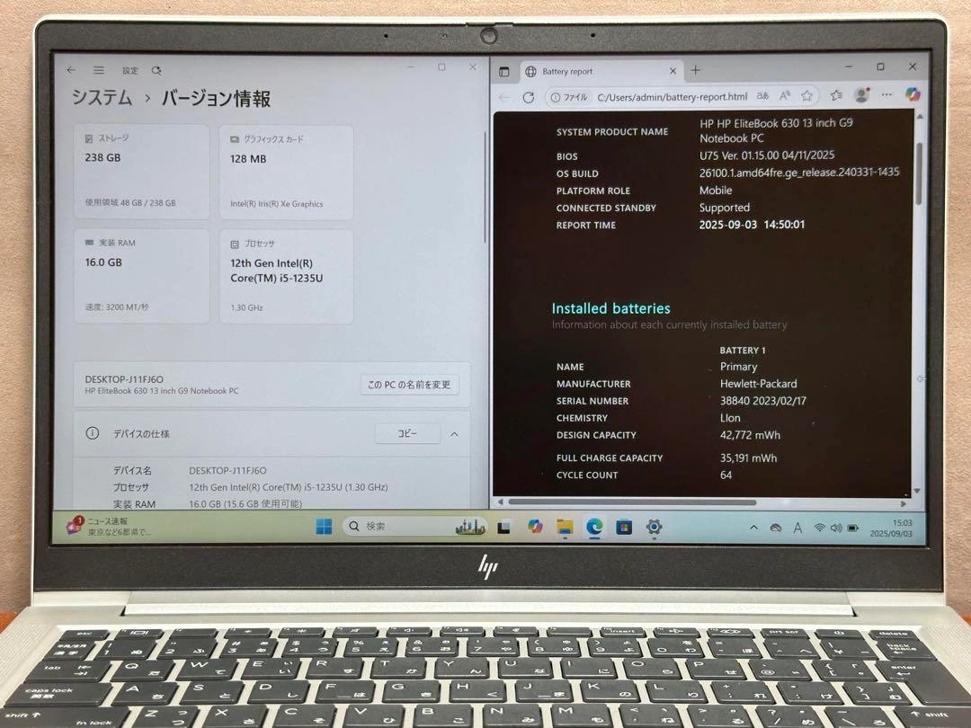 HP EliteBook 630 G9です。 ■スペック ・CPU: Core i5-1235U 第12世代 ・RAM: 16GB ・ストレージ: 256GB SSD M.2 PCIe ・ディスプレイ: 13.3インチ ・指紋認証、Webカメラ、WiFi, Bluetooth搭載 ・解像度: 1920x1080 ・OS: Windows 11 Pro ・Office付 ■状態 ・起動確認済。 ・設定は完了済み。 (中古品のため、バッテリーの寿命は保証できません。ご理解ください) ■外装・機能状態 外装状態: AB (軽い使用感あり) 液晶状態: B (軽度な白ムラや小さなキズなどが見られる場合がありますが、通常使用には問題ありません) 機能状態: A (基本動作はすべて正常。バッテリー消耗程度あり) 中古品のため、外観の状態は主観的な判断や見落としがある場合がございます。写真でご確認ください。 ■付属品 本体、ACアダプタ、電源コード 初期不良の場合、到着後2週間以内にご連絡ください。 ご不明点はお気軽にお問い合わせください。