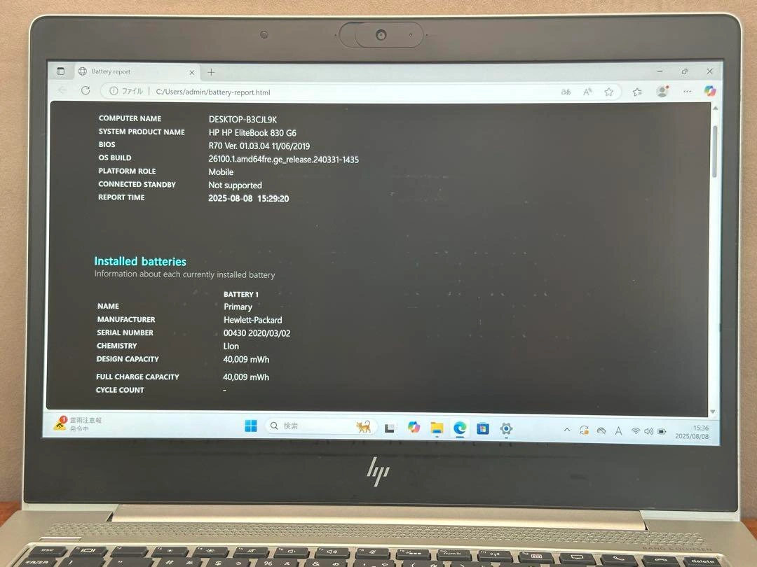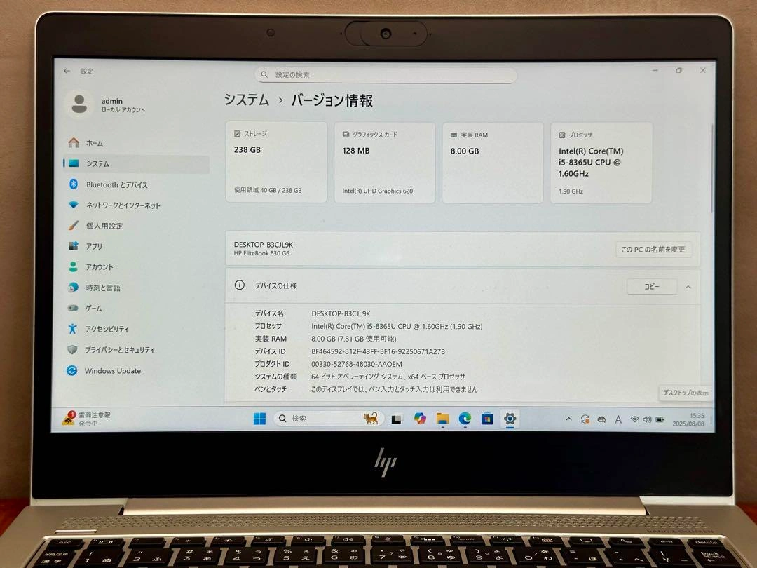 HP EliteBook 830 G6です。 ■スペック ・CPU: Core i5-8365U 1.6GHz, ターボブースト: 4.1GHz ・RAM: 8GB 2400MHz ・統合グラフィックス: Intel UHD Graphics 620 ・ストレージ: 256GB SSD M.2 PCIe ・ディスプレイ: 13.3インチ ・指紋認証 ・Webカメラ搭載 ・WiFi, Bluetooth搭載 ・解像度: 1920x1080 ・OS: Windows 11 Pro ・Office付 ■状態 ・起動確認済です。設定は全て完了済み。 (中古品のため、バッテリーの寿命は保証できません。ご理解ください) ■外装・機能状態 【外装状態】B : 良品 : 小さなキズや擦れあり。動作に問題なし。 【液晶状態】B : 軽度な白ムラや小さなホワイトスポット、微細なキズ、薄いシミなどが見られる場合がありますが、通常使用には問題ありません。 【機能状態】A : 機能良好。基本動作はすべて正常。軽微な経年劣化: バッテリー消耗程度あり。 ・中古品かつ個人での検品のため、外観の状態は主観的な判断や見落としがある場合がございます。予めご了承ください。 ・状態は写真でご確認ください。 ■付属品 本体、ACアダプタ、電源コード 初期不良の場合、到着後2週間以内にご連絡ください。 不明点はお気軽にご質問ください。 ご検討よろしくお願いいたします。