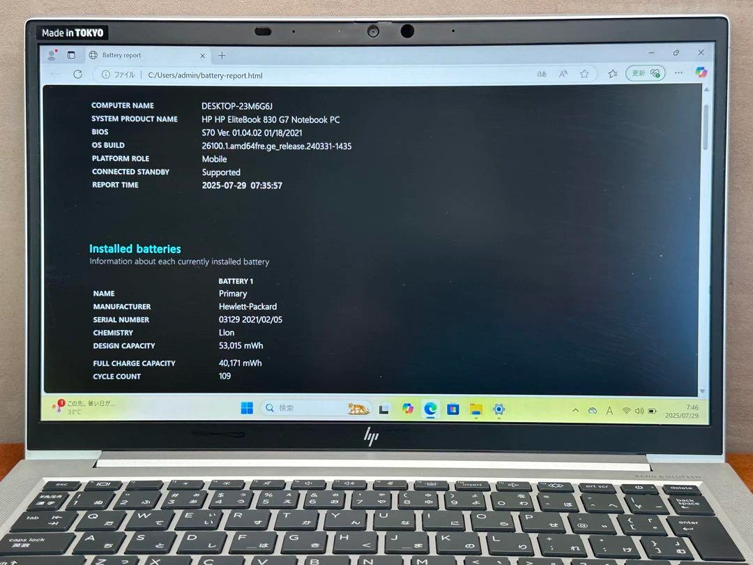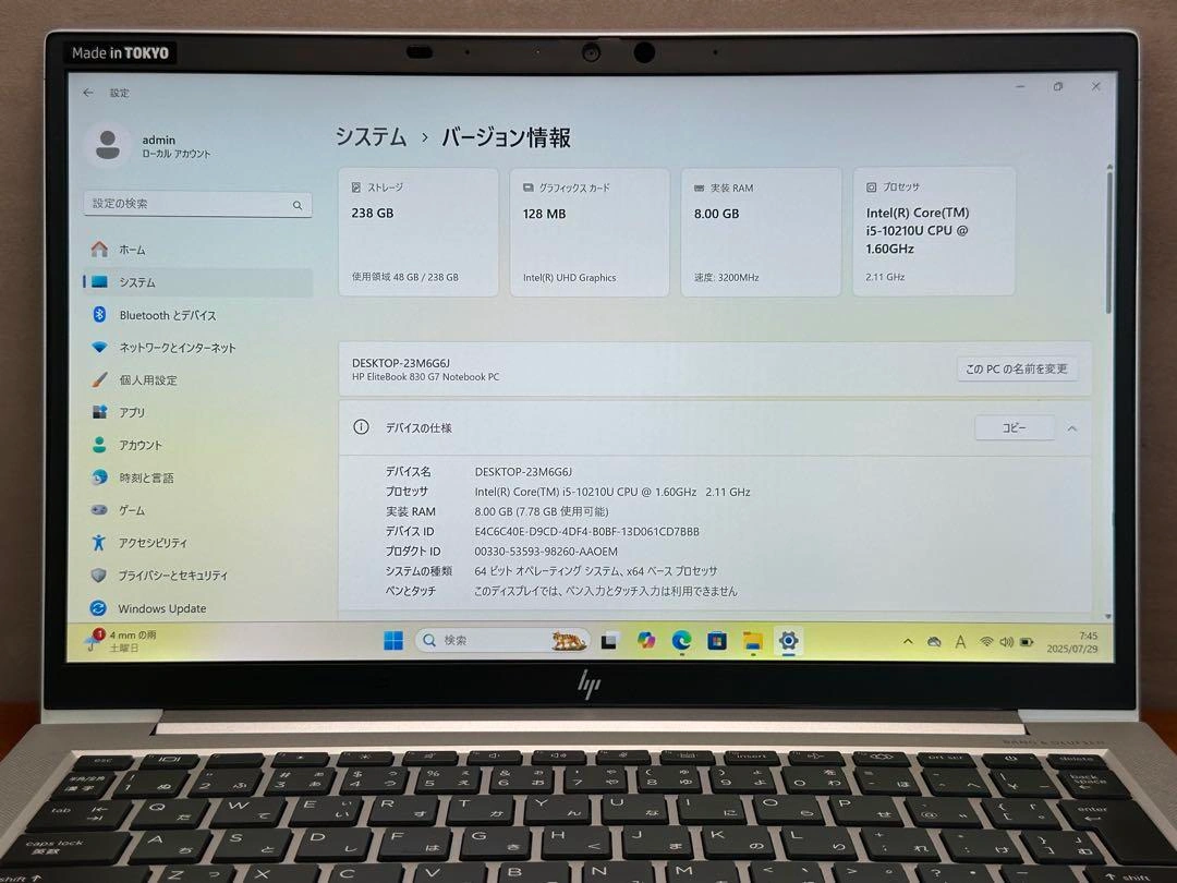 HP EliteBook 830 G7です。 ■スペック ・CPU: Core i5-10210U 1.6GHz, ターボブースト: 4.2GHz ・RAM: 8GB 3200MHz ・統合グラフィックス: Intel UHD Graphics ・ストレージ: 256GB SSD M.2 PCIe ・ディスプレイ: 13.3インチ ・指紋認証 ・顔認証 ・Webカメラ搭載 ・WiFi, Bluetooth搭載 ・解像度: 1920x1080 ・OS: Windows 11 Pro ・Office付 ■状態 ・起動確認済です。 ・設定は全て完了しておりますので、すぐにご使用頂けます。(本品は中古品なので、バッテリーの寿命は保証できません。ご理解の上でご購入下さい) ■外装・機能状態 【外装状態】AB : だいたい綺麗(良品): 軽い使用感ありだが、全体的に綺麗 【液晶状態】A : 綺麗な状態。ドット抜けはなく、微細なキズがある場合がありますが、目立たず使用に支障はありません。 【機能状態】A : 機能良好。基本動作はすべて正常。軽微な経年劣化: バッテリー消耗程度あり。 ・中古品かつ個人での検品のため、外観の状態につきましては主観的な判断や見落としがある場合がございます。予めご了承ください。 ・ご入札前に商品の状態を写真でご確認ください。 ■付属品 本体、ACアダプタ、電源コード ■保証期間: ・初期不良の場合、到着後2週間以内にご連絡ください。 ・C、D、 Jランクのものは一律保証無し商品となりますのでよくご確認ください。 ・不明点がございましたら、ご購入の前にご質問をお願い致します。 ご検討よろしくお願いいたします。