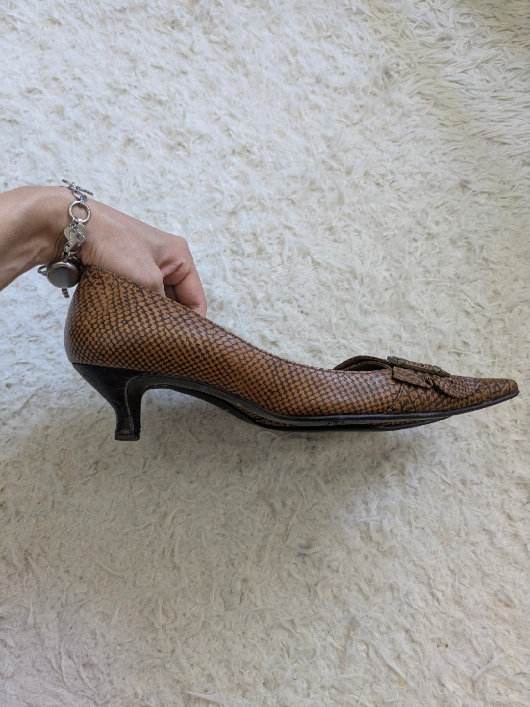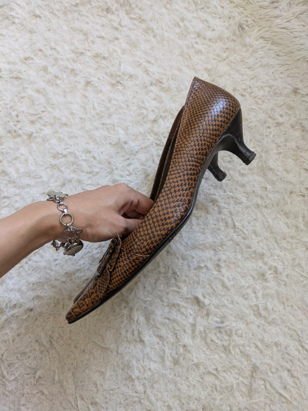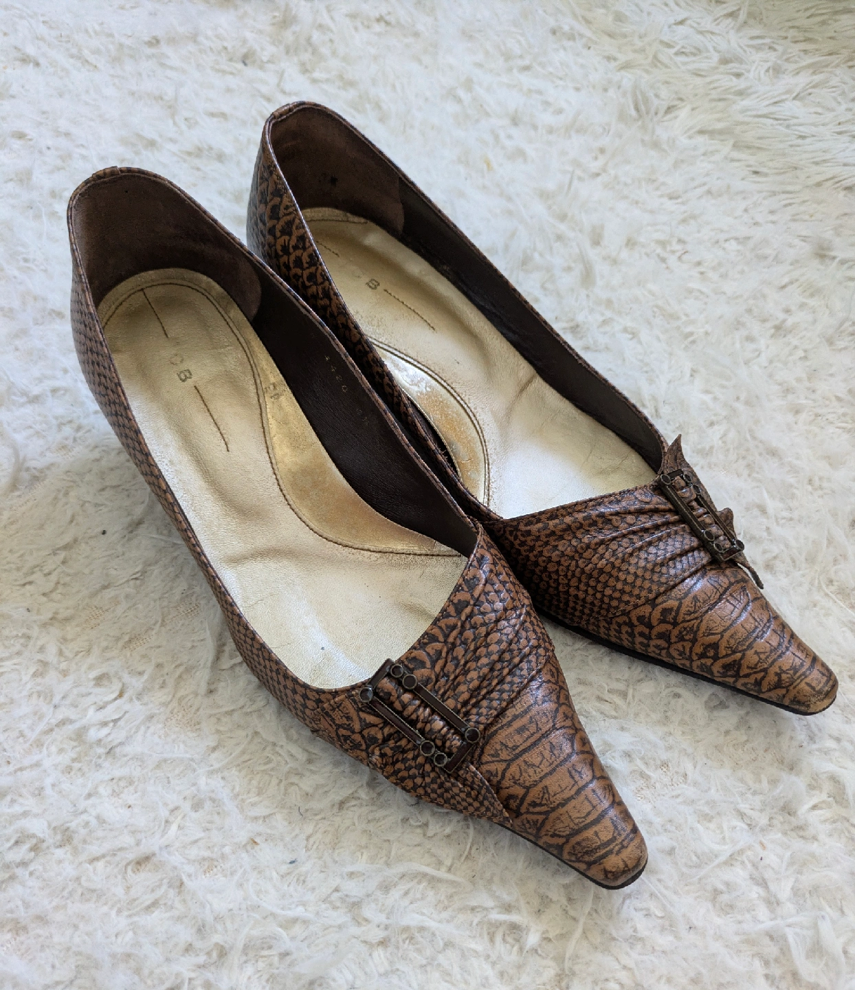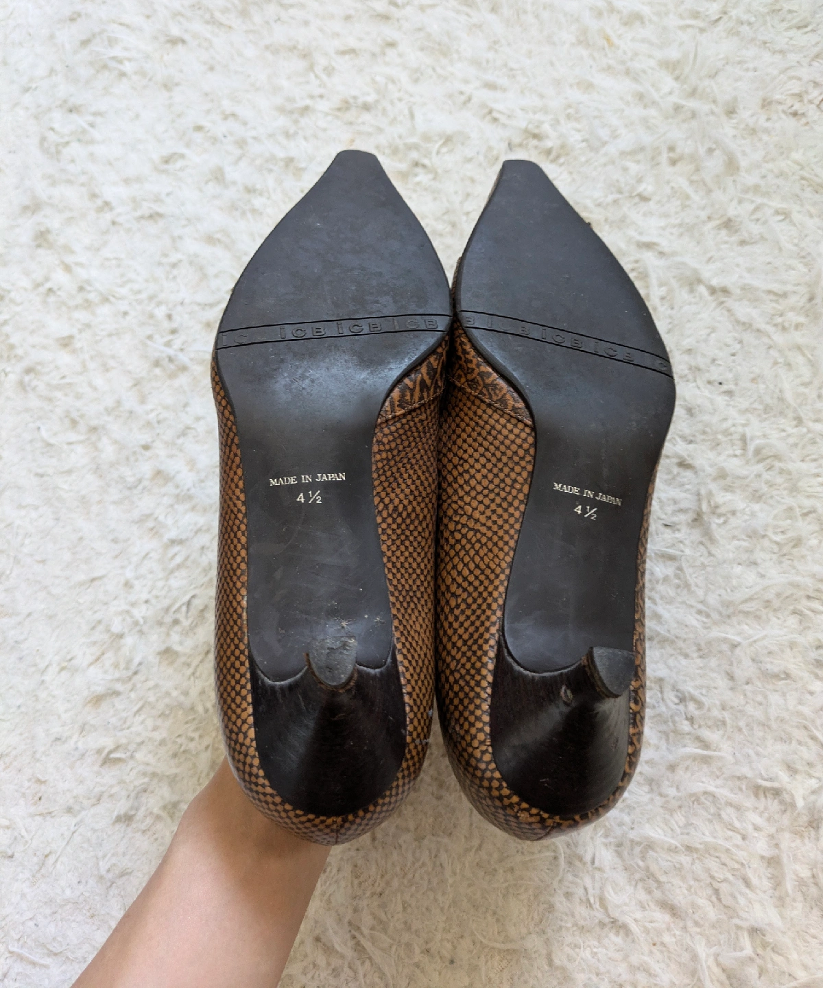 ICBのクロコダイルパンプスです☆ 松屋銀座で購入しましたが、可愛くて買ったものの、ヒールを履かなくなってしまったので出品します。 ポインテッドトゥにクロコの押し型が大人っぽく、落ち着いていてエレガントな色気のあるデザインです。 ローヒールなので、ヒールに慣れていない方でも安心して着用していただけると思います。 クロコダイル仕立てで、足馴染みがよく、汚れなどが付着しても拭き取れます。ダークブラウンの落ち着いたカラーで、シンプルかつ上品なデザインで、カジュアルからビジネスまで幅広く活躍します。 ヒール高さ:約4.5cm サイズ:23.5㎝ MADE IN JAPAN 購入価格:20.000円相当 【商品説明】 多少の使用感ありますが、目立った傷や汚れなく、状態良いです。 お写真にてご確認ください。 ※自宅保管品をご理解の上、ご購入をお願い致します。 通勤 オフィス ビジネス セレモニー リゾート 旅行 デート パーティ 結婚式 入学式 入園式 卒業式 卒園式 銀座カネマツ かねまつ 卑弥呼 ダイアナ ピンキー&ダイアン