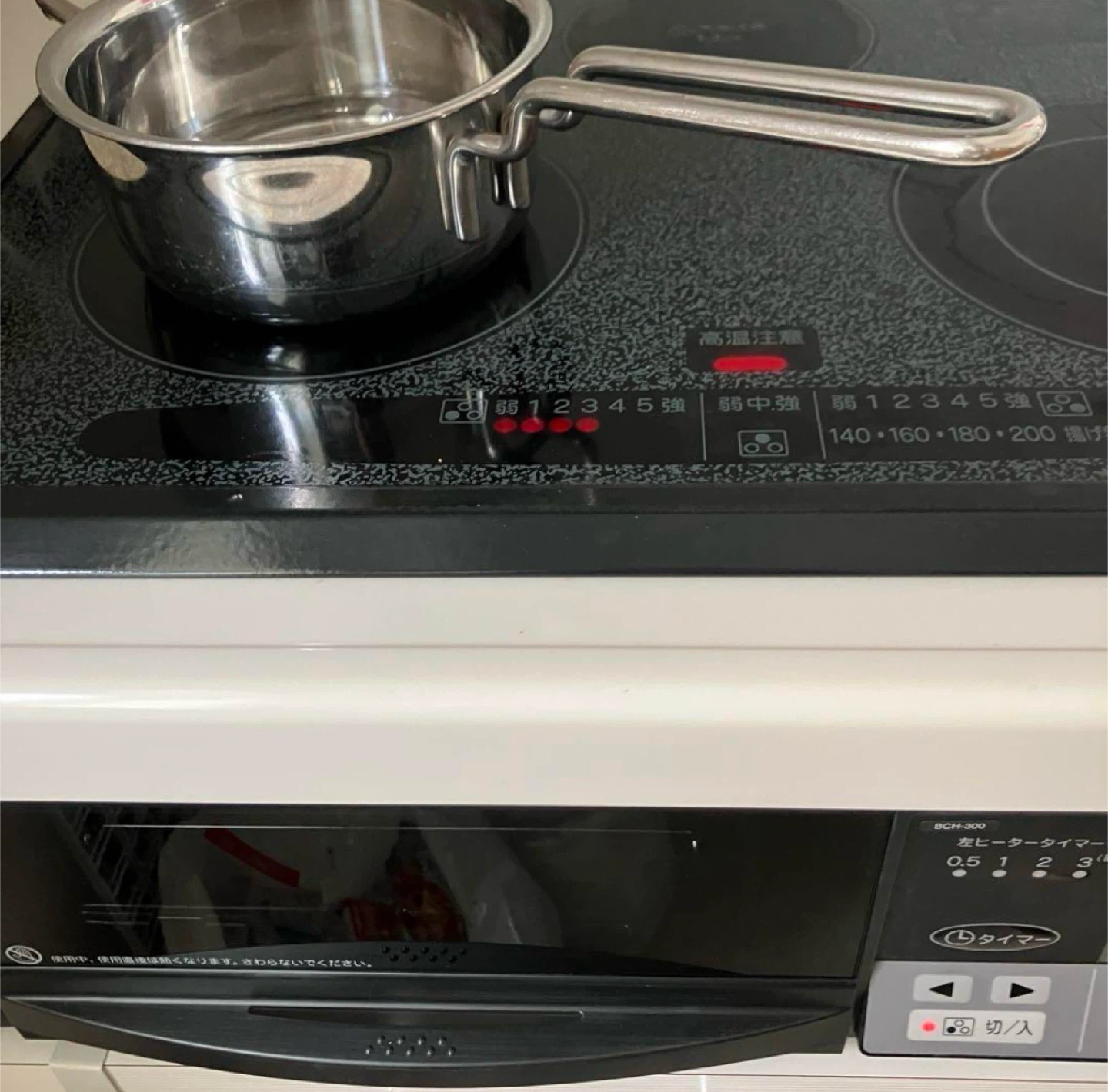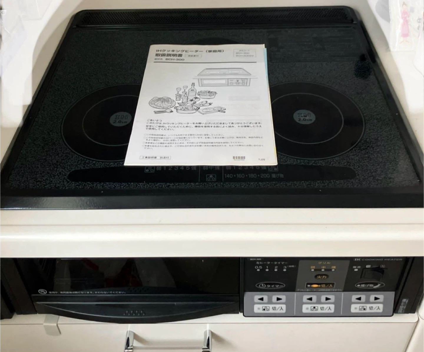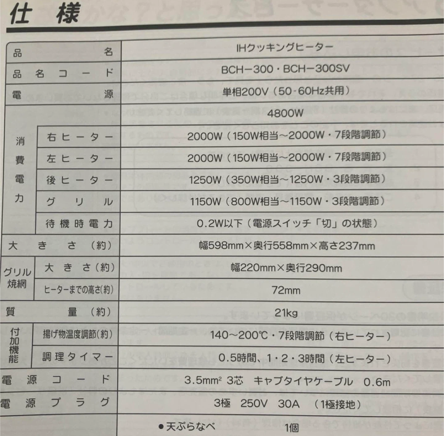 IHクッキングヒーターです。 メルカリで買ったのですが電源の元が 家のと合わなかったため出品します。 買ってから1度も使用しておりません。 11月後半からしばらくの間、 仕事で遠くの方に出張に行ってしまい 取引が難しくなってしまう為急ぎで出品致します。 値段交渉は出来ますのでその際は 言って貰えたらと思います。 よろしくお願い致します。 【情報】 型番:BCH-300 ブランド:IH COOKING HEATER 【状態】 使用感はありますが、目立つキズはありません 中古品であることご了承ください 前の所有者様のものなので、詳しいことはわかりません。画像のとおり、綺麗に清掃されてありますが、経年による小傷などがあります。中古品にご理解のある方にお願いいたします。 画像に写っているものが全てです。 どうぞよろしくお願いいたします。 右ヒーター 2000W(150W相当〜2000W・7段階調節) 左ヒーター 2000W(150W相当〜2000W・7段階調節) 後ヒーター 1250W(350W相当〜1250W・3段階調節) グリル 1150W(800W相当〜1150W・3段階調節) 大きさ(約) 幅598mm×奥行558mm×高さ237mm 電源コード 3.5m㎡ 3芯 キャブタイヤケーブル 0.6m 電源プラグ 3極 250V 30A(1極接地)