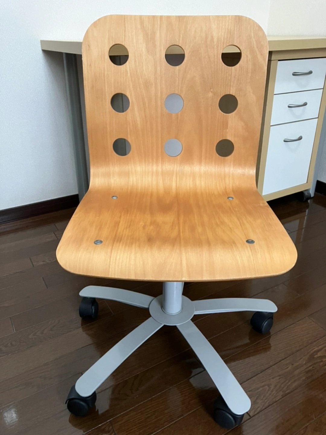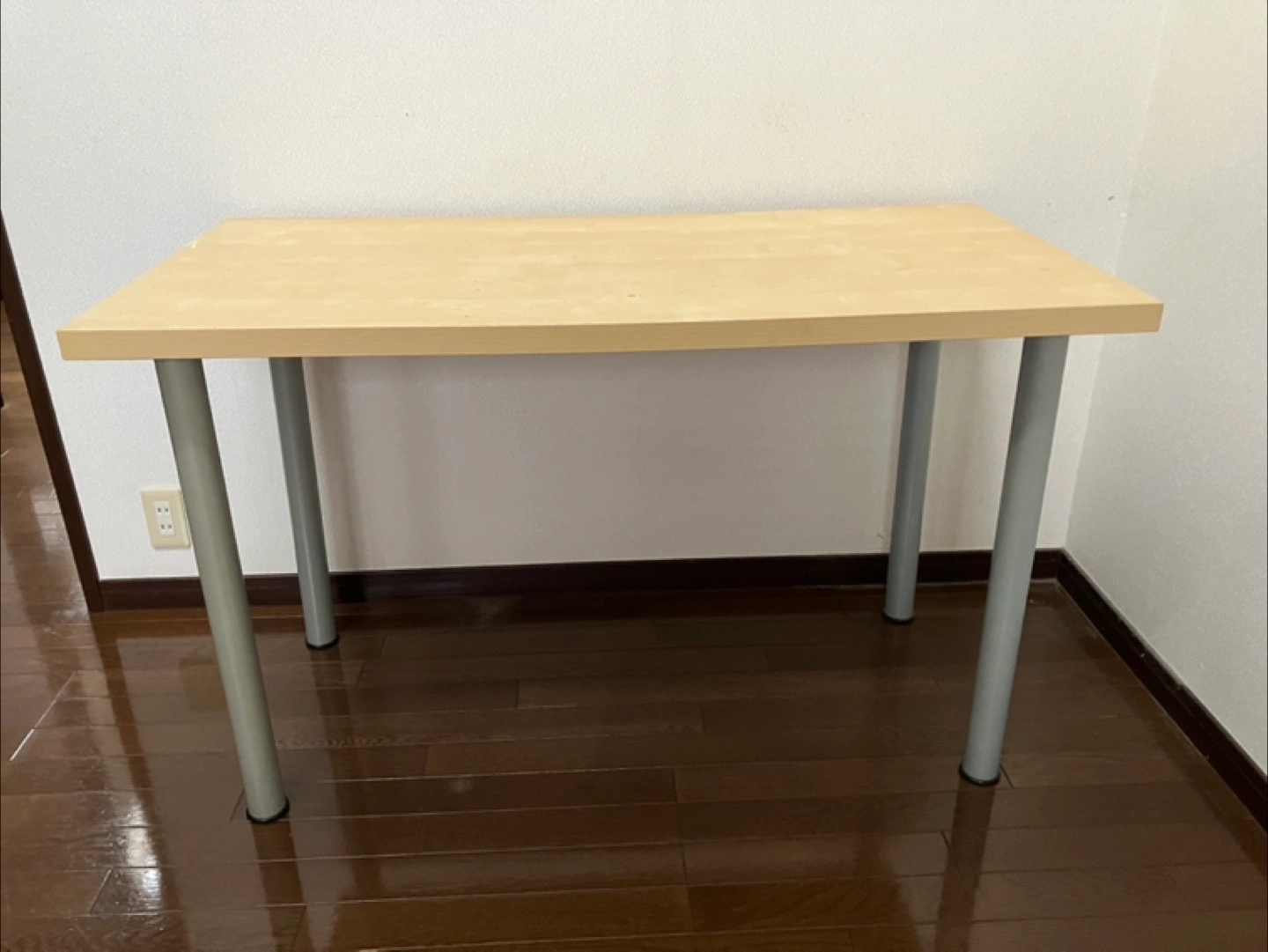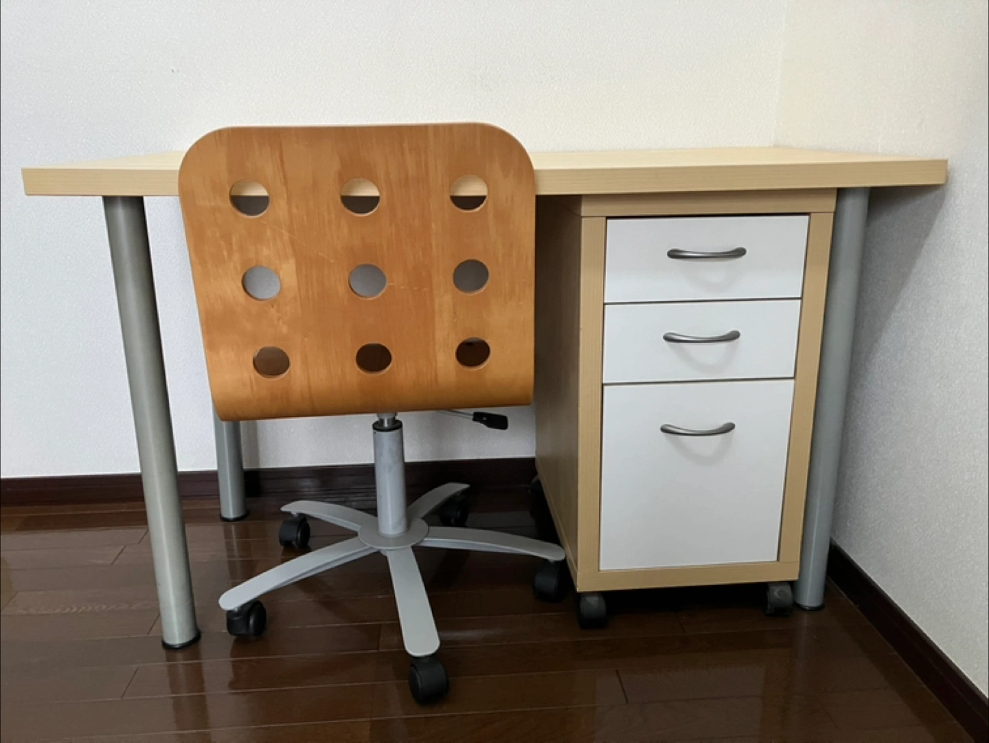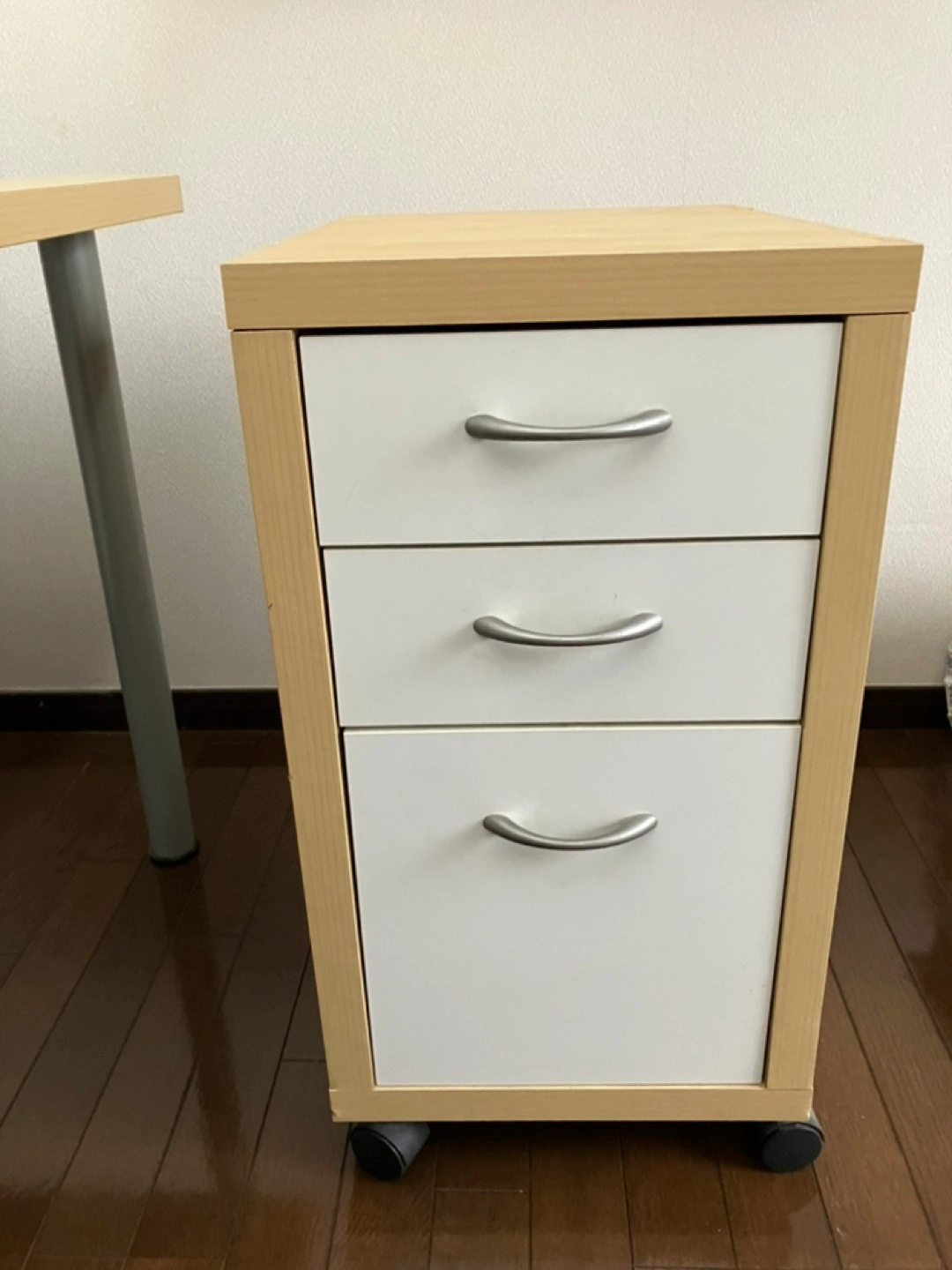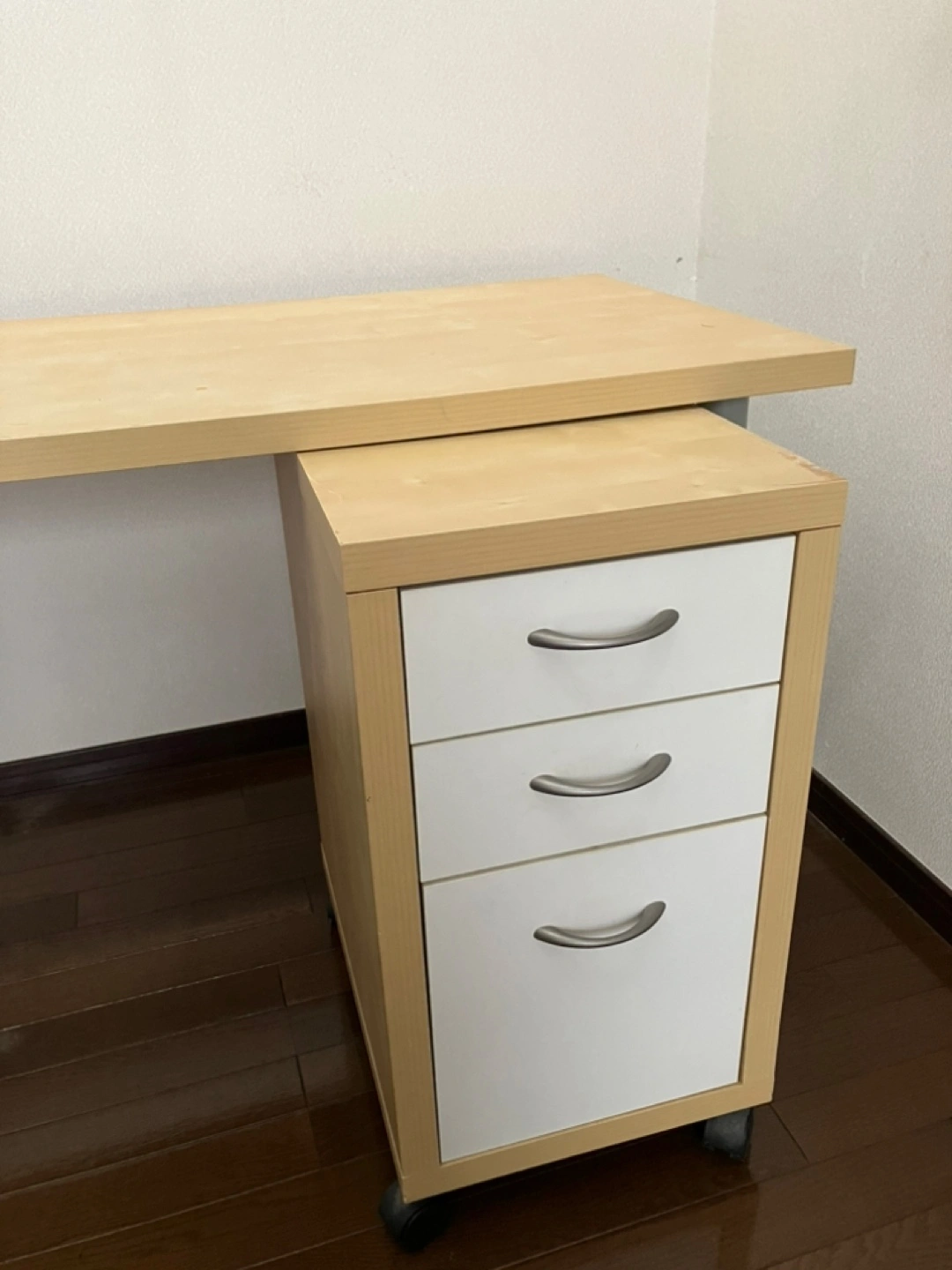 ・全てIKEAの製品です。 ・机のサイズ 60,120,高さ73センチ ・引き出しのサイズ 50,37,高さ69センチ ・机のテーブル面に、いくつか傷(表面が剥がれた部分)があります。(写真5、6枚目参照)最大で1センチほどの大きさです。 ・机は大人1人で持てる重さです。 ・引き出しはキャスター付き。引き出しの中に仕切りなどは無し。 ・椅子はキャスター付き。レバーを使って高さ調整可能。(写真10枚目参照) ・机、引き出し、椅子の3点セットですが、机だけ欲しいなどのバラでのお渡しも可能です。 ・お車でお越し下さい。(バイク不可)