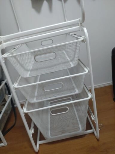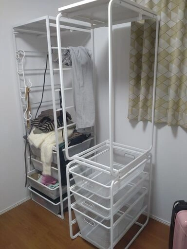写真手前の何もかかっていないほうのラックです。 上段はハンガーラックになっていて、下段は引き出しになっています。 重さはそれほど重くはないです。 上段と下段が外れるようにはなっている(4枚目の写真参照)のですが、固くて自力では外せませんでした。。 墨田4丁目の子育地蔵尊近くの自宅にて引き取っていただける方でお願いいたします。 10月中に問い合わせがない場合は粗大ごみに 出すので、気になる方はお早目にお願いいたします。
