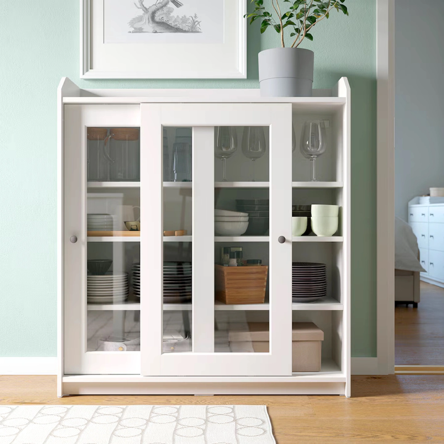 【ブランド】IKEA(イケア) 【カラー】ホワイト 【サイズ】 幅: 105 cm 奥行き: 36 cm 高さ: 116 cm 棚板1枚あたりの最大荷重: 10 kg 【参考価格】22,990円 1台だけで、またはHAUGA/ハウガ シリーズのほかの家具と組み合わせて、家中どこにでも使えます。このガラス扉付きキャビネットには、お気に入りのアイテムをホコリから守りながらディスプレイできます。ダイニングルームの食器棚に最適。 1年ほど使用しました。 お探しの方にお譲りします。