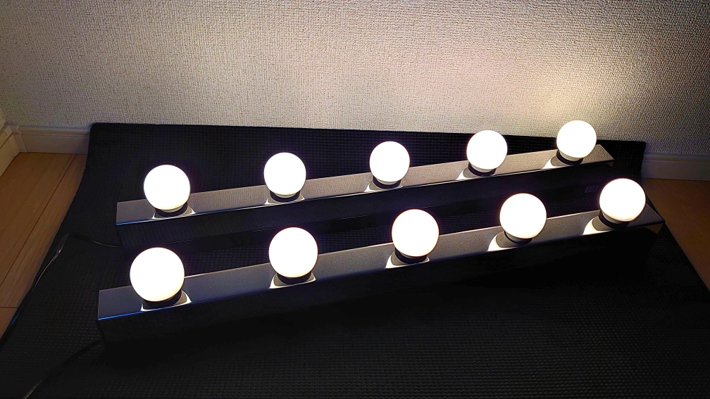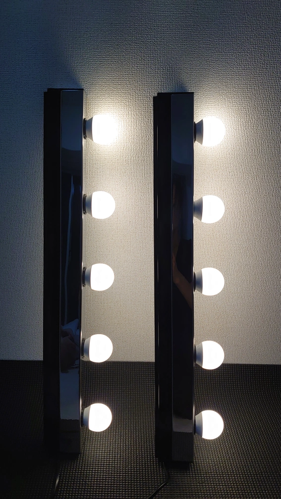 IKEAのウォールランプ2個セット ●MUSIK (ムシーク )ウォールランプ ●暖色系の電球10個付き ●幅60cm /奥行6.4cm /高 さ3.7cm ● コード長さ2.2m ●壁に固定するネジは付属なし ●縦横とちら向きでもOK ●電球は各5つ並び(写真タップ) 壁美人(跡のつきにくいネジ)を使用して 賃貸の壁に設置。机の前の壁の一枚鏡の左右に設置して、勉強机兼ドレッサーとして使用。とてもきれいです。女優ライトと言われるだけありました! ●1年程使用。 ●通電確認済み。 ●ペットなし/非喫煙環境 可能な限り除菌清掃いたしましたが、中古品のため細かい擦り傷とうございます。ご了承下さい。 お渡しは九段下駅、靖国神社/武道館方面出口の改札付近はいかがでしょうか?日時等、何でもご相談下さい。 どうぞよろしくお願いいたします。