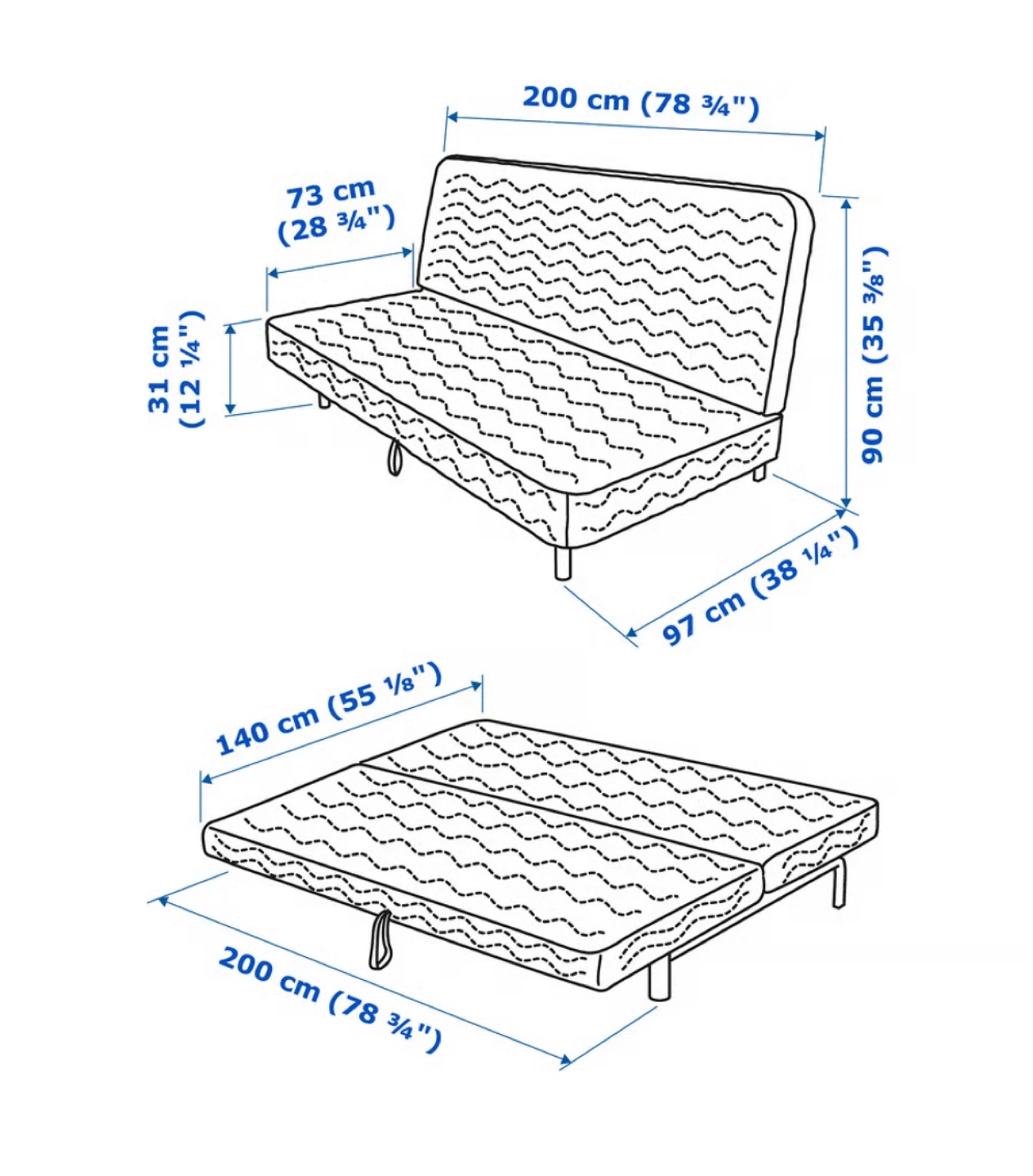 IKEA のソファーベッドです。 4年前に購入しました! ⚪︎マットレスは付属しない予定です!  宜しければ、IKEAで別売りの  【NYHAMN ニーハムン/フォームマットレス】  を購入下さい。 ⚪︎カバー(写真のグレー)は  付けさせていただきます! ________ 【商品の詳細】 シートを持ち上げて背もたれを倒せば、 簡単にソファから広々とした ベッドに早変わりします。 カバーを取り外さずに、 ソファからベッドへ切り替えたり、 またソファに戻したりできます。 シート下のスペースには ベッドリネンなどをしまえる 収納ボックスがぴったり収まります。 さまざまなタイプのマットレスと 豊富にそろったカバーの中から 好みのものを選んで、 自分にぴったり合った コンビネーションをつくりましょう。 別売りのカバーで、 手軽に模様替えが楽しめます。 カバーは取り外して洗濯機で洗えるので、 お手入れが簡単です。 【サイズ】 幅: 200 cm 奥行き: 97 cm 高さ: 90 cm シートの奥行き: 73 cm シートの高さ: 31 cm ベッド幅: 140 cm ベッド長: 200 cm 中古品であることご了承ください! 引き渡し場所は近場で! ※大型商品のため車での搬出入可能か お確かめの上購入お願いします。 気になることがあれば お気軽に連絡ください。