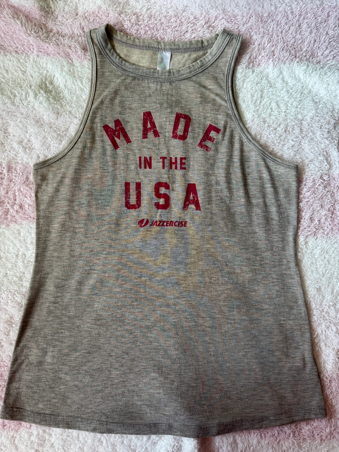 MADE IN THE USAのプリントが特徴のグレーのタンクトップ。 - 色: グレー - デザイン: MADE IN THE USAのプリント - ブランド: JAZZERCISE - スタイル: タンクトップ - サイズ: S ご覧いただきありがとうございます。 細かい毛玉がありますが、グレーなのであまり目立ちません。 1カ所、1.5cmほどほつれがありますので、中古品であることをご理解いただける方のご購入をお願いいたします。 #ピラティス #エアロビクス