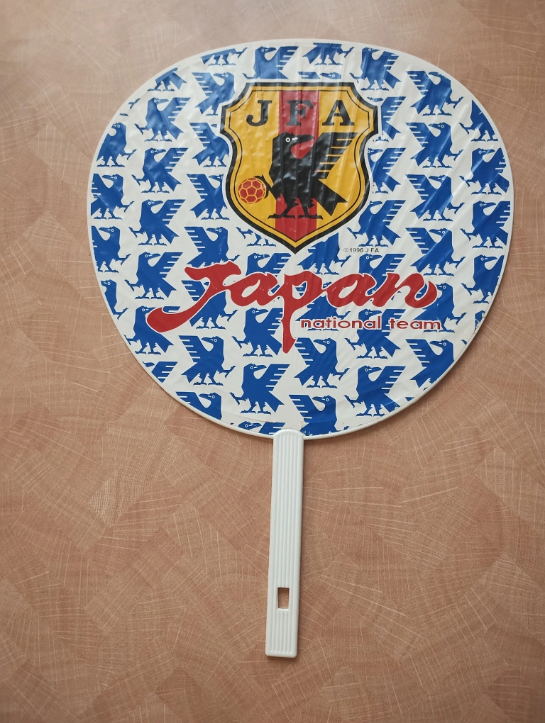 JFA 日本代表のうちわです ・デザイン:サッカー日本代表 ・年式:1996年 ・状態:使用感少なめ 少し大きめで、比較用に普通サイズのうちわとの写真を参考にしてください。