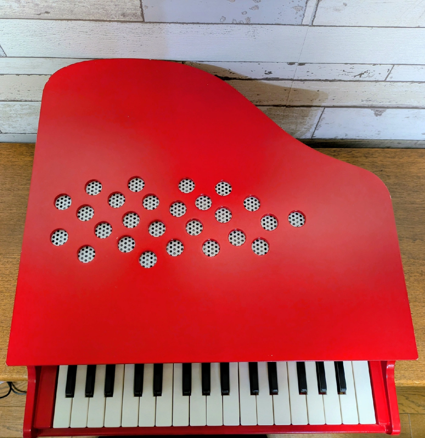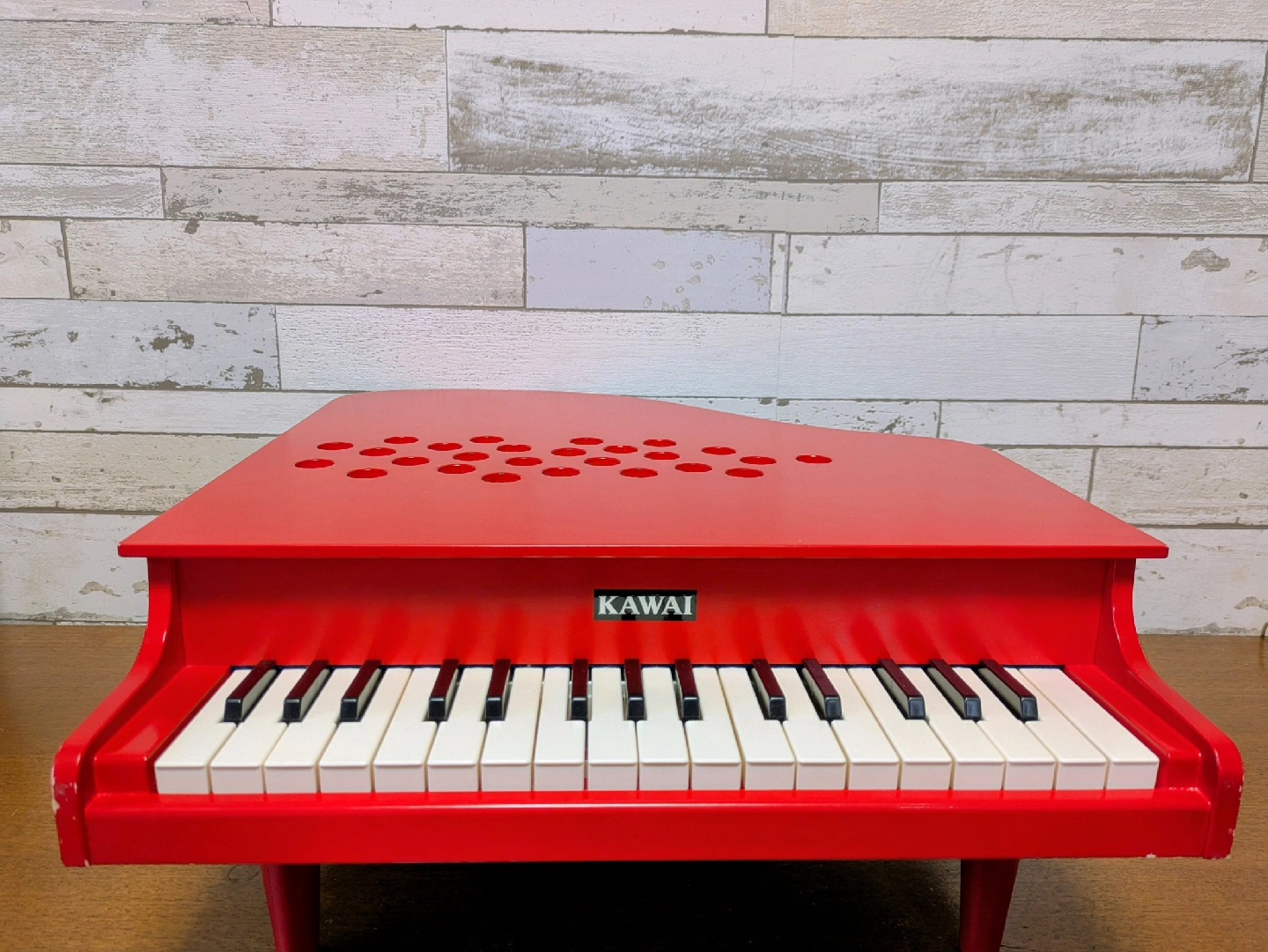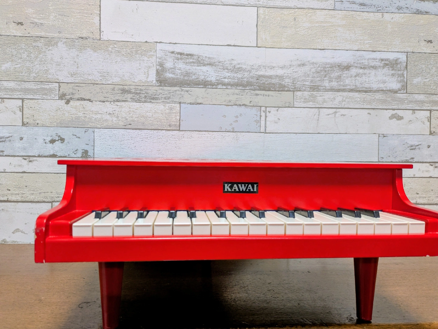 KAWAIのミニピアノです。 電池不要で、鍵盤をたたくと、よく響く鉄琴のような音がします。 木製で重く大きく角もあり、赤ちゃんや未就園児には適さない印象です。 これは大人(私)が使っていました。 概ねきれいですが、角に色がはげた箇所がいくつかあります。 定価 12800円 サイズ 42.50×18.50×45.00cm (結構大きく、重いです) 足は取り外しができます。