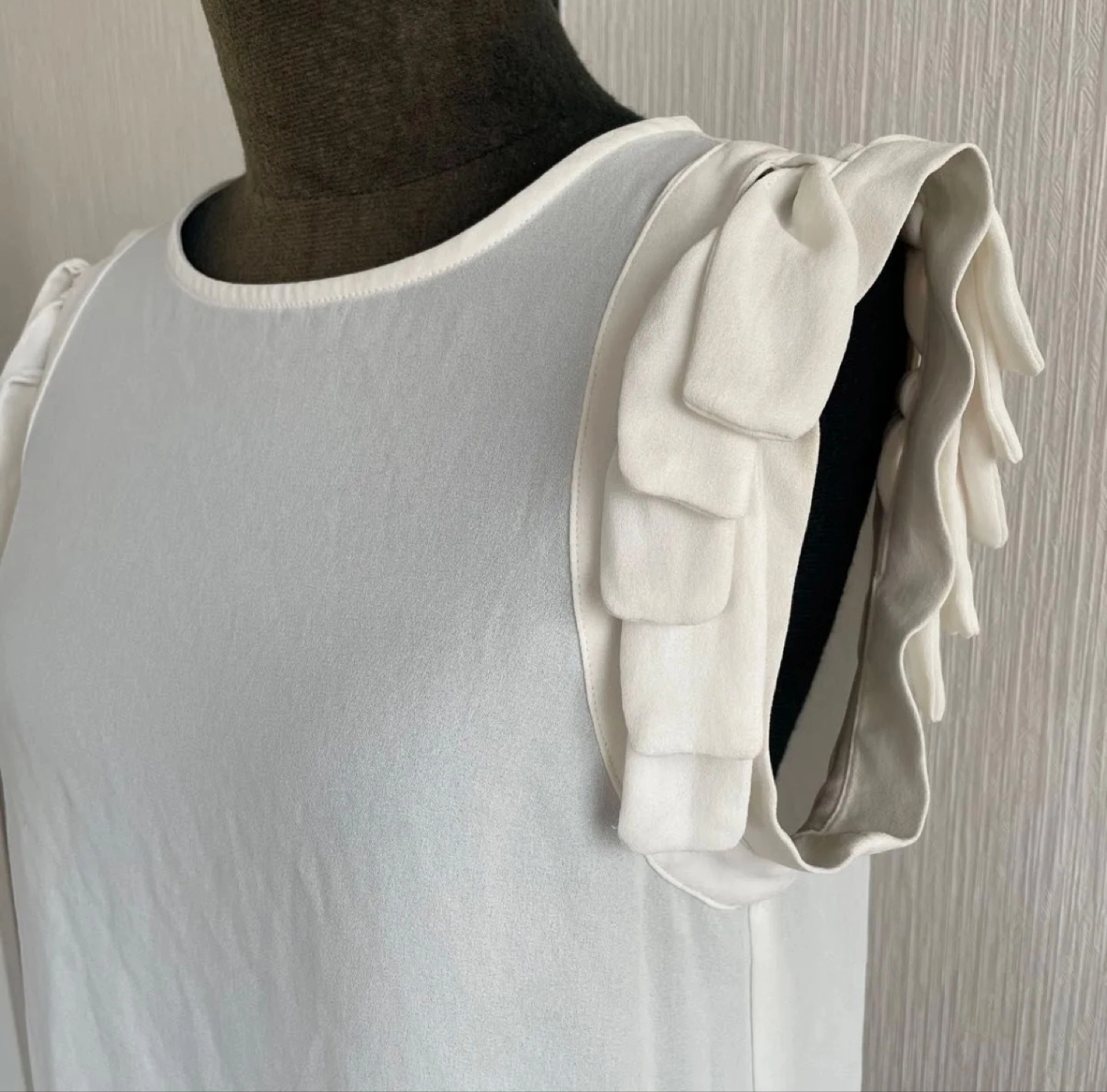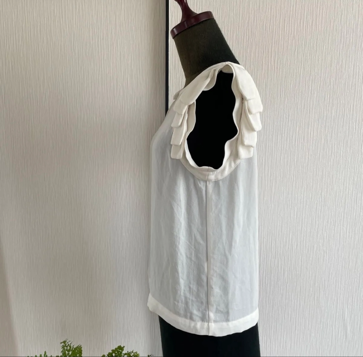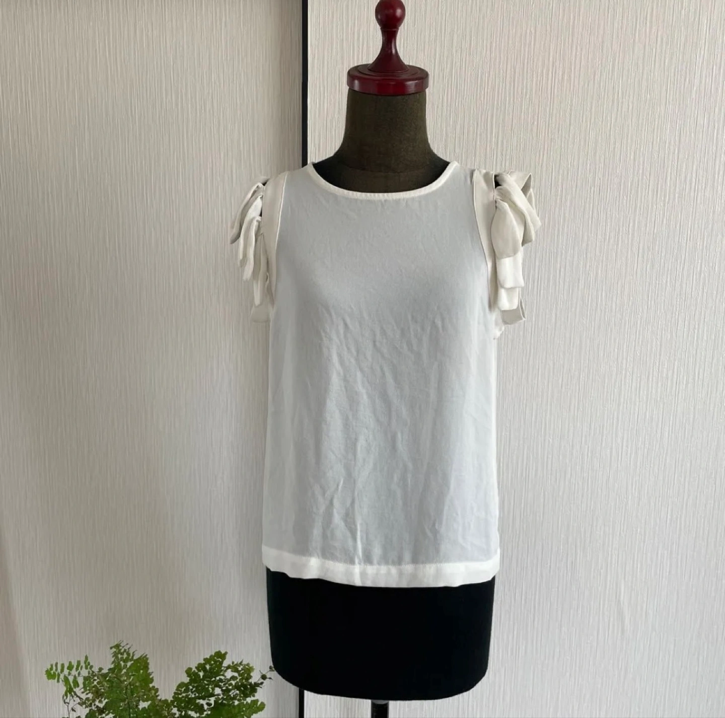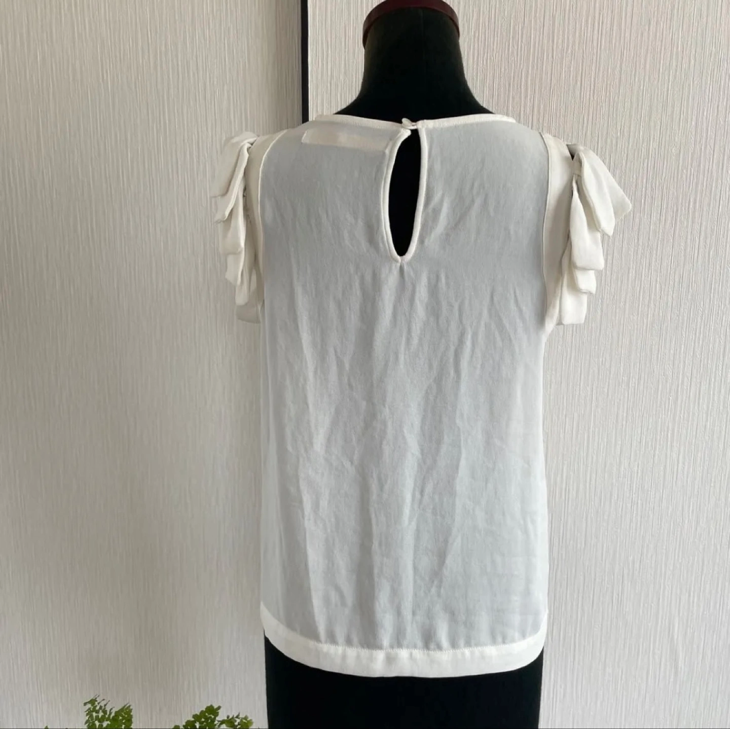 肩のリボンがとっても可愛いです。 フリルデザインのホワイトノースリーブトップス、カジュアルにもエレガントにも着こなせるデザインです。Mサイズ相当です。 - 色: ホワイト - デザイン: フリル付きノースリーブ - スタイル: カジュアル - 袖の形: ラウンドカット ご覧いただきありがとうございます。 注意事項:自宅にて保管していました。 中古品であるということをご理解いただきご購入をお願いします。