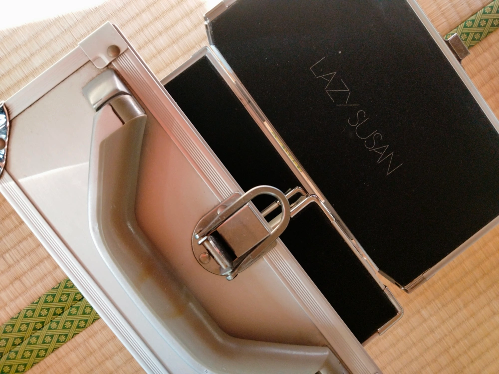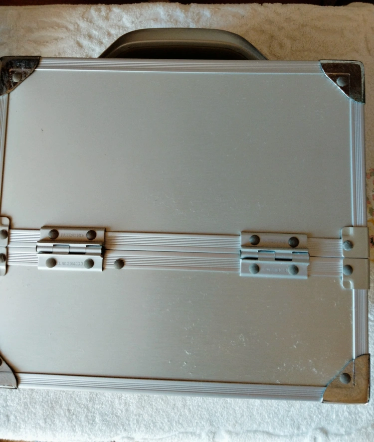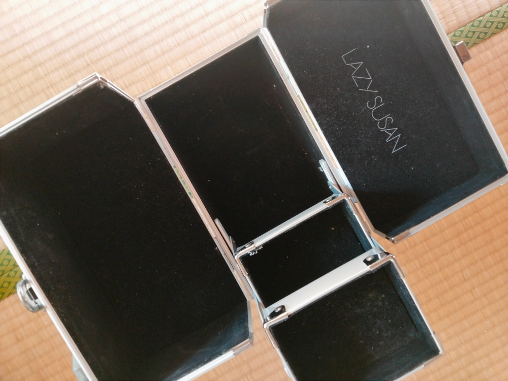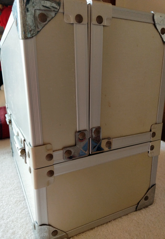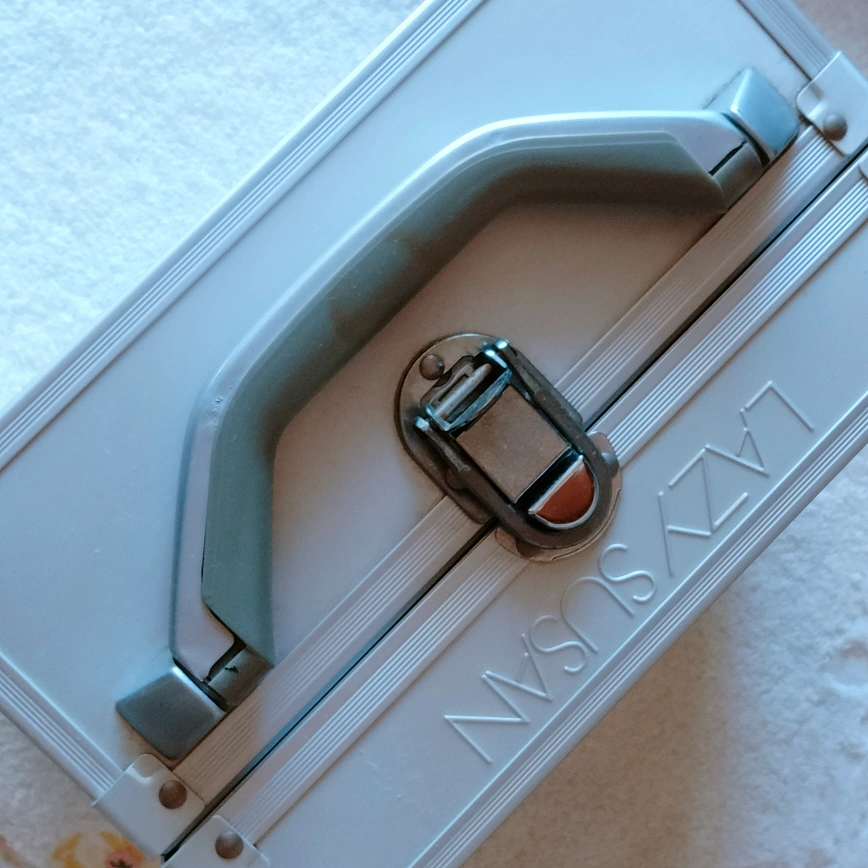 LASY SUSAMのメイクボックス。 プロ仕様なので、機能的でたくさん入ります。お高い物でしたが、長く自宅保管なので持ち手の樹脂部分が日焼けでシミがあります。中はメイク汚れなどなく、普通に綺麗な感じです。日焼け部は人によって感じ方が違うと思いますので、神経質でない方、細かい事にこだわらない方のみご検討下さい。※写真金具部分に傷のように見えるのは、周囲の物が写っているだけで、傷ではありません。 24✕14cm 高さ20cm