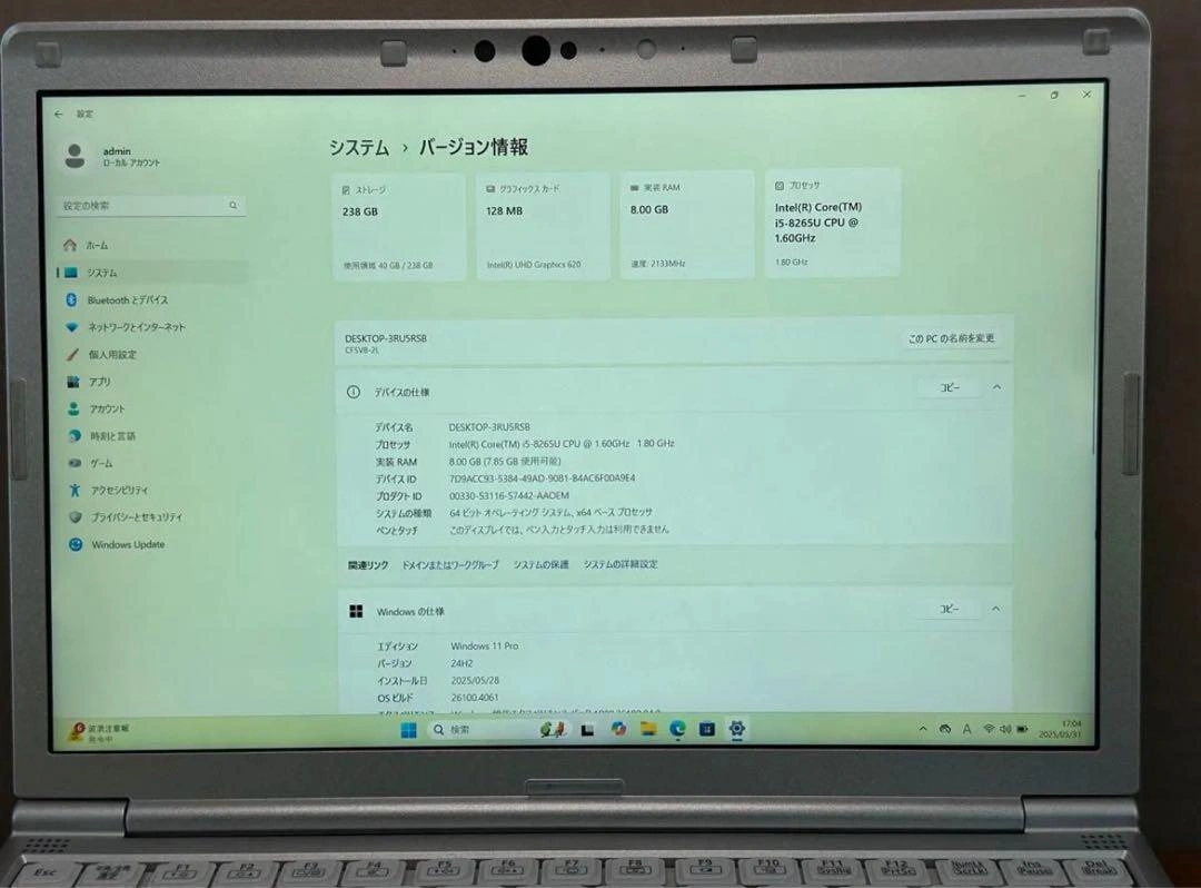 【商品名】 パナソニック Let's note CF-SV8 (78) 【商品説明】 ■スペック ・CPU: Core i5-8265U 1.6GHz ・RAM: 8GB ・ストレージ: 256GB SSD M.2 PCIe ・ディスプレイ: 12.5インチ ・顔認証 ・Webカメラ搭載 ・解像度: 1920x1200 ・OS: Windows 11 Pro ・Office付 ■状態 起動確認済品です。 色味はやや黄色っぽく感じます。 設定は全て完了しておりますので、すぐにご使用頂けます。 (本品は中古品なので、バッテリーの寿命は保証できません。ご理解の上でご購入下さい) ■外観状態 中古品ですので、使用に伴った擦り傷や汚れなどはあります。 商品の状態を写真でご確認ください。 ■付属品 本体、ACアダプタ、電源コード ■保証期間: 初期不良の場合、到着後7日以内にご連絡ください。 不明点がございましたら、ご購入の前にご質問をお願い致します。 ご検討よろしくお願いいたします。 パナソニック Win11搭載 Lets note CF-SV8 12.1インチWUXGA (1920x1200) 第8世代Core i5 ブランド:ー