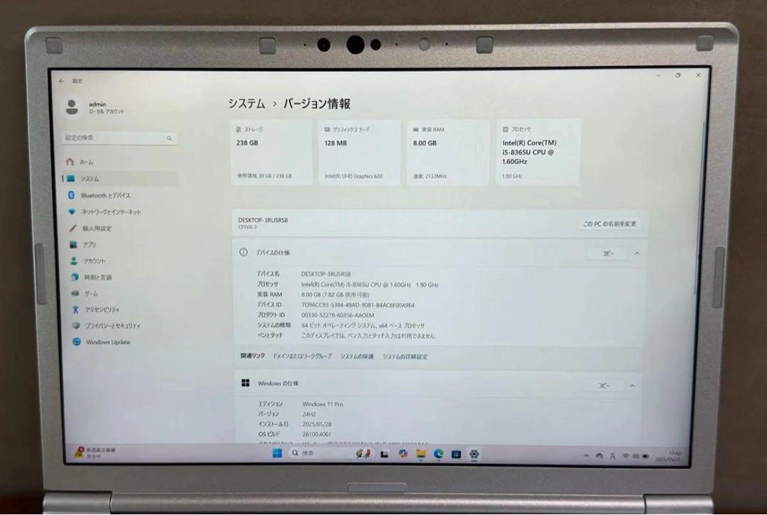 【商品名】 パナソニック Let's note CF-SV8 (80) 【商品説明】 ■スペック ・CPU: Core i5-8365U 1.6GHz ・RAM: 8GB ・ストレージ: 256GB SSD M.2 PCIe ・ディスプレイ: 12.5インチ ・顔認証 ・Webカメラ搭載 ・解像度: 1920x1200 ・OS: Windows 11 Pro ・Office付 ■状態 起動確認済品です。 設定は全て完了しておりますので、すぐにご使用頂けます。 (本品は中古品なので、バッテリーの寿命は保証できません。ご理解の上でご購入下さい) ■外観状態 中古品ですので、使用に伴った擦り傷や汚れなどはあります。 商品の状態を写真でご確認ください。 ■付属品 本体、ACアダプタ、電源コード ■保証期間: 初期不良の場合、到着後7日以内にご連絡ください。 不明点がございましたら、ご購入の前にご質問をお願い致します。 ご検討よろしくお願いいたします。