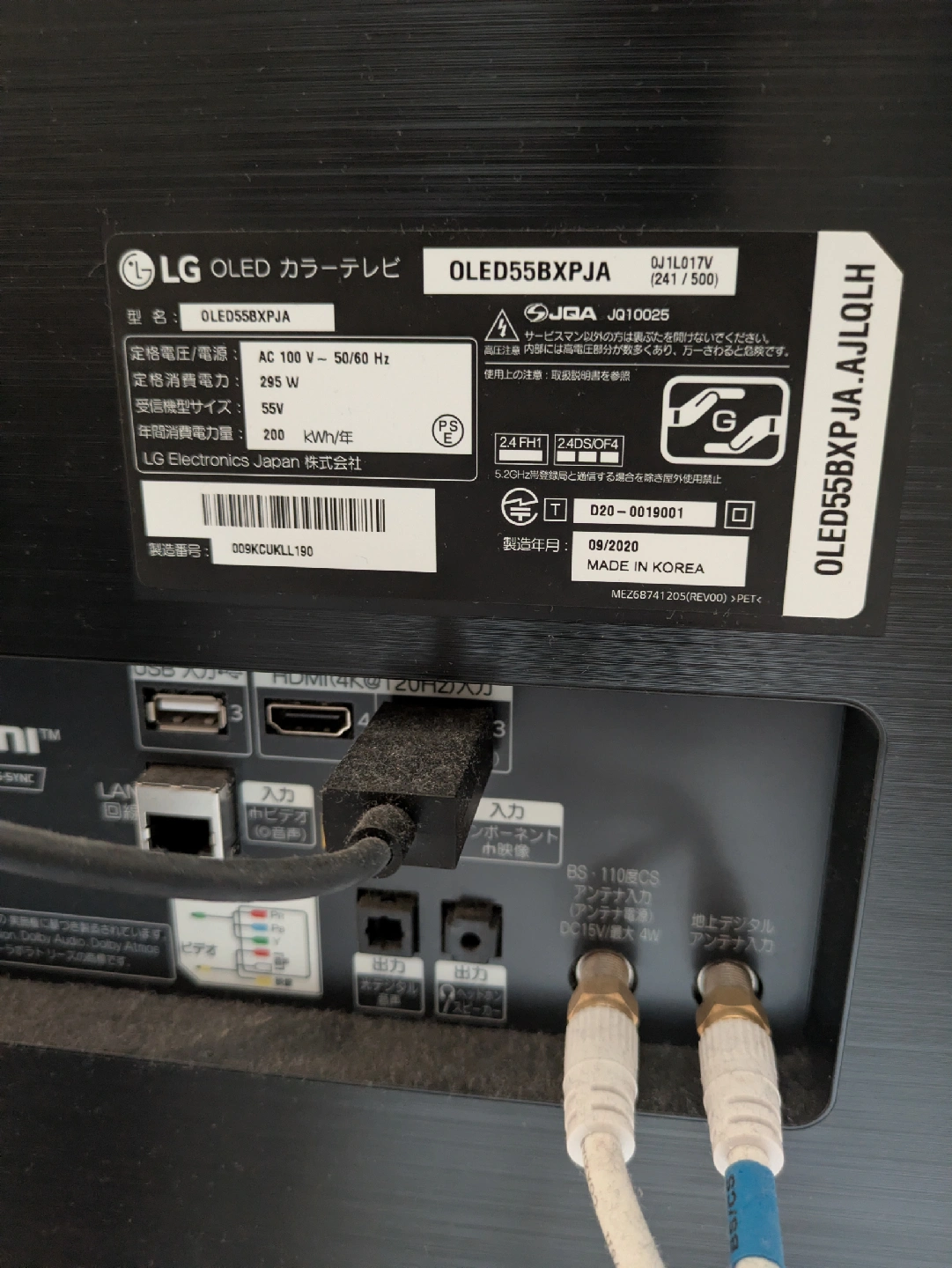 LGの55インチ有機ELテレビです。 台も一緒にお譲りします。(プレステは含みません) 【情報】 ブランド:LG 型番:OLED55BXJA サイズ:55V型 年式:2020年製 【状態】 傷あり 液晶の一番上の部分が映らなくなっています。端なので気になりにくいですが、ご了承の上お取引ください。 それ以外の部分は特に問題ありません。 【引き渡し方法】 台車に乗せて引き渡し場所までお持ちします。 近所(ハートアイランド内)の方はご自宅近くまでお持ちできるかもしれませんのでご相談ください。 OLEDは非常に壊れやすいそうなので、運搬にはご注意ください。