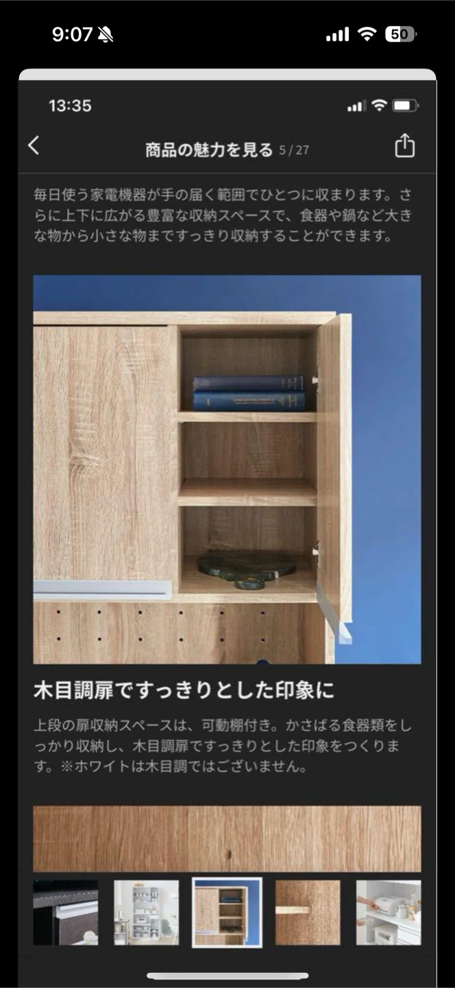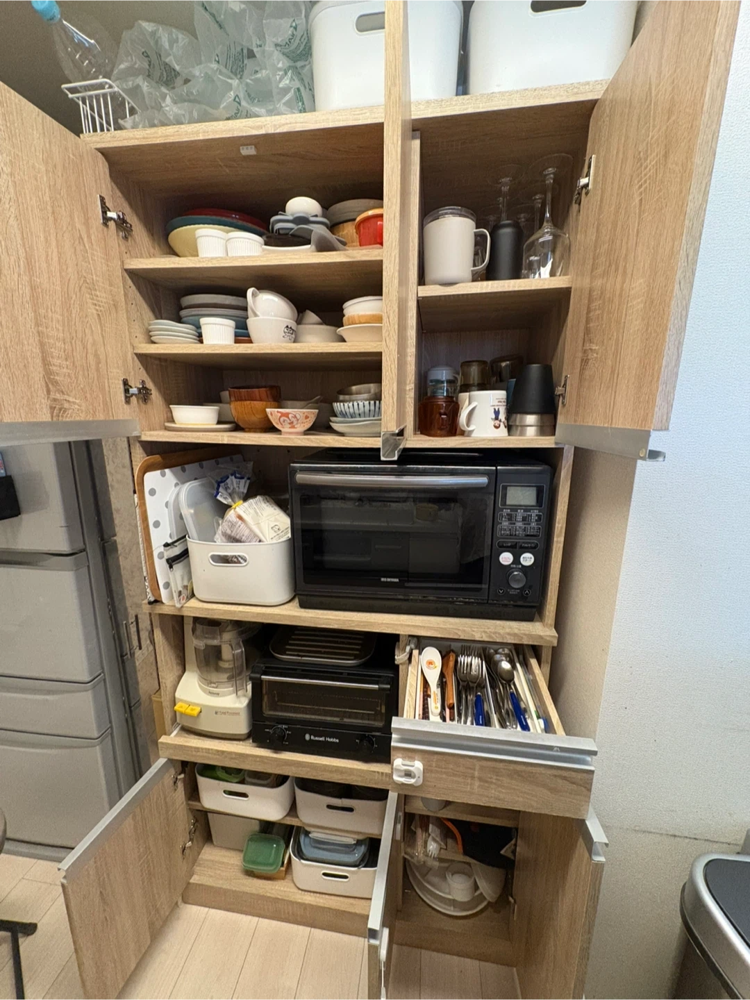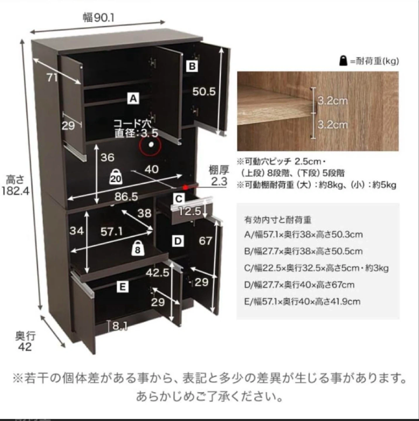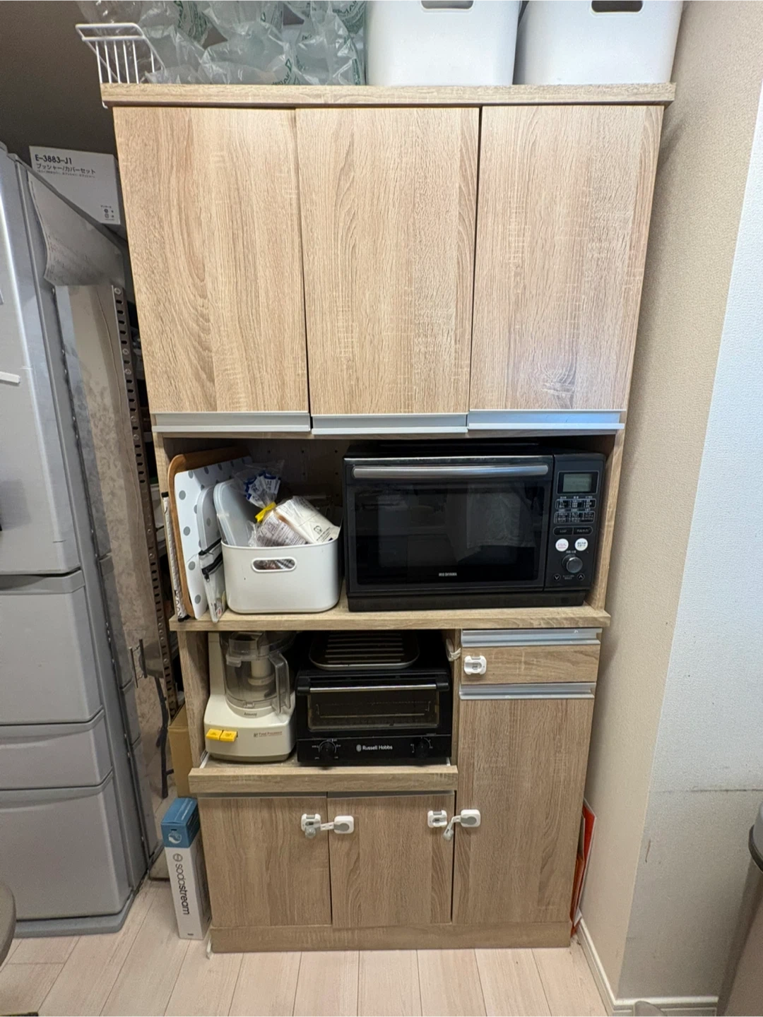 LOWYA木目調 食器棚 上部キャビネット付き 4年ほど使用しましたが、目立つ傷や汚れはなく問題なく使えています。引越しに伴い出品します。 お引き渡し希望時期 10/20〜24 それ以外に希望日があればご相談ください。 【情報】 サイズ: ・高さ 約182cm ・幅 約90cm ・奥行 約42cm 素材:プリント紙化粧繊維板、プリント紙化粧パーティクルボード 耐荷重: ・固定棚(1段目):約7kg ・固定棚(2段目):約20kg ・スライド棚(3段目):約8kg ・可動棚(上下段):各左右 約8kg ・可動棚(上下段):各右 約5kg ・引き出し:約3kg 中古品であることご了承ください
