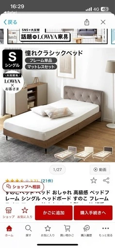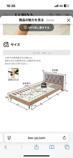 LOWYAで購入したベッドフレームです。 (マットレス等他のものは付属しません) 気に入っていましたが、引越しに伴い出品することになりました。 使用期間は2年程度です。目立った汚れは無いです。 自宅マンションまで来ていただき解体+搬出まで可能な方、よろしくお願いいたします。 (今まで引越し業者様に解体組み立てをお願いしておりました。ネジが1つ足りないかも?と言われた事がありますが、どの部分かわかりません。普通に使用できていました。見に来ていただいてキャンセルでもかまいません。現状優先でお願いします。) ご希望の方はお気軽にご連絡ください。
