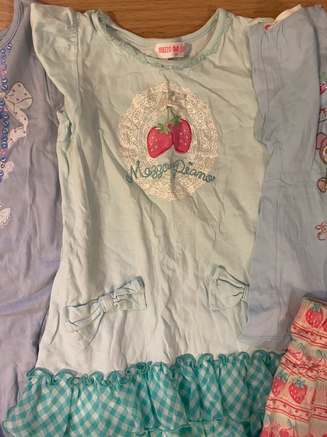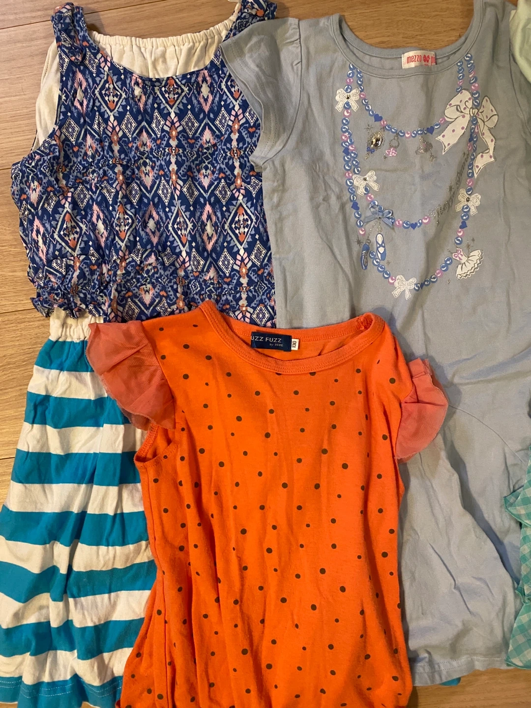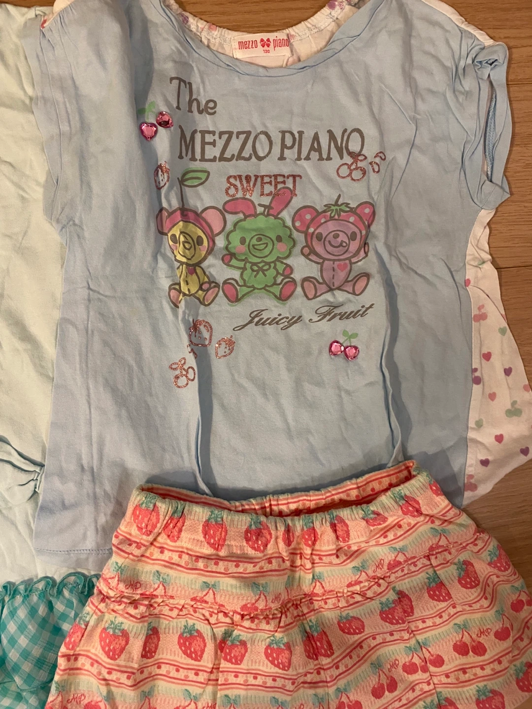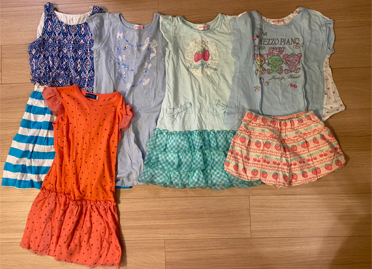※2週間くらいで出品を取りやめる予定です。 質問ある方はお気軽にコメントください。 全て130cmのサイズでmezzo pianoのワンピース2点、Tシャツとショートパンツ、その他のメーカーのワンピース2点です。