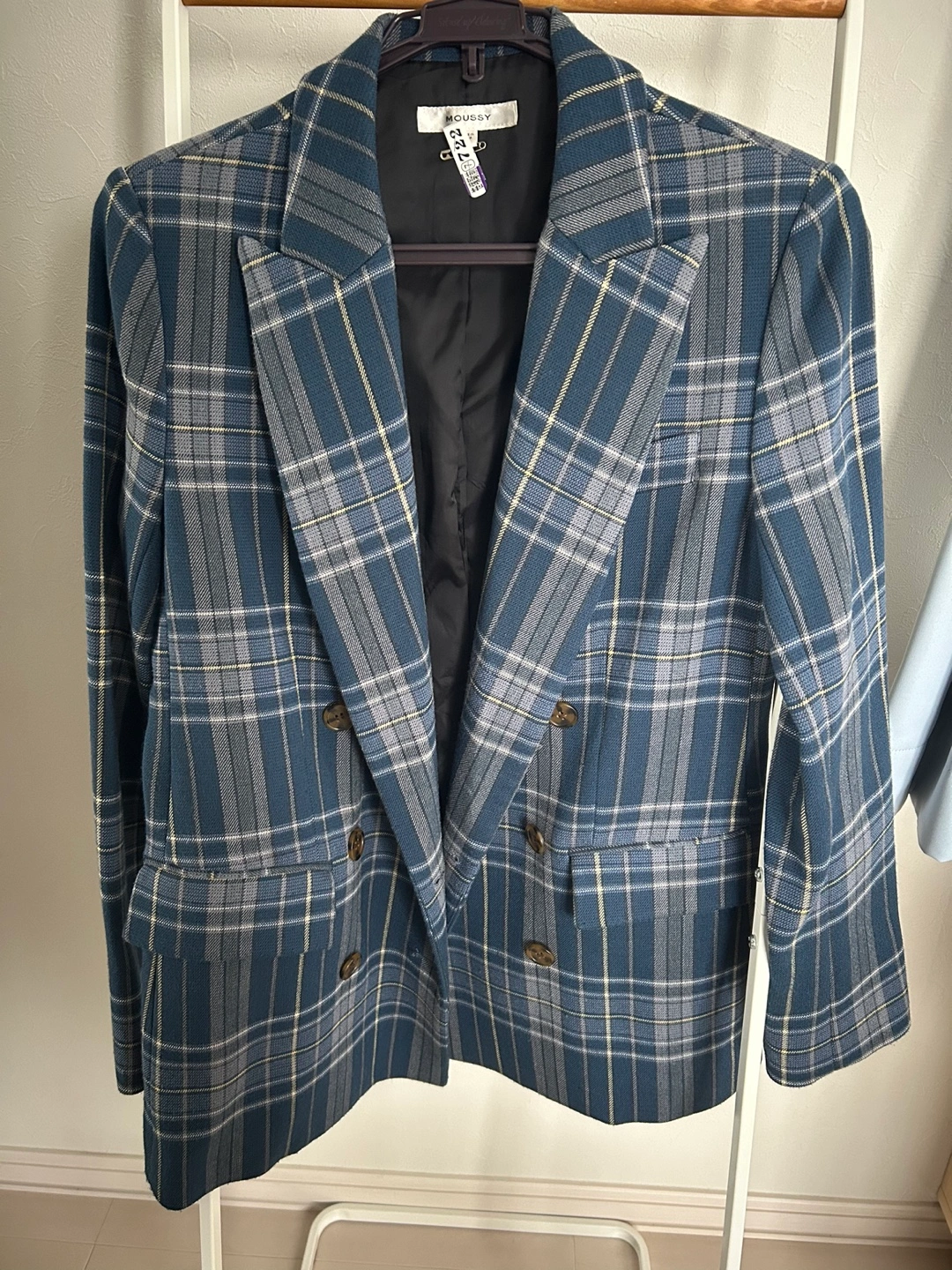 moussy CHECK DOUBLE JACKET ネイビー 定価税込15,984円 ほとんど着ずにクローゼットに眠っていました💤 クリーニング済 中はTシャツ、ロンT、ブラウス、何を合わせてもかっこよく決まる商品です! ワイドパンツやギャザースカート等ボリュームのあるボトム合わせでもバランスよく着こなせます☺︎ ⚠️こちらの商品は、下北沢駅、笹塚駅、経堂駅、いずれかでお渡しできればと思っています。