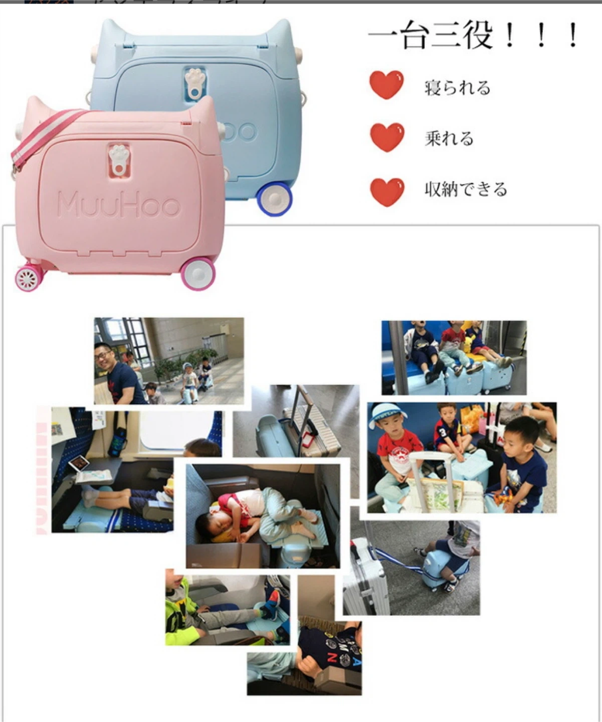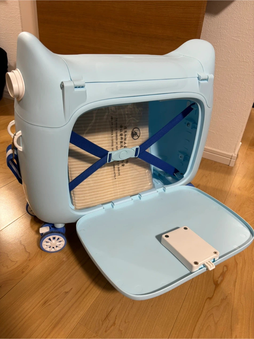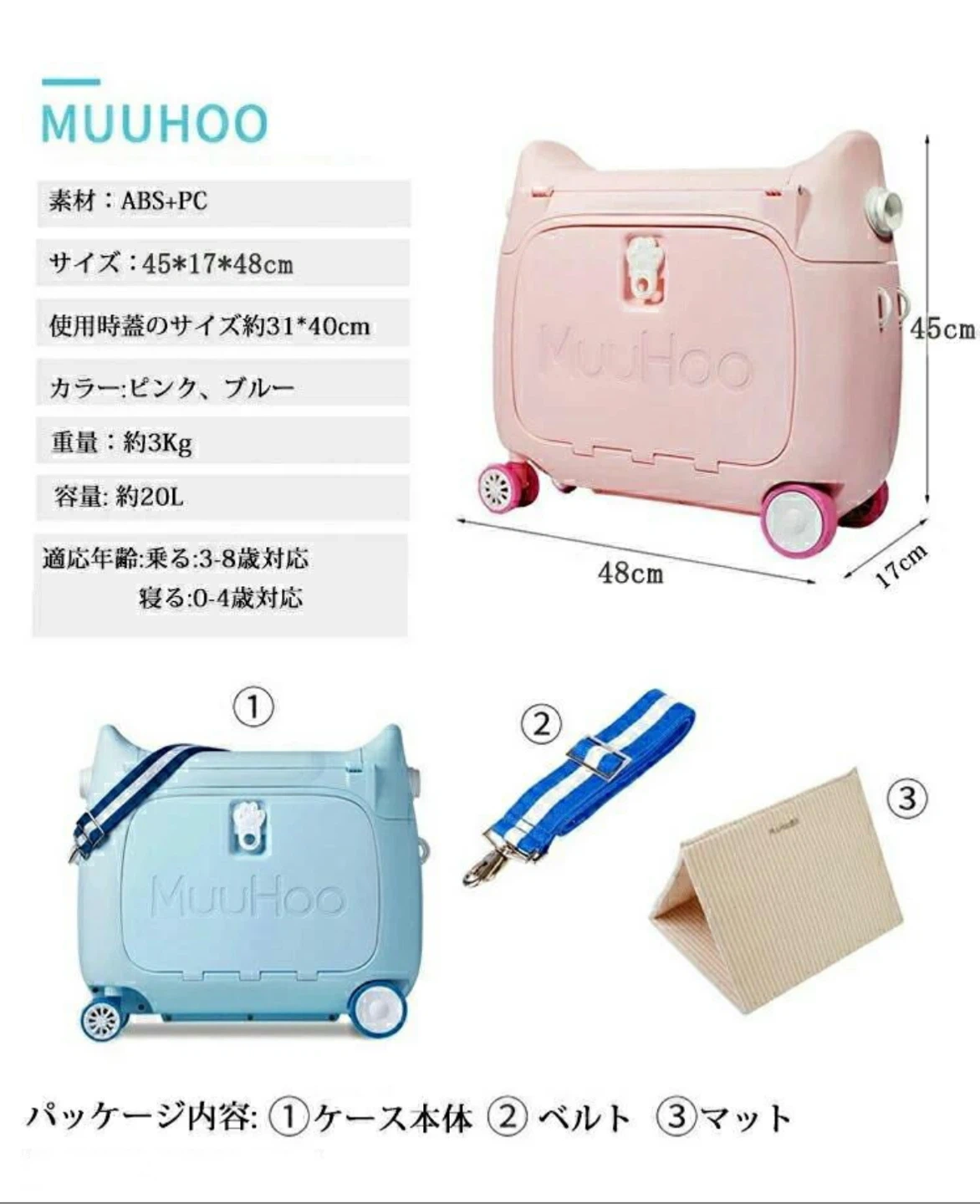 子供用スーツケース乗れる キッズキャリーケース ブルー 1回のみ、国内旅行で使用しました。 マットは未使用。ビニールも開けていません。 子どもの成長に伴い必要なくなりましたので、お譲りします。 機内では小さな赤ちゃんや0歳から8歳までのお子さまに、ライドオンとしては3歳以上のお子さまに使用できます。 多くの航空会社で使用可能です。 【製品スペック】 重さ:2.5kg 容量:20リットル 外形:長さ50x幅20x高さ45cm 開口寸法:34*23 cm パッケージ内容:スーツケース*1、ベルト*1、マット*1 【対象年齢:0~8歳頃(体重50kg)まで】 1、ベッドとして使用される場合 年齢:0~3歳頃まで 身長:70-100cm 2、レッグレストとして使用される場合 年齢:2~8歳頃まで 身長:100~130cmまで 体重:35kgまで 3、ライドオンスーツケースとして使用され場合 年齢:3~8歳頃まで 身長:115~130cm 体重:50kgまで