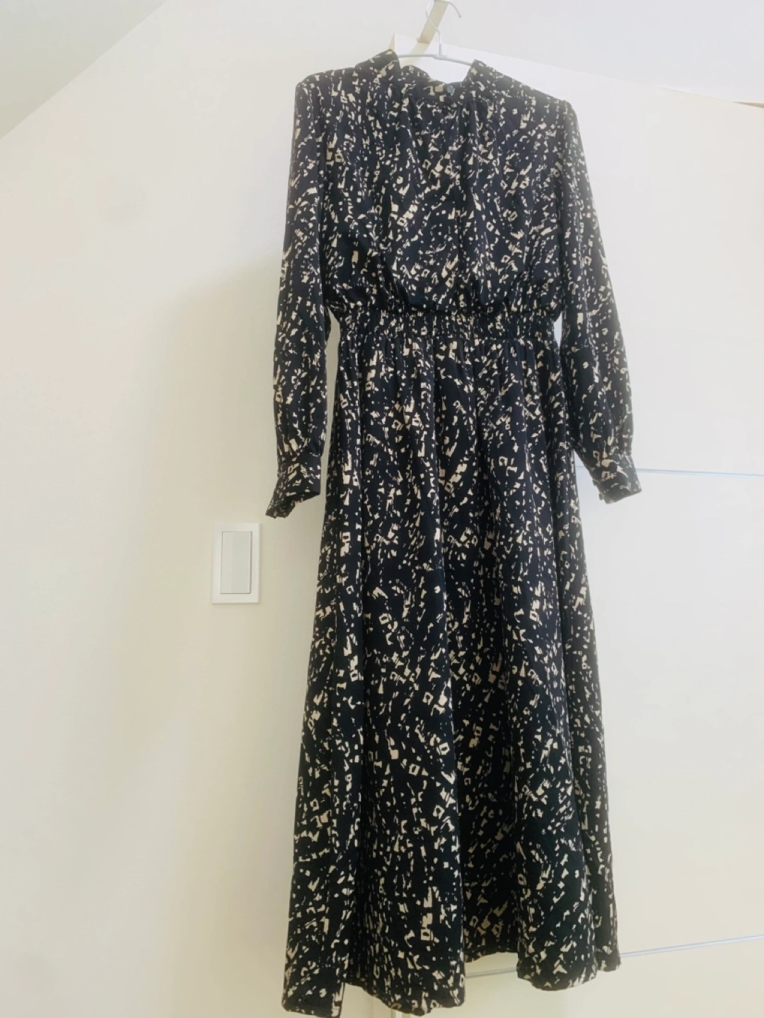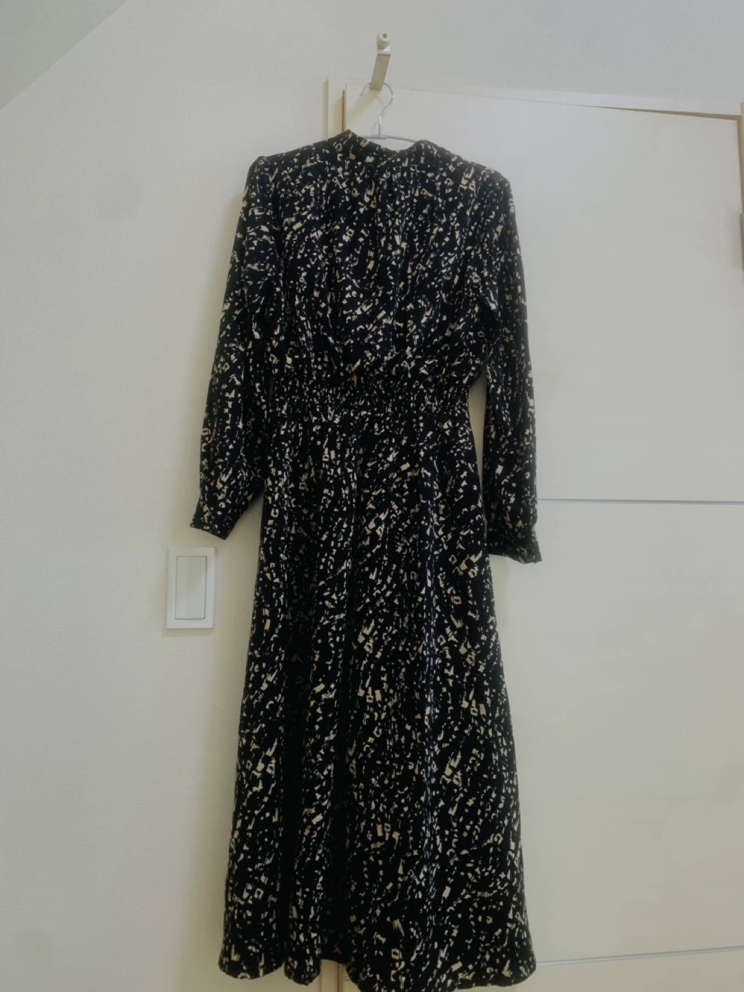 まだ状態の良い長袖ワンピースです 秋口などいかがでしょうか かっこいい感じのワンピースです(^^) ・ナチュラルビューティーベーシック ・サイズM ・黒地にベージュの模様 ・汚れシミなし ・裏地付き✨ ・ポリエステルで、雨の日にも乾きやすい ・膝も隠れて大人っぽく ・ウエストゴム 158cmで足首少し上位のロング丈 黒でもベージュ、茶色、色物の靴でも合わせやすかったです(^^) ※右裾の方に1箇所ほつれ見つけましたが、 柄の為目立たず、その他未使用時と変わらない状態です