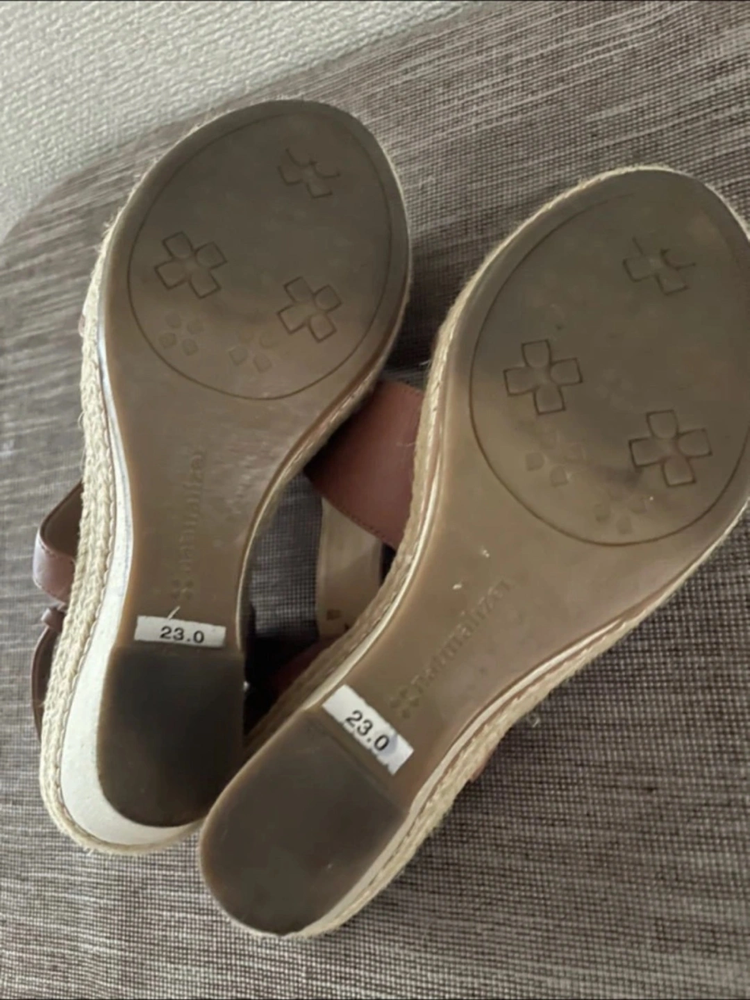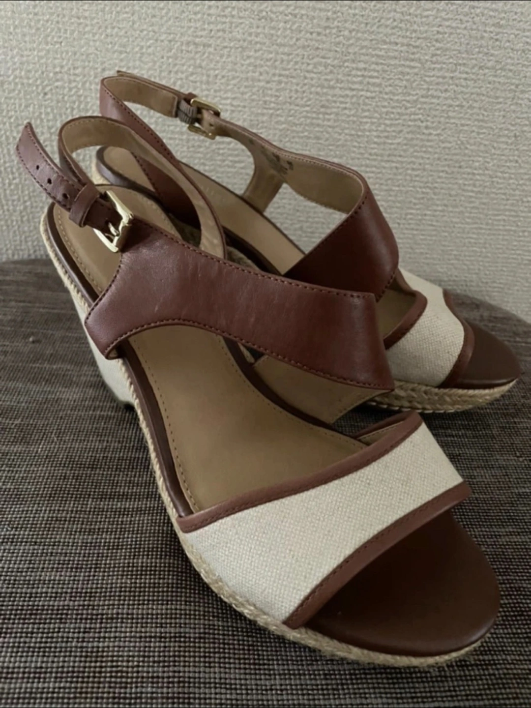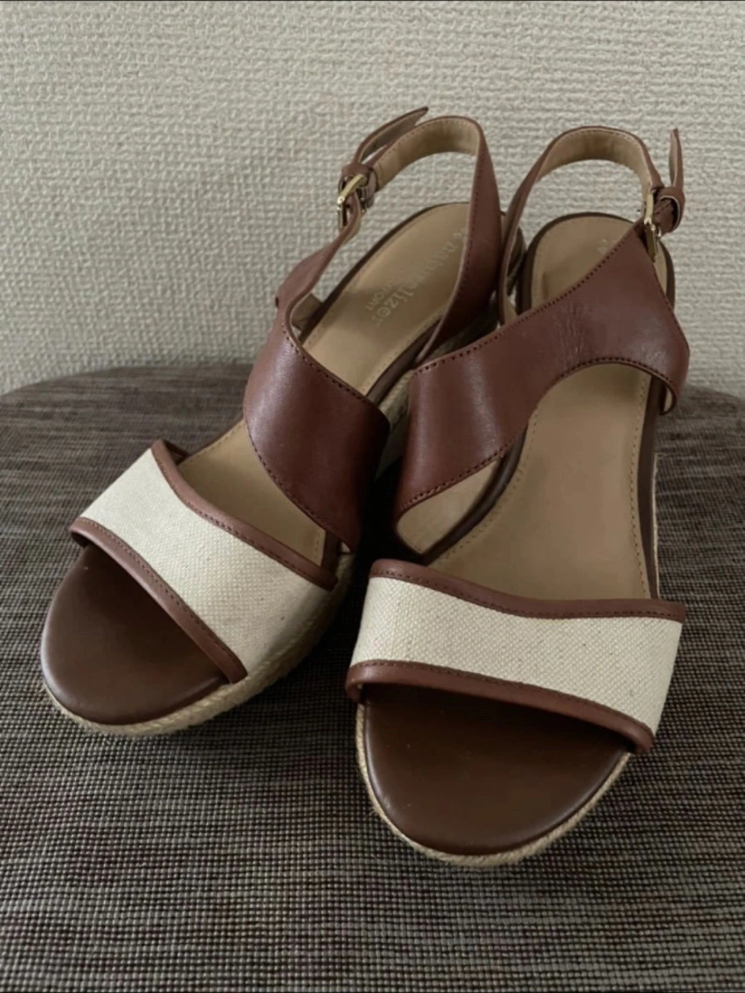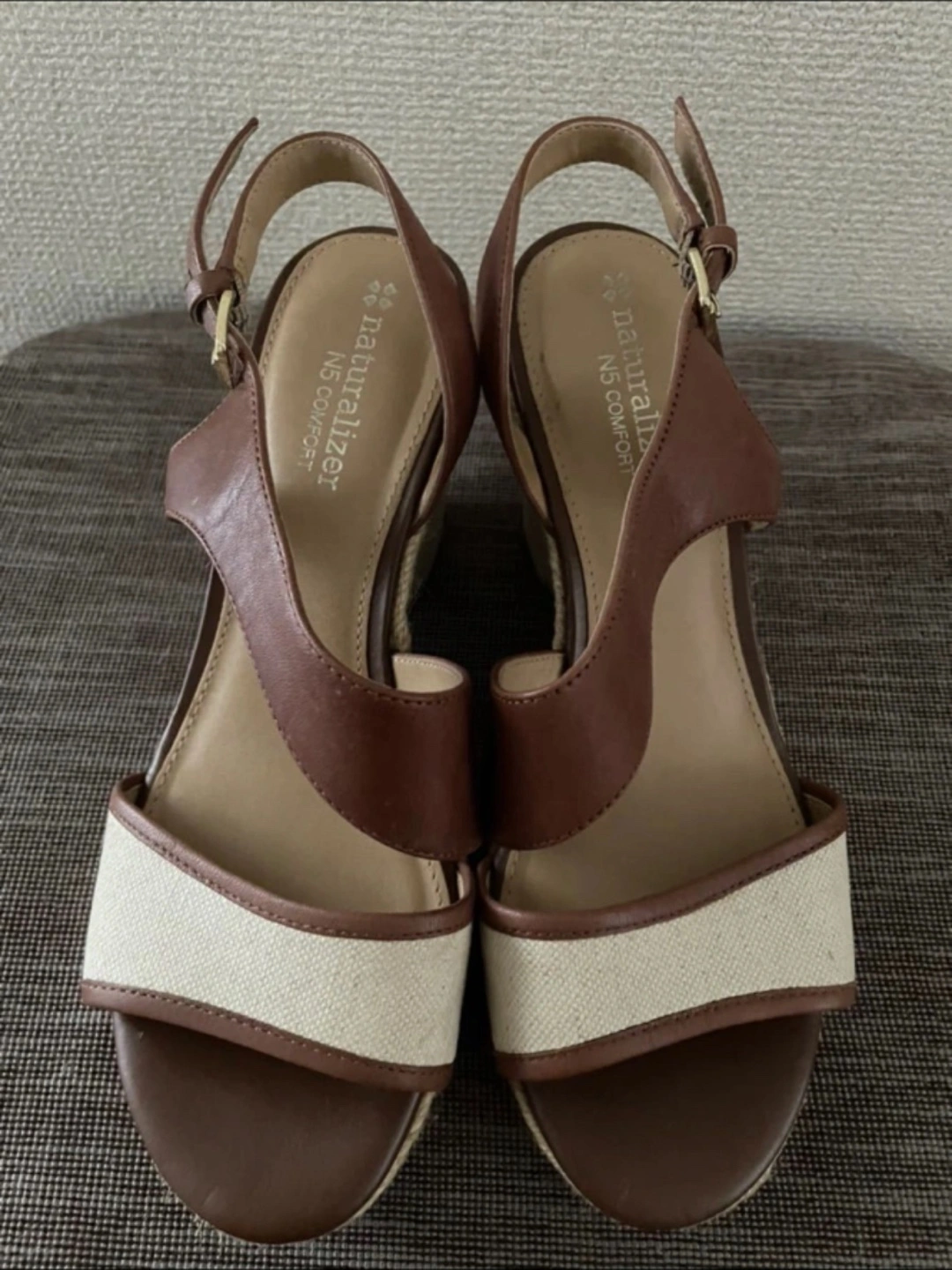 ナチュラライザーのブラウンと生成のシンプルなサンダル ヒール約9.5cmですが、全体的に2.5cmほど底上げされていますので、履き心地は安定しています。 サイズ23cm (箱は23.5記載) 傷、汚れは写真でご確認ください。ほとんど着用していませんので、綺麗な状態です。 引き渡し場所、ご確認ください。 三軒茶屋駅より距離があり、徒歩かバスになります。
