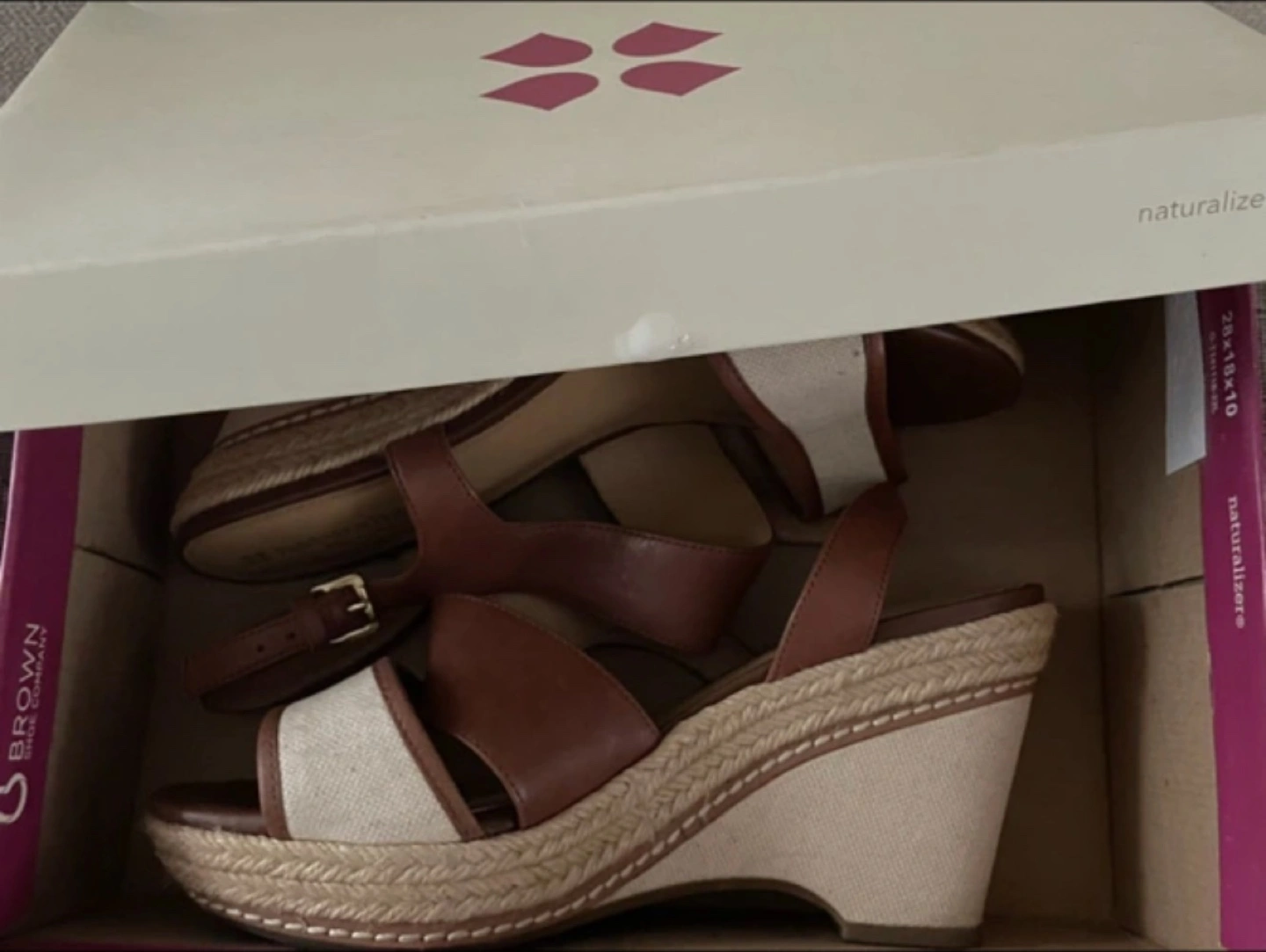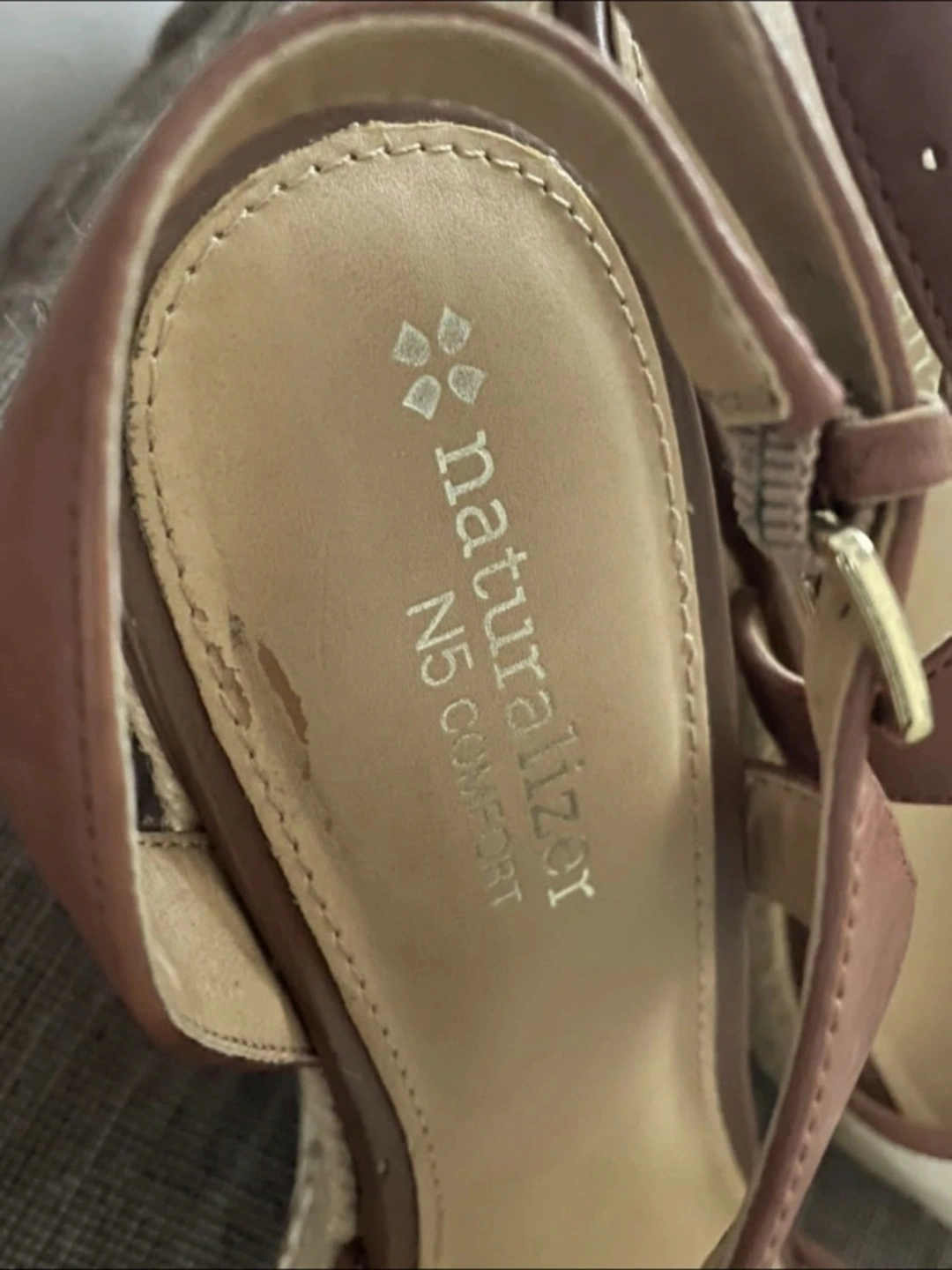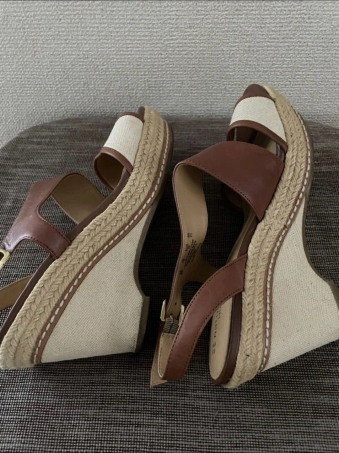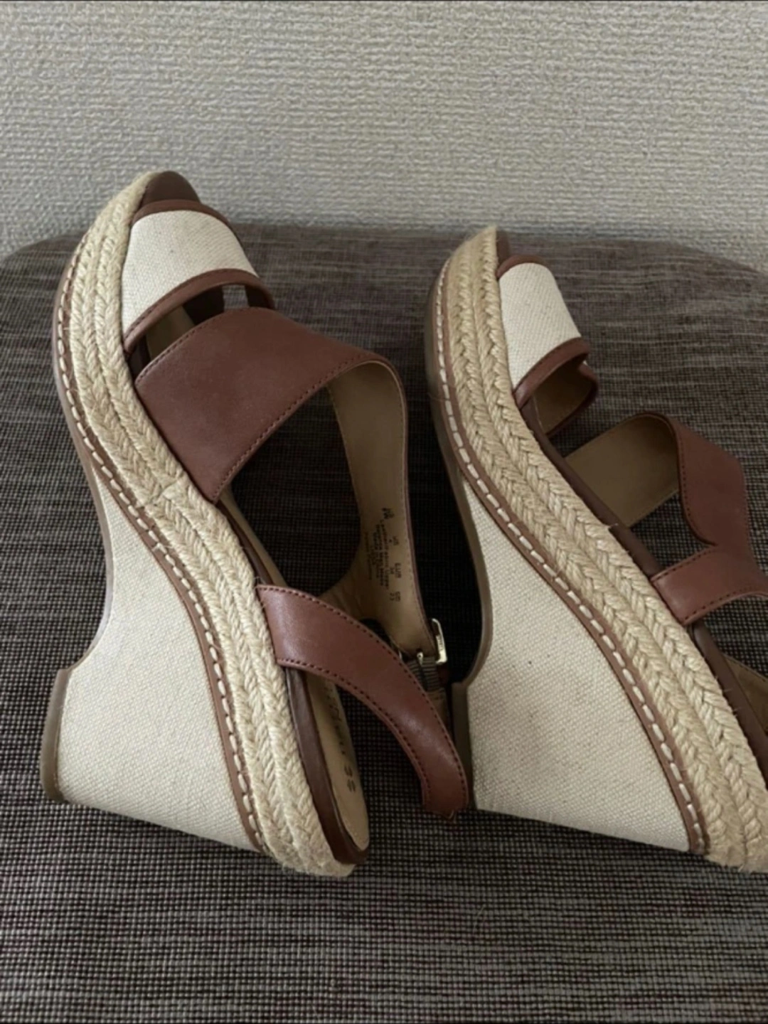 ナチュラライザーのブラウンと生成のシンプルなサンダル ヒール約9.5cmですが、全体的に2.5cmほど底上げされていますので、履き心地は安定しています。 サイズ23cm (箱は23.5記載) 傷、汚れは写真でご確認ください。ほとんど着用していませんので、綺麗な状態です。 引き渡し場所、ご確認ください。 三軒茶屋駅より距離があり、徒歩かバスになります。