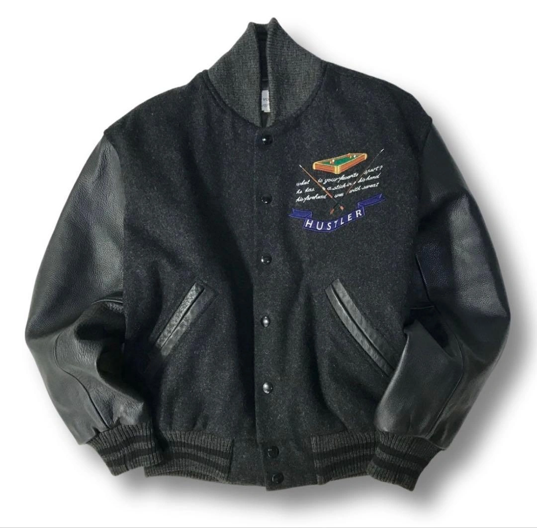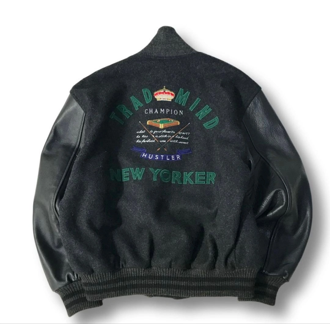 NEW YORKERのスタジャンです。 伝説の証「HUSTLER」刺繍と日本製。 ボディには上質なウール90%の極厚メルトン生地、袖には光沢と耐久性に優れた牛革(カウハイド)を使用。 内側は中綿入りのキルティング裏地です。 ●ブランド NEW YORKER ●カラー ブラック ●素材 ボディ:毛90/ナイロン10【袖】牛革 ●サイズ表記 M ※ブランド、年代によってサイズ感は変わりますので必ず下の実寸をご確認ください。 ●平置き実寸(㎝) 着丈:60 身幅:60 袖丈:57 肩幅:54 裄丈:- 手作業での採寸になりますので多少の誤差はご了承ください。 良品ですが、USED品にご理解のある方のみご検討ください。 #スタジャン #NEWYORKER #ニューヨーカー #バーシティジャケット #レザースタジャン #袖革 #牛革 #カウハイド #日本製 #MADEINJAPAN #大同毛織 #メルトン #ヴィンテージ #古着 #古着男子 #アメカジ #ストリートファッション #アウター #ブルゾン #Mサイズ #ブラック #HUSTLER #ビリヤード #刺繍デザイン ご希望の方はお気軽にご連絡ください。