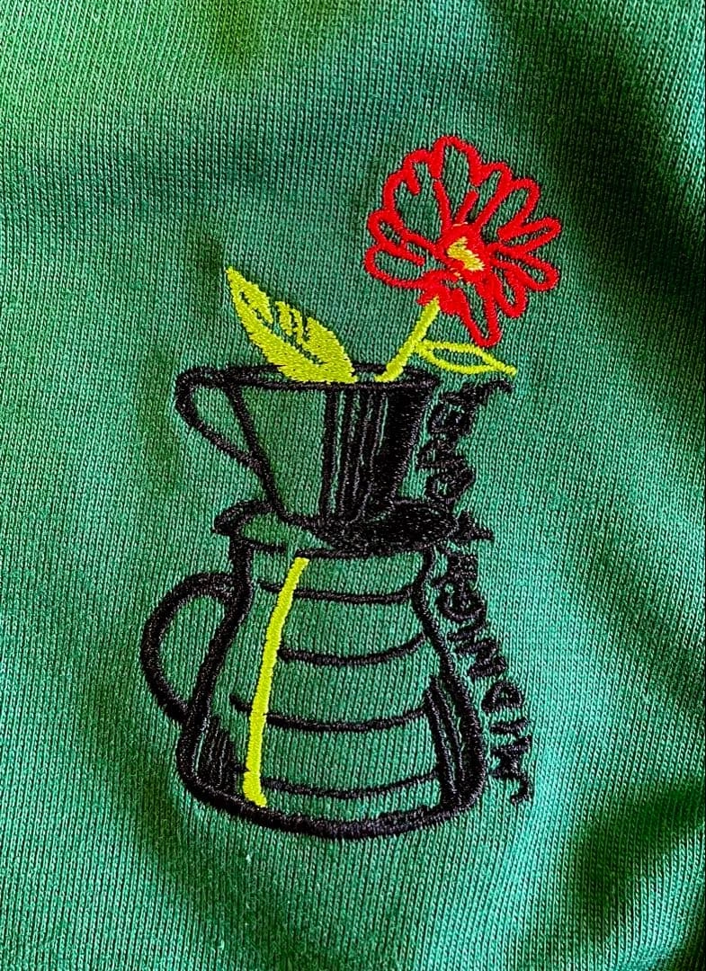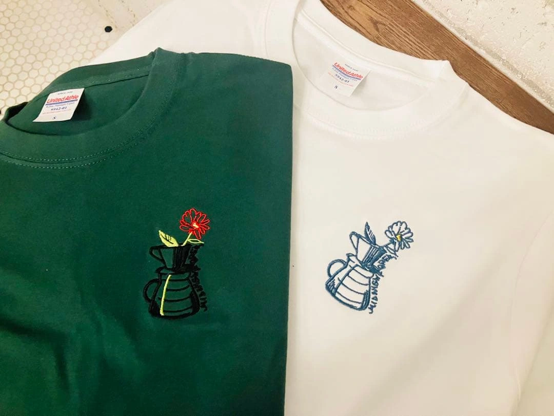 あたたかさ花とコーヒーサーバーの刺繍が施されたTシャツです。 ボディは鮮やかなグリーンで、心地よく着こなせるよう随所にこだわりを感じます。 material:Cotton 100% brand:MIDNIGHT BREW size:L color: みどり ご希望の方はお気軽にご連絡ください。