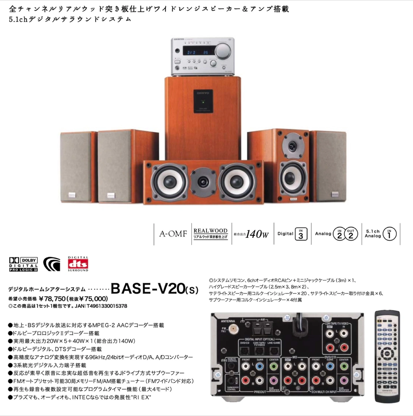 ブランド:オンキョー 型番:BASE-V20(S) 【付属品】 システムリモコン 5.1 サラウンドシステム 1枚目の写真がメインシステムです サラウンドシステムアンプ+ FMチューナー 2枚目の写真のDVDプレイヤー+カセットデッキ カセットデッキはオートリバース付き リアSP2台はスタンドが付属 稼働状態は、ボリュームのガリが時々出ますが ボリュームを回転させることによって解消します それ以外の不具合はありません 詳細は以下のURLをご参照ください http://153.127.244.43/pdf/2012-11-16/12980.pdf